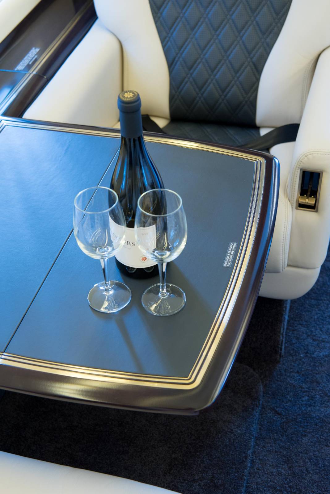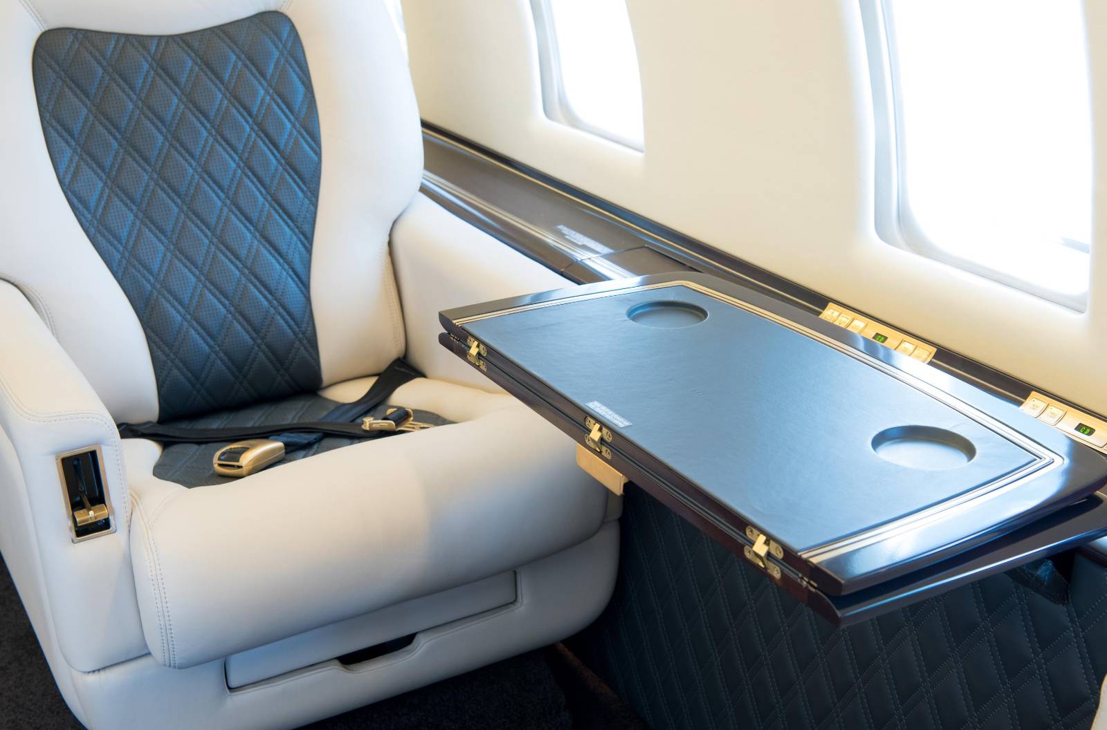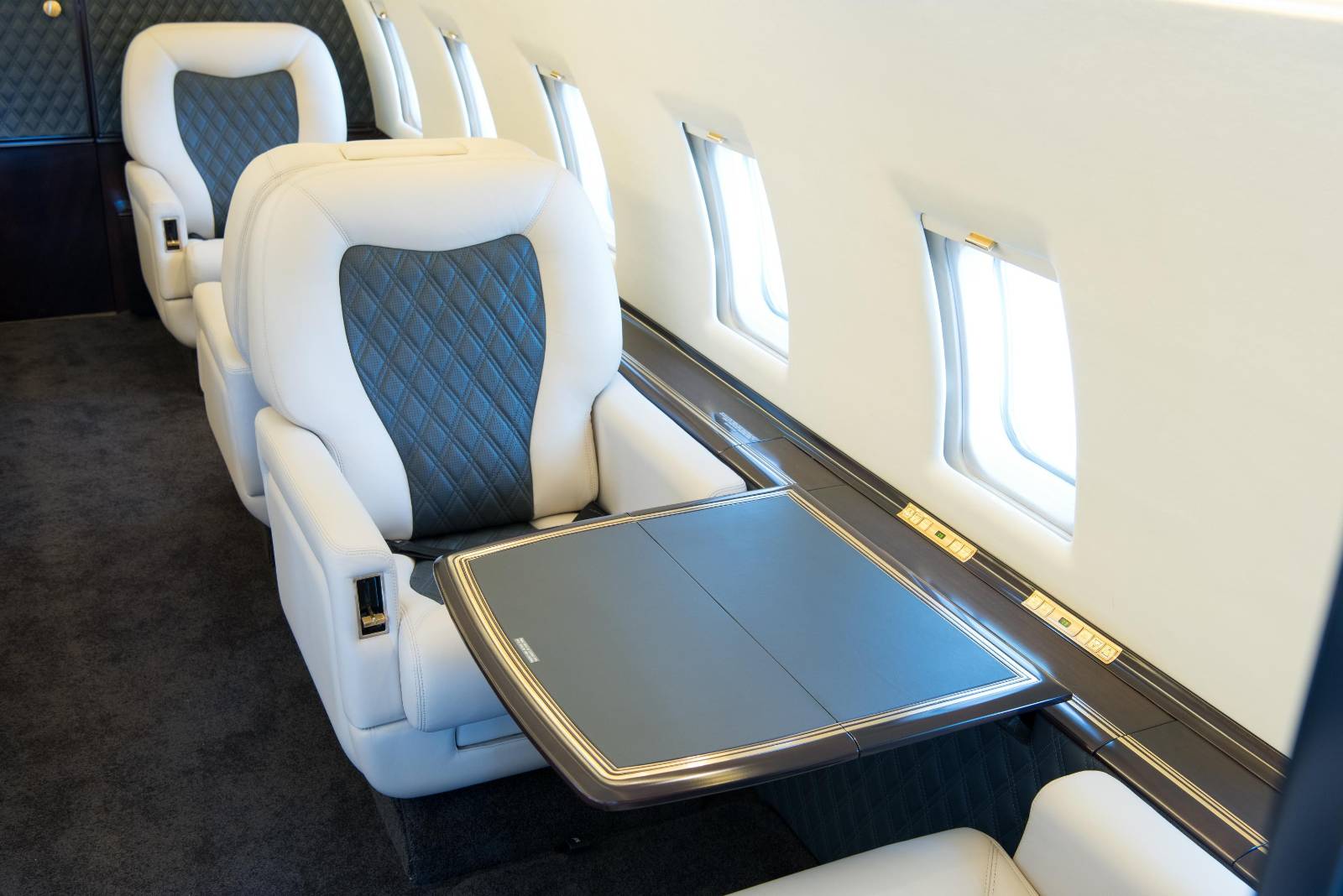 - The tray table inlays were covered in charcoal leather.