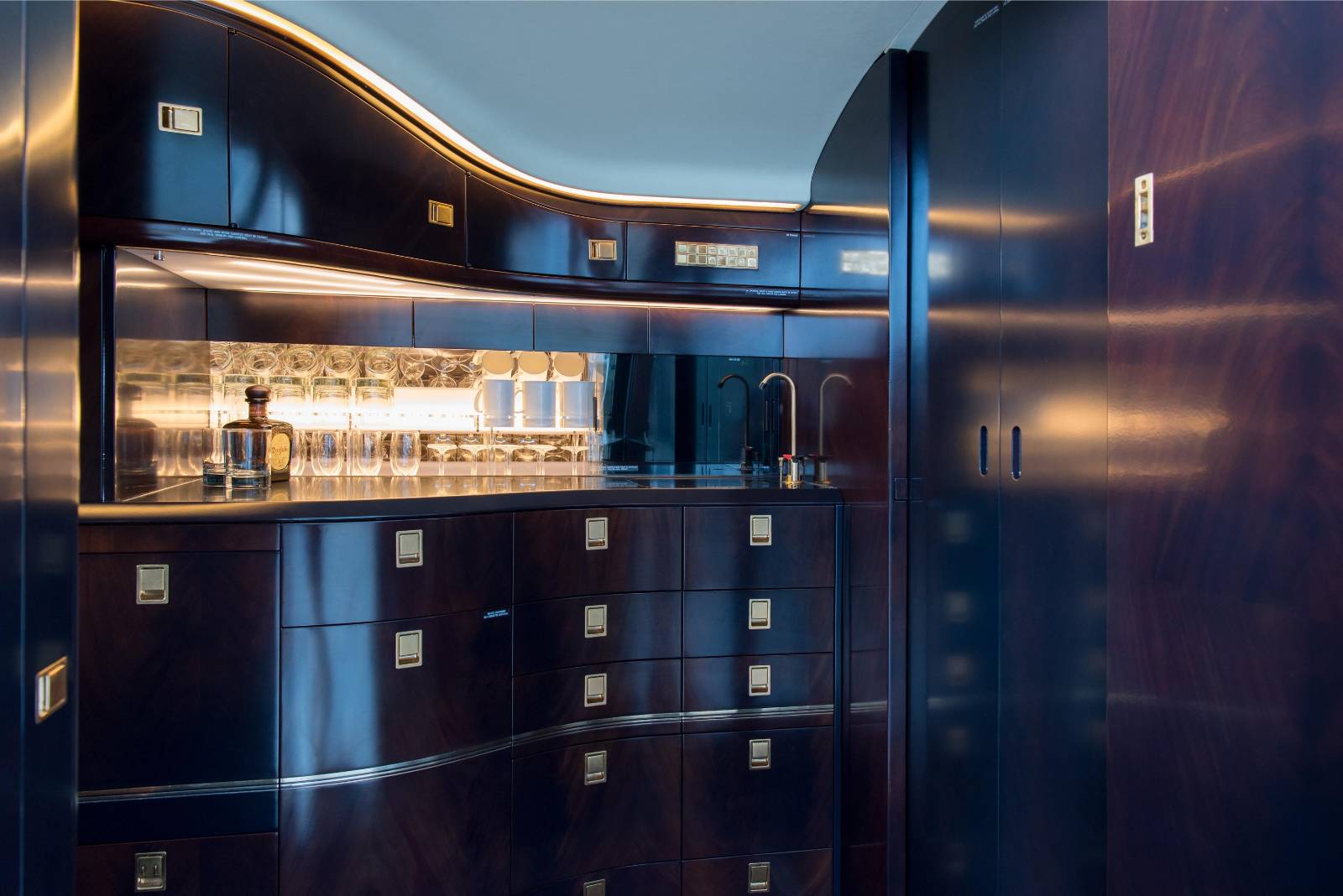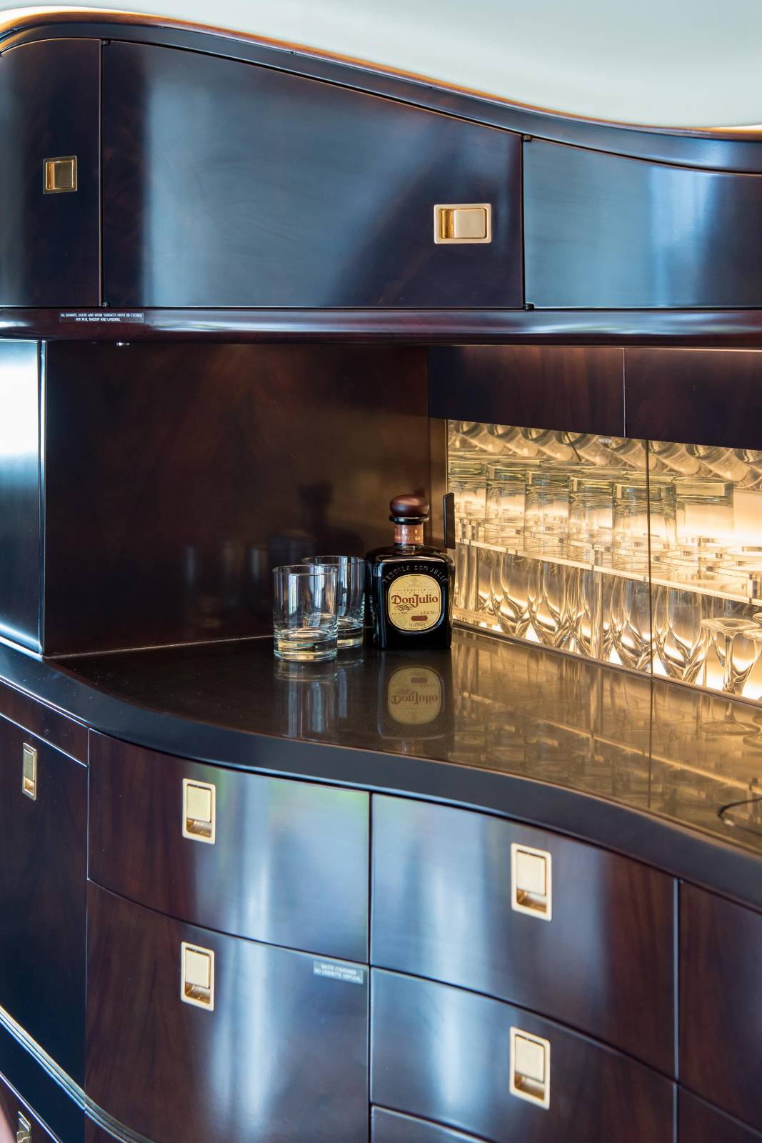 - A new composite stone counter top was installed in the galley. The glassware holder was customized and remade to secure our clients premium glassware in place.