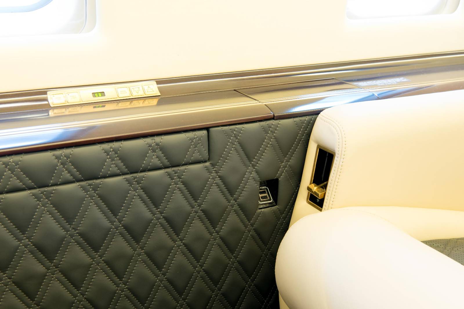 - In the lavatory the seat and aft bulkhead were recovered in oyster leather with double diamond quilting in matching thread. A new mirror was added to the door which helped make the space feel larger and brighter.