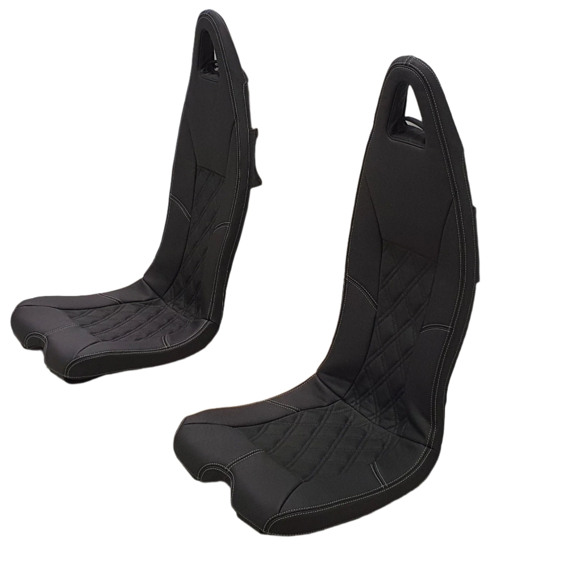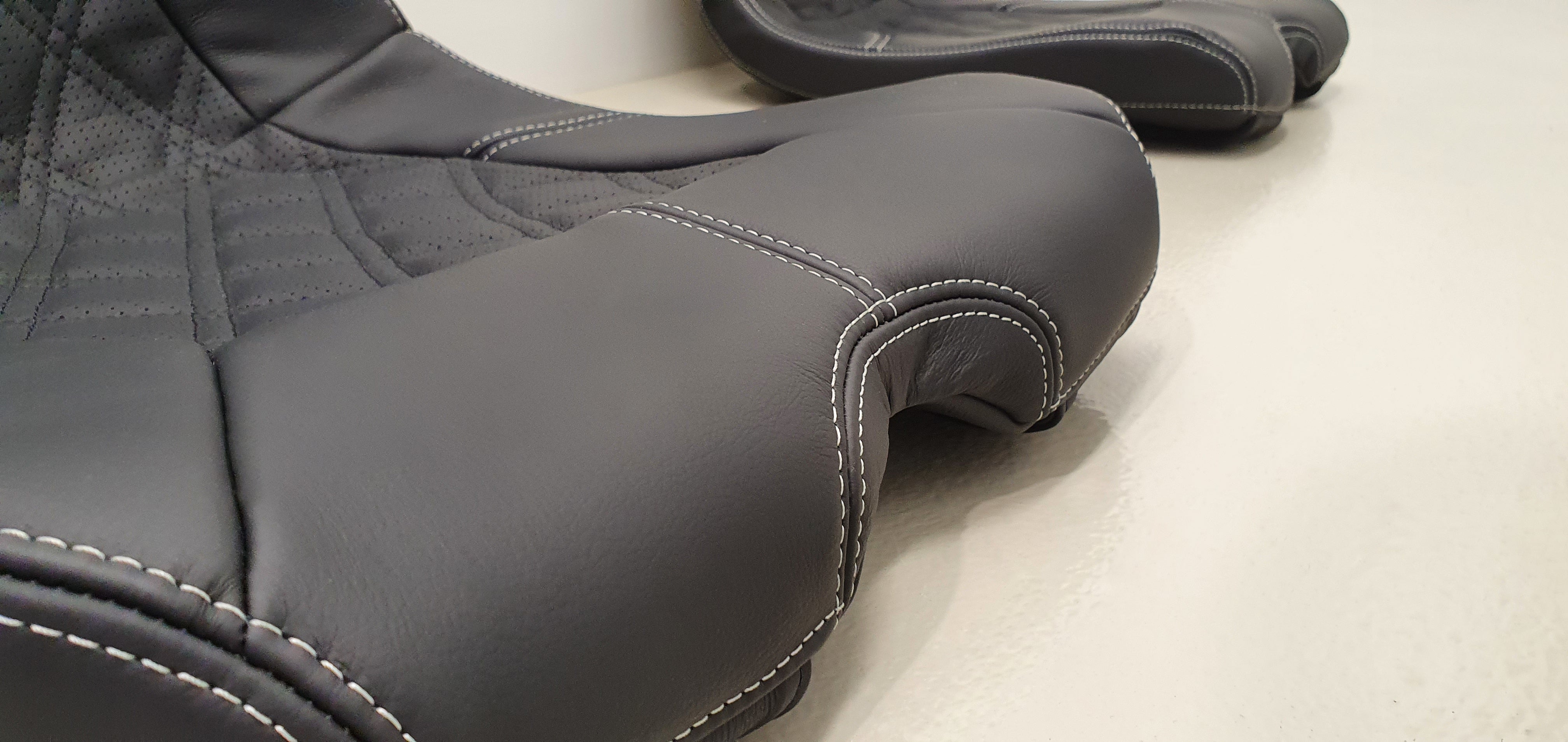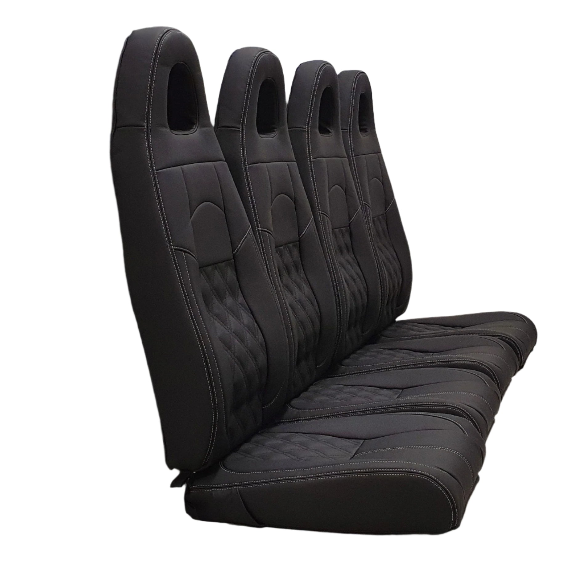 The front crew seats are the Sicma Aero one-piece design, while the rear passenger seats follow the Generation III style. Both seat types were upholstered entirely in Black aviation leather (ADI-1091) and feature silver decorative stitching. The centre inserts are perforated (SP-05) and finished with a Double Diamond quilt pattern (SA005), creating a sleek and modern interior aesthetic.