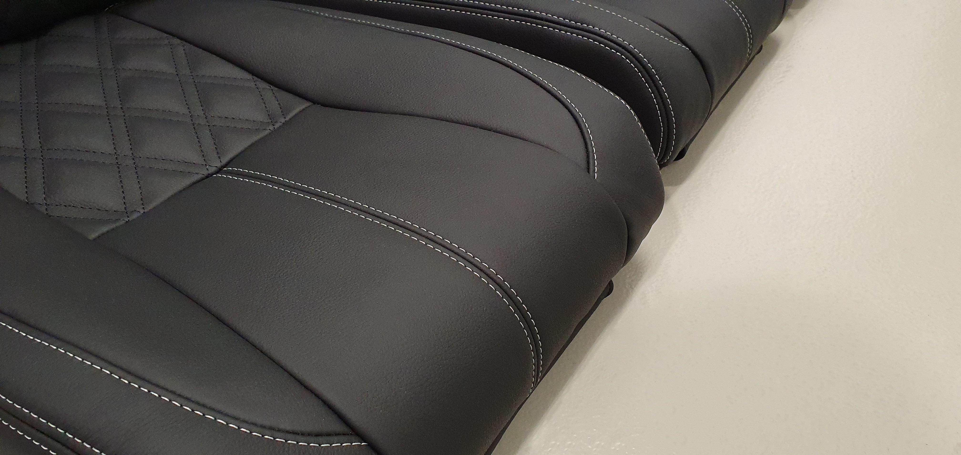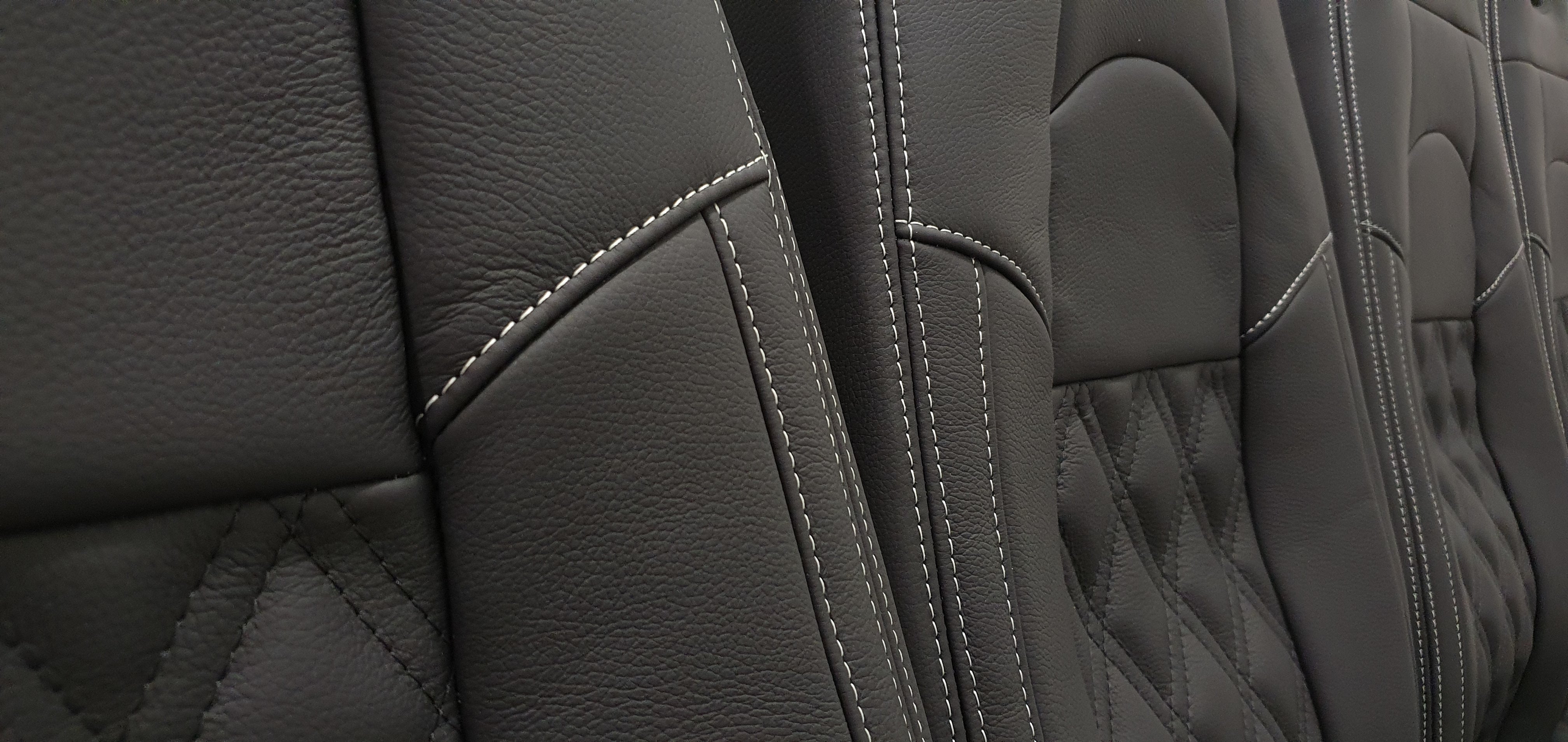 The rest of the interior trim mirrors the seat styling. The headlining, door inserts, glare shield, and paneling are wrapped in black synthetic leather (ADI-1096) and enhanced with silver stitching and embroidered placarding where required. Additional trim components, including the control boots and grab handles, were finished in matching Black leather (ADI-1091).