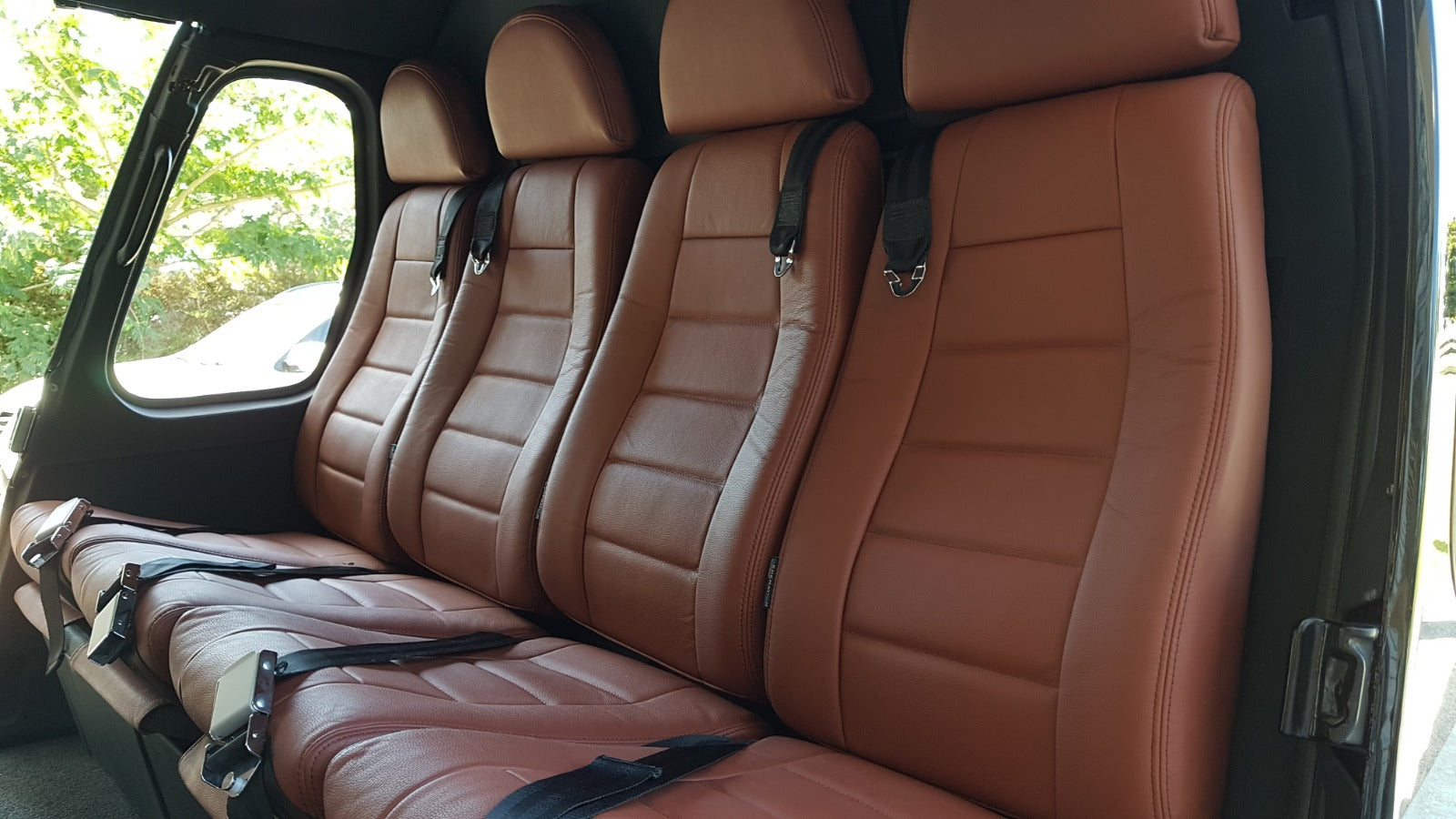 The two crew seats in this Eurocopter AS350 are designed in the Gen III style, which is known for both comfort and ergonomic support. The seat cushions are secured with Velcro, allowing for easy attachment to the crew seat shells. To maintain a cohesive design, each seat shell is wrapped in the same Henna leather used on the main seats, and black stitching accentuates the contours of the seats for added detail.