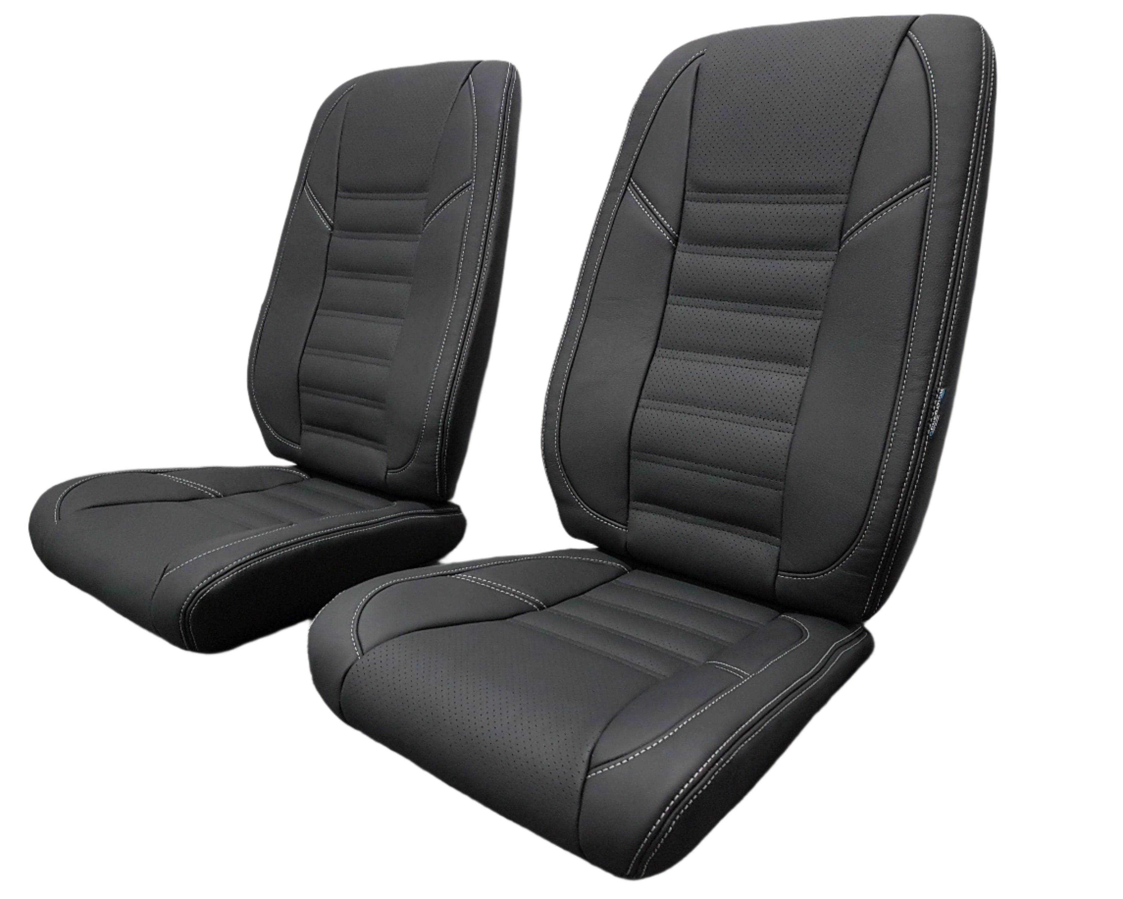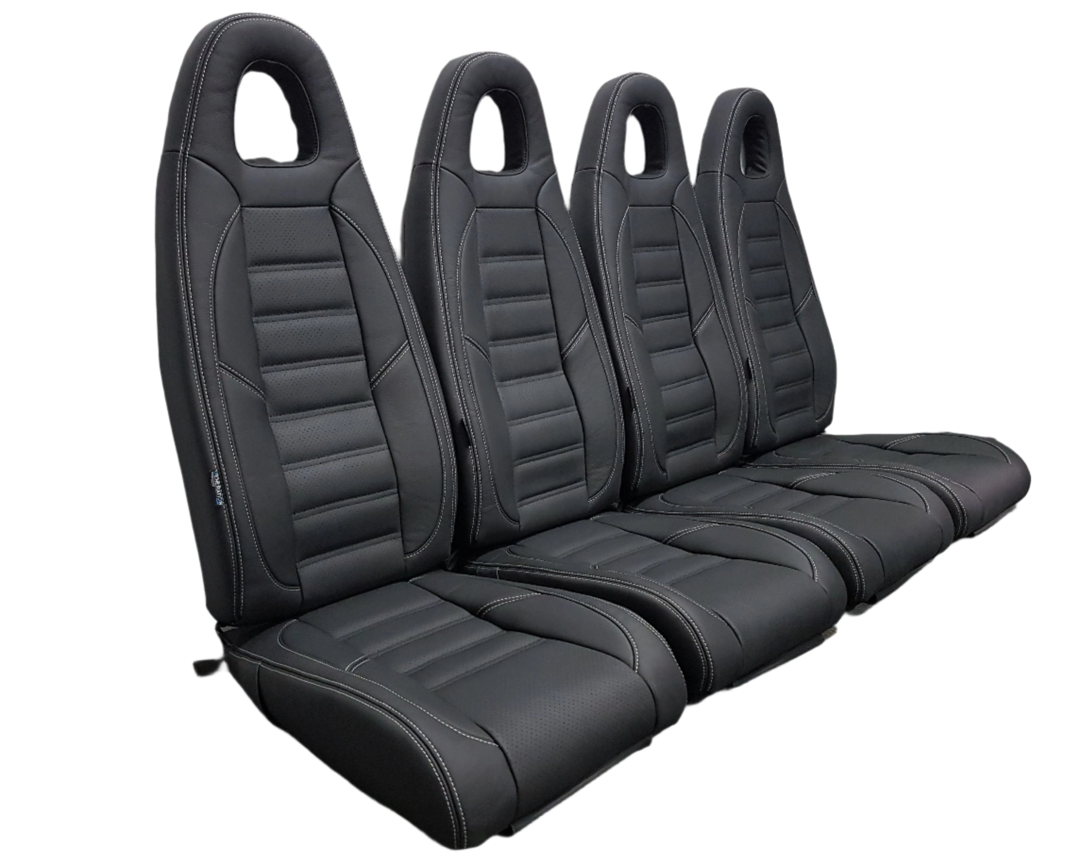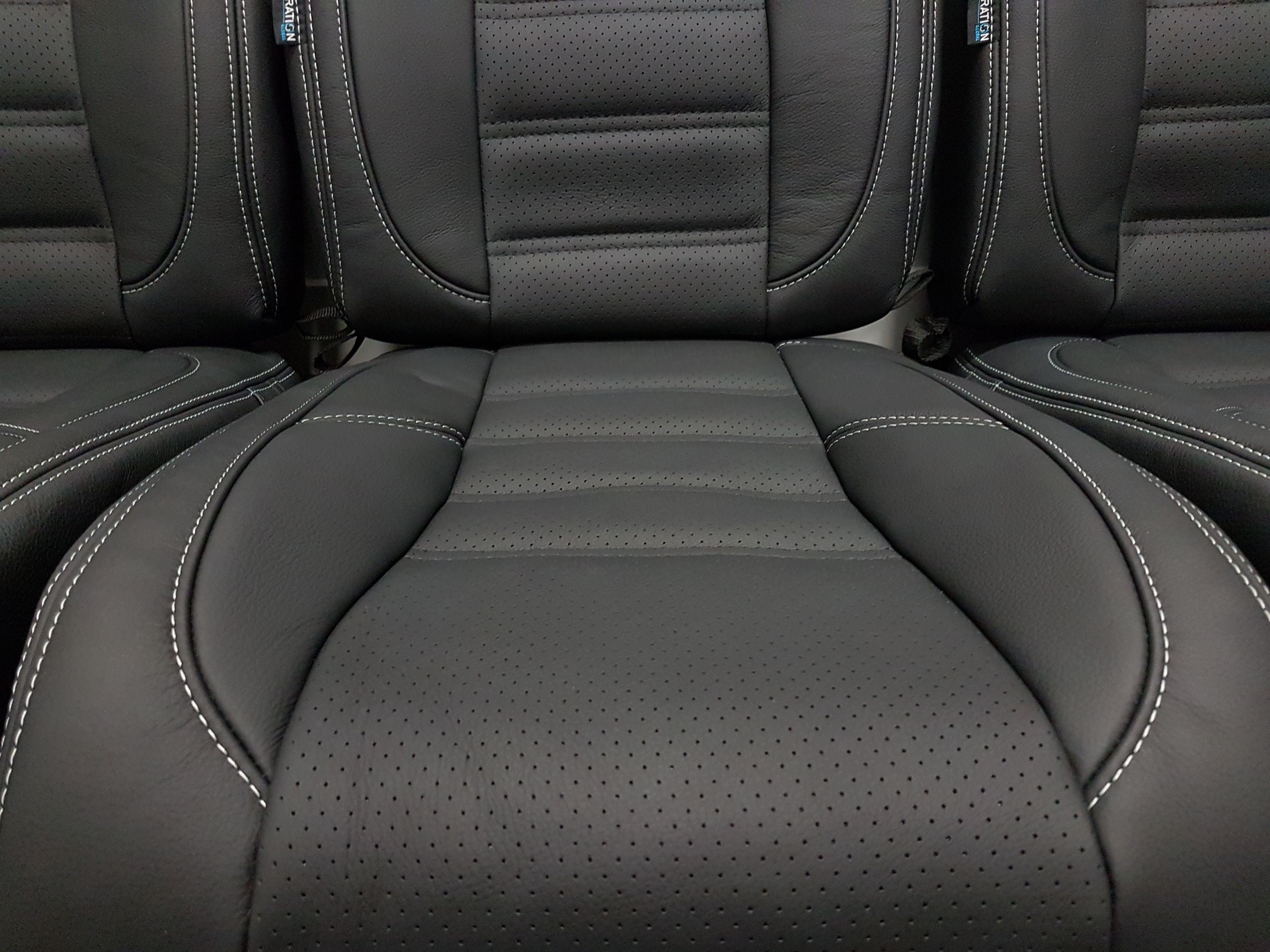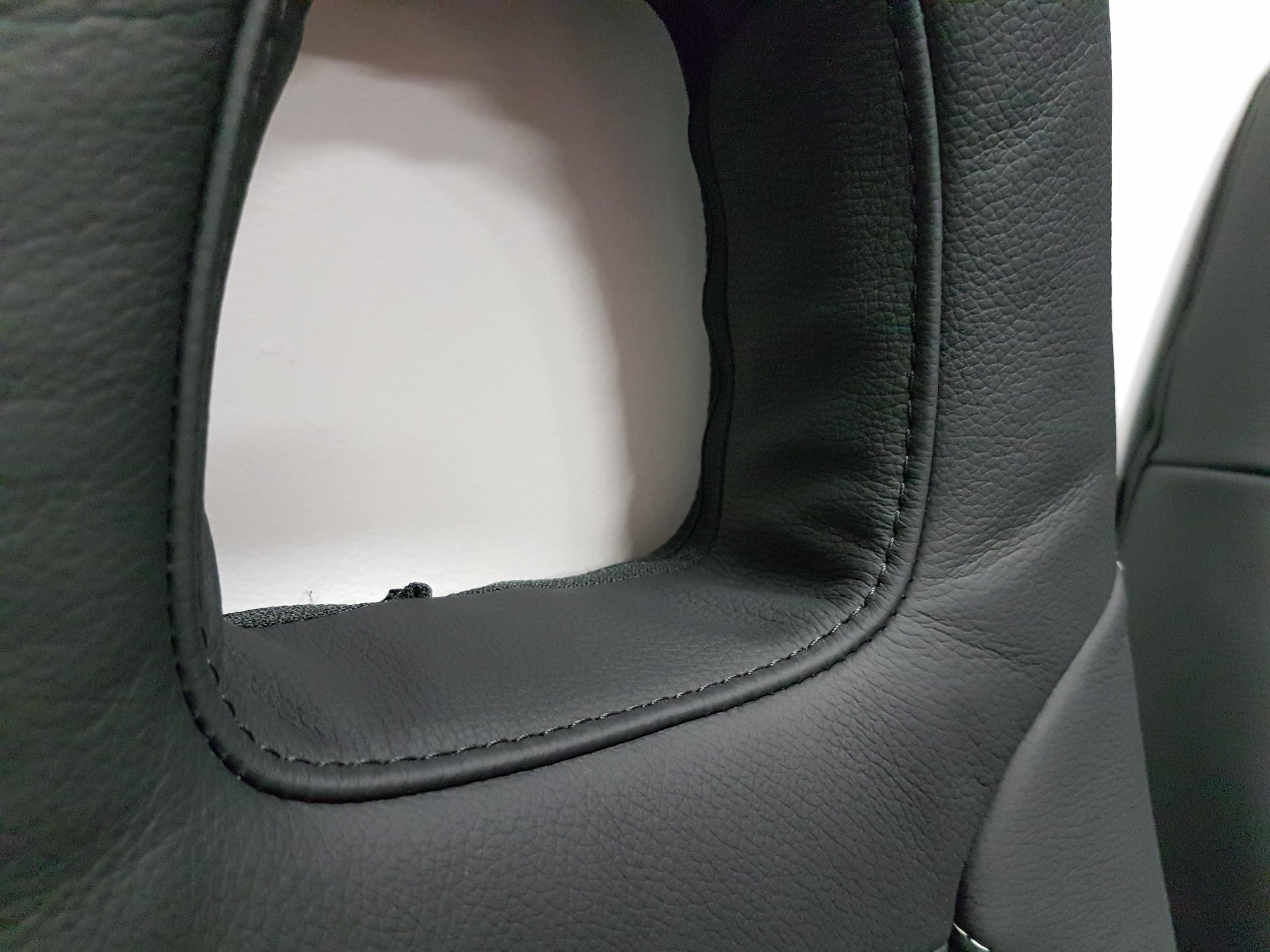 Both seat types were upholstered in black aviation leather (ADI-1091), a durable and easy-to-clean material that’s ideal for the demanding environment of helicopter interiors. The center insert panels were perforated, enhancing breathability and comfort during flights. The seat covers were finished with elegant silver top stitching, which highlights the clean lines of the seat design and adds a sleek, modern touch to the overall interior.
