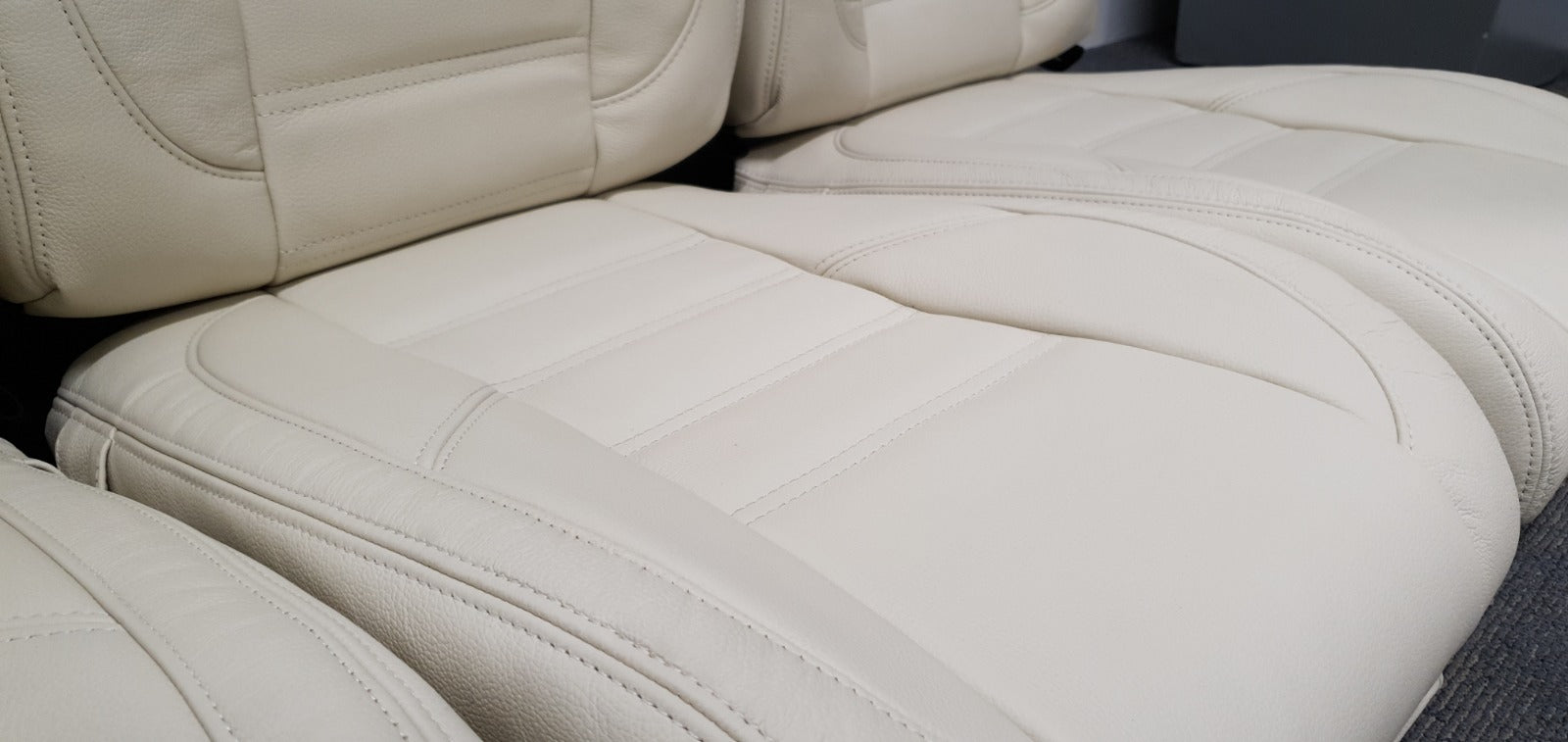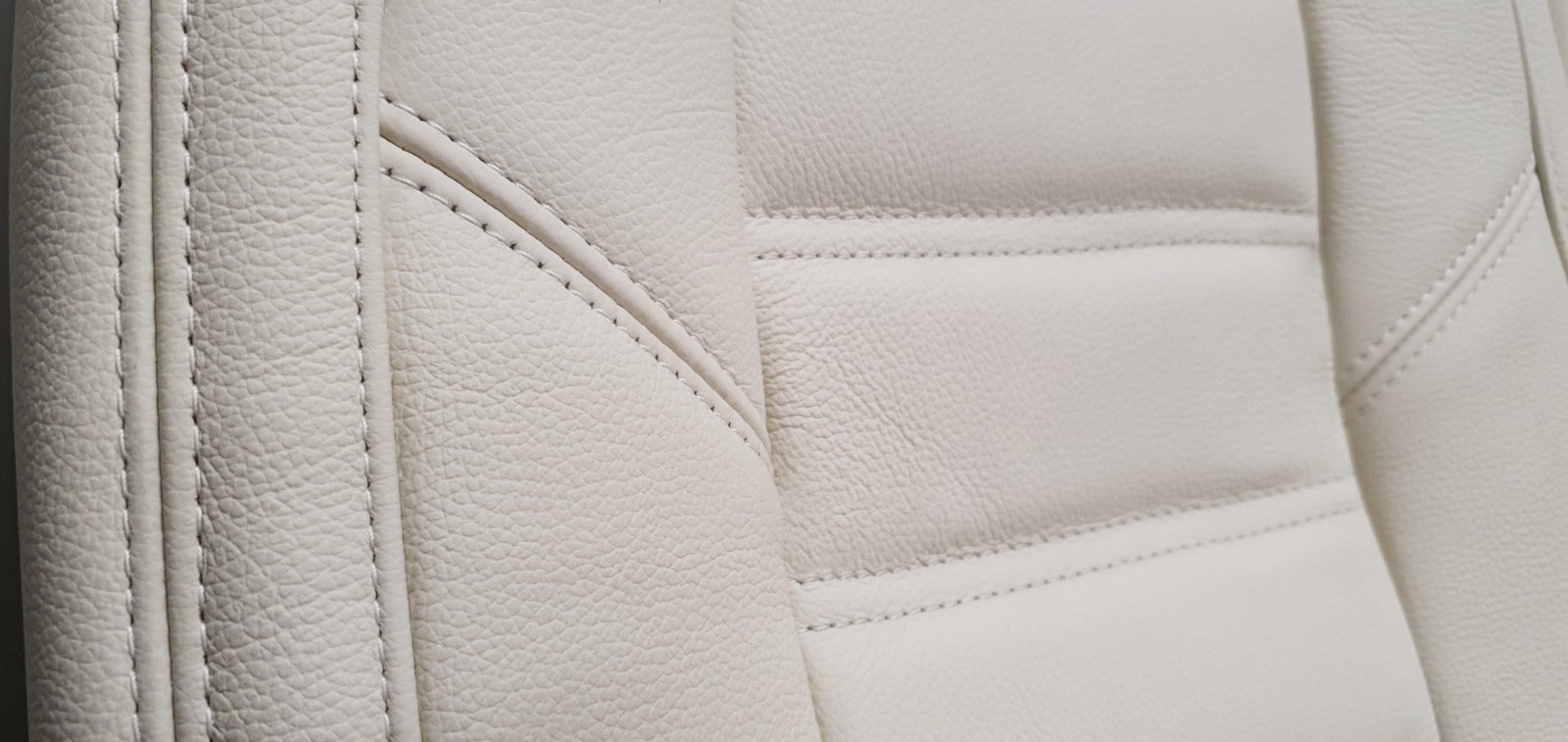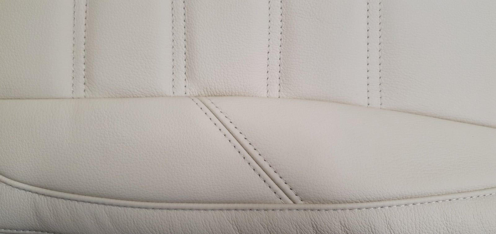 The center inserts featured flat panels with wide white double-stitched bands, and we used the same double stitching on the side bolsters of both the seat base and back. This added linework created a more refined, well-defined aesthetic.