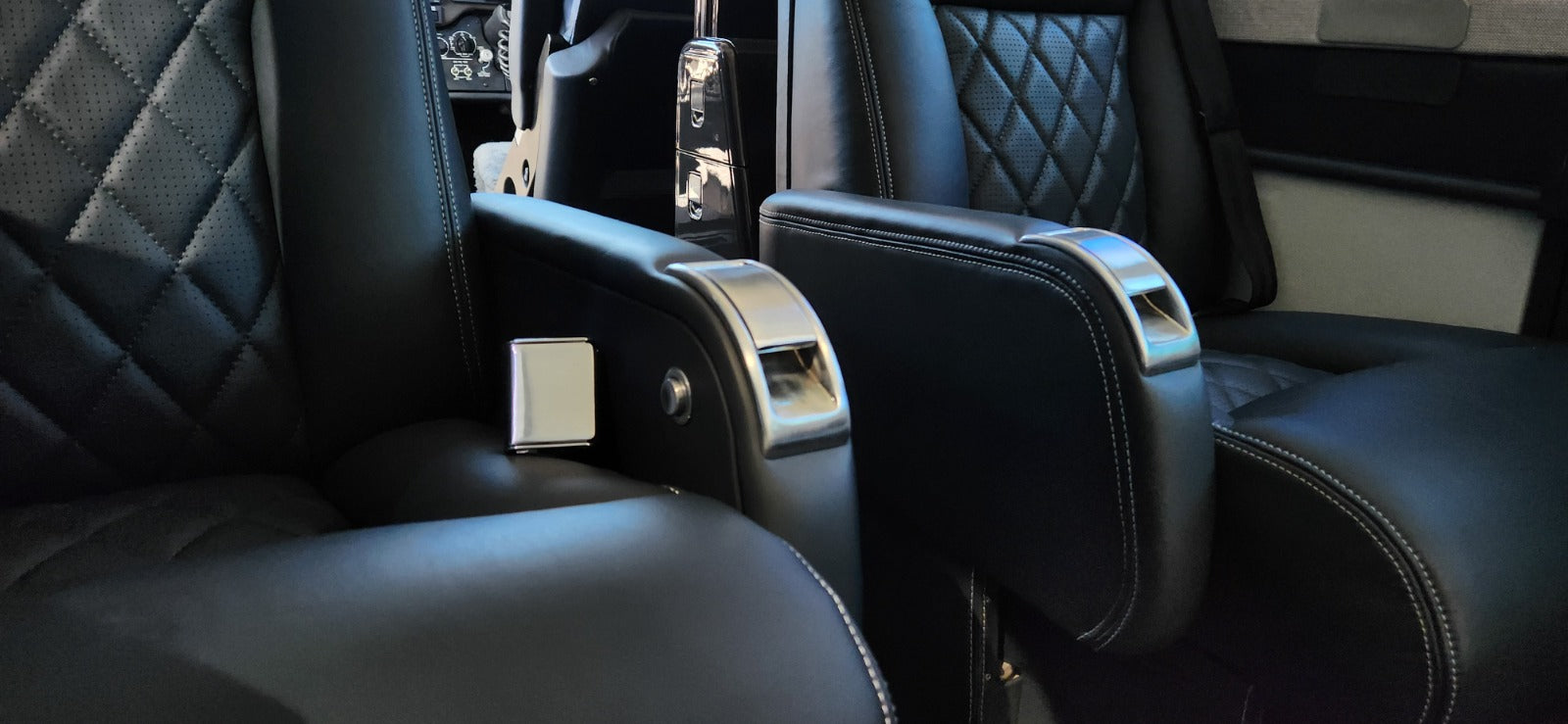 Passenger Seats: Upholstered in premium Italian black leather, featuring diamond-quilted, perforated inserts for comfort and elegance