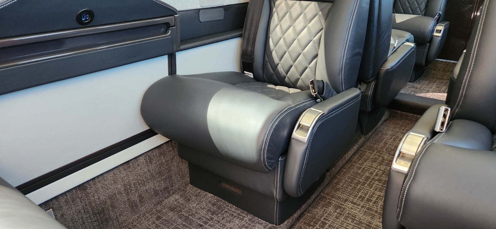 Crew Seats: Trimmed in matching black leather with dark grey sheepskin seat faces for added ergonomic comfort