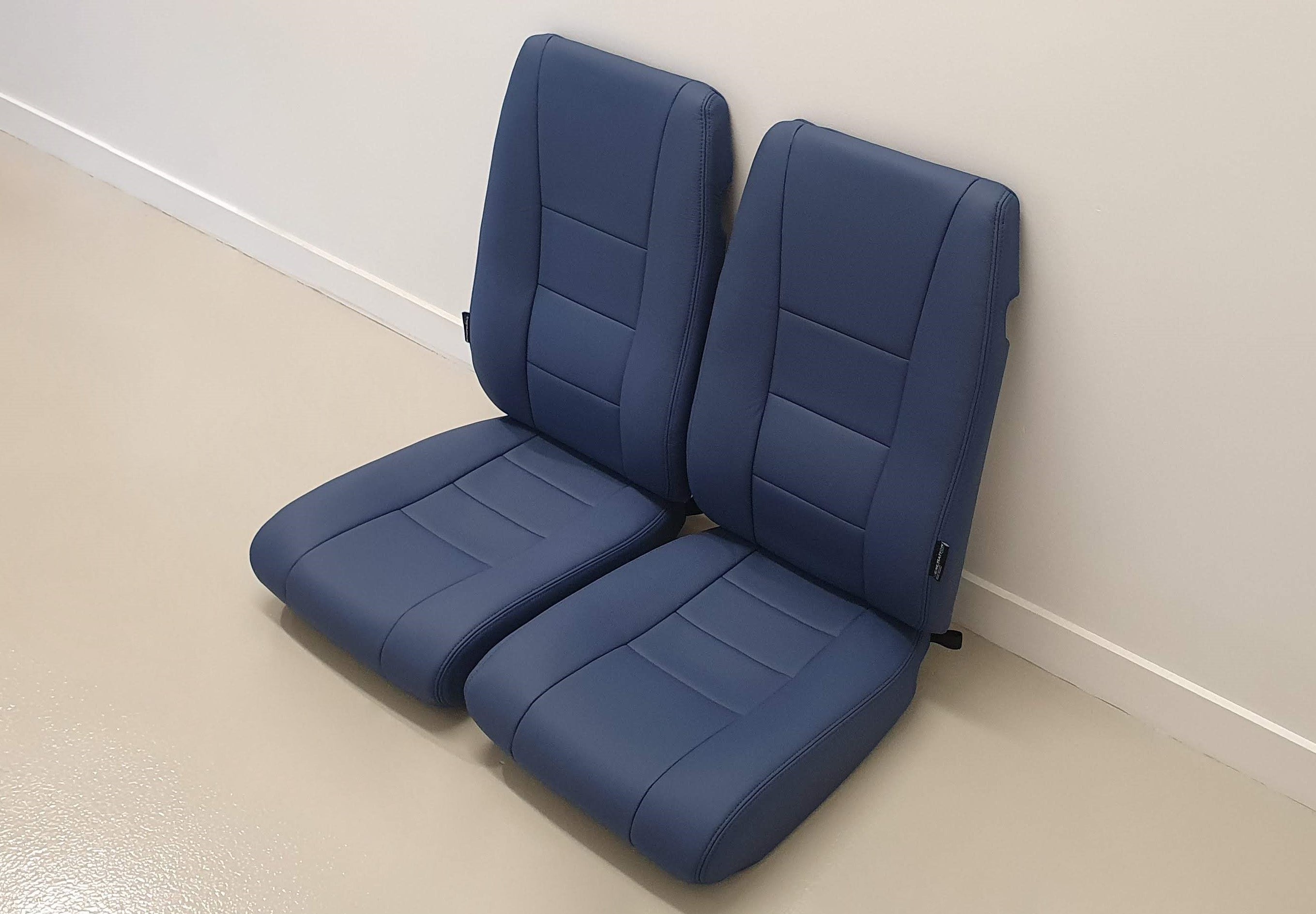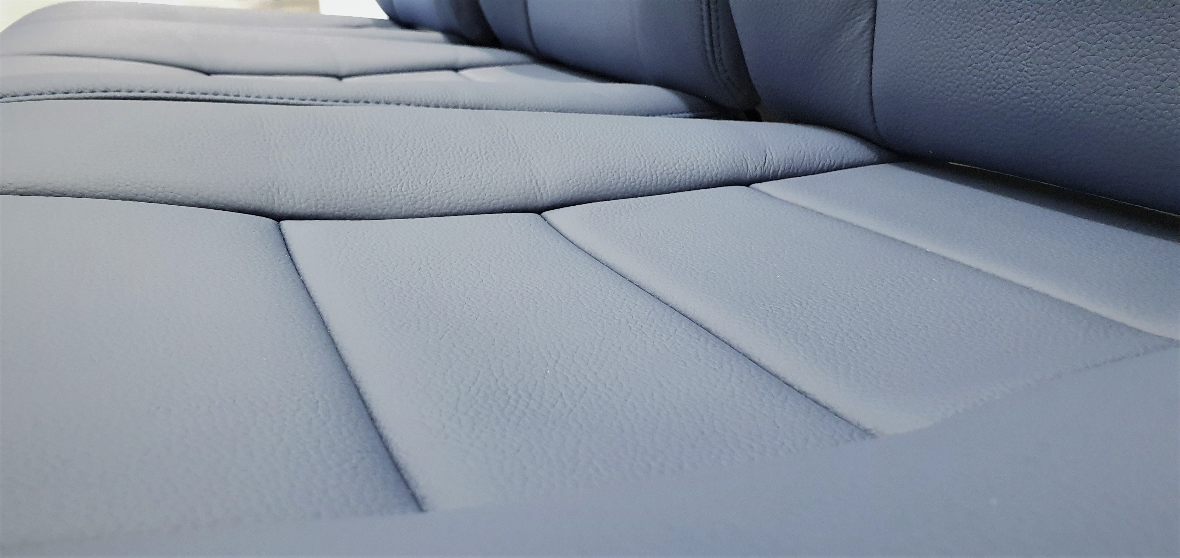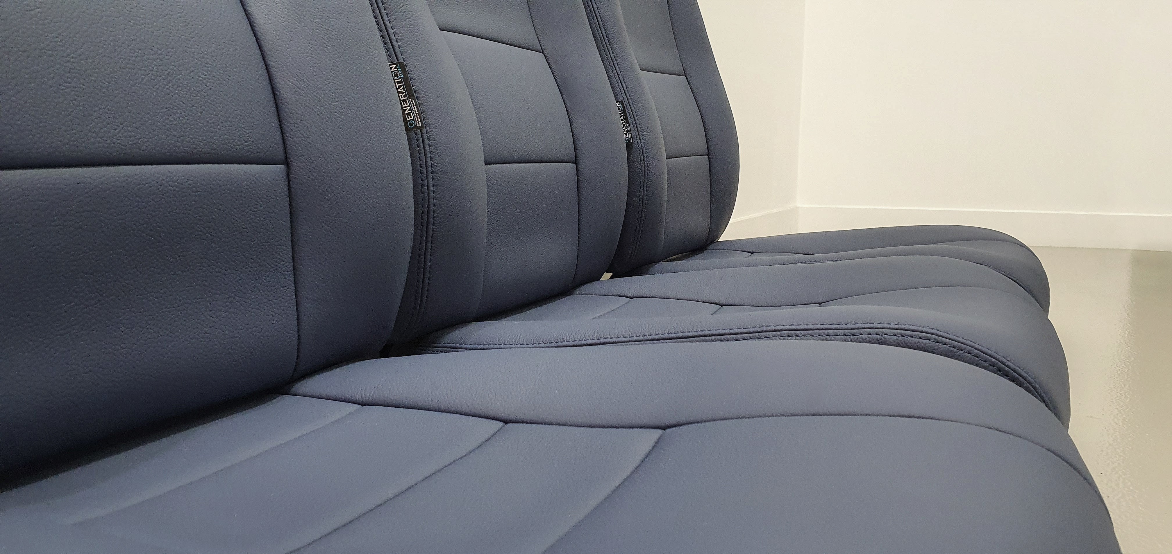 The seats were designed in the GEN I style, with seat covers made from Royal Blue (ADI-2031) aviation leather. The seats featured standard flat inserts, and all stitching was completed in matching Royal Blue thread for a seamless look. The rear carpet sections were manufactured from Blue Shadow plush pile carpet, with the edges bound in matching mesh binding, providing a clean, professional finish to the interior.