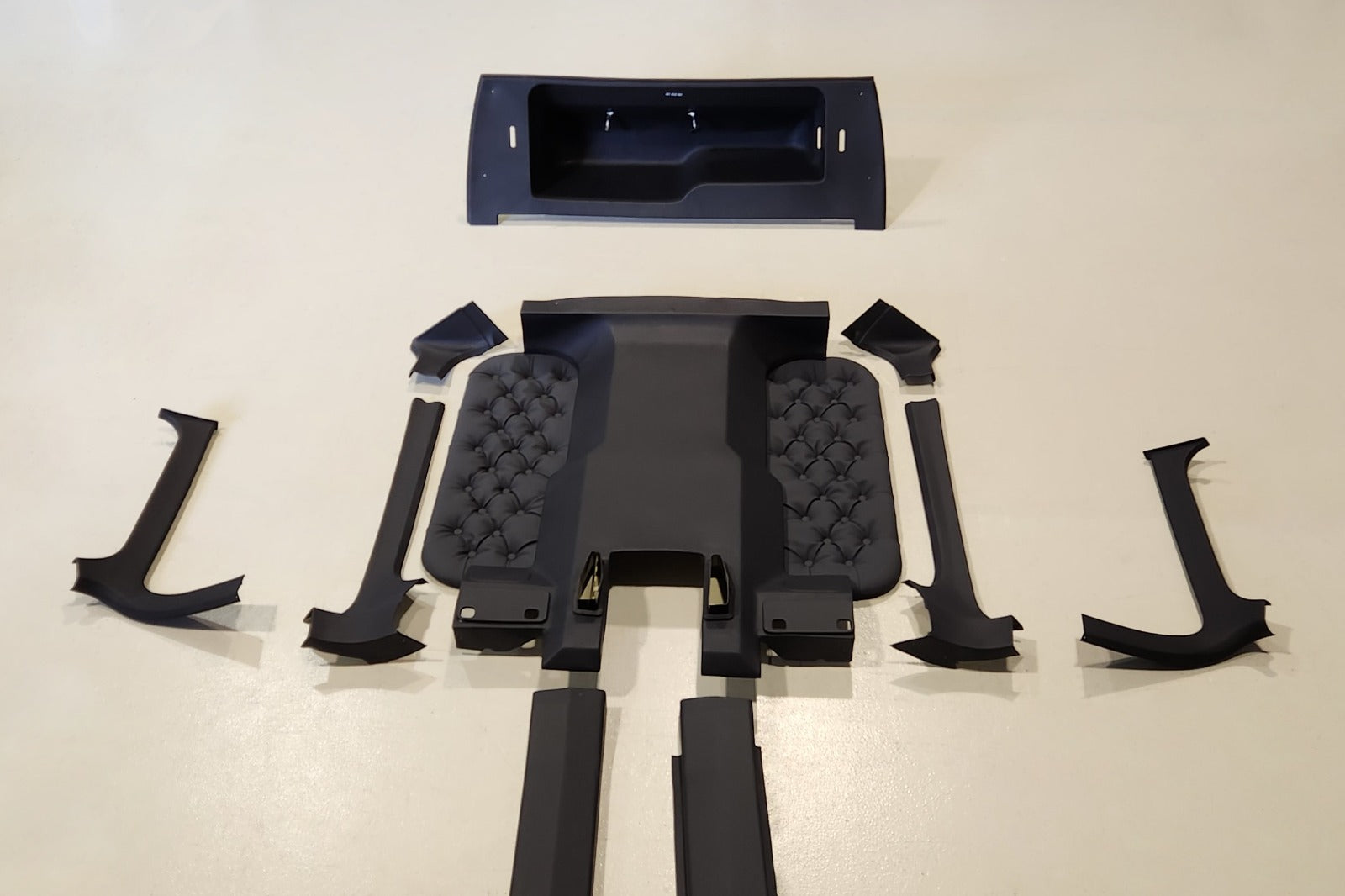 The interior is distinguished by a deep buttoning design, found in the door inserts and ceiling insert panels, creating a rich, textured look.