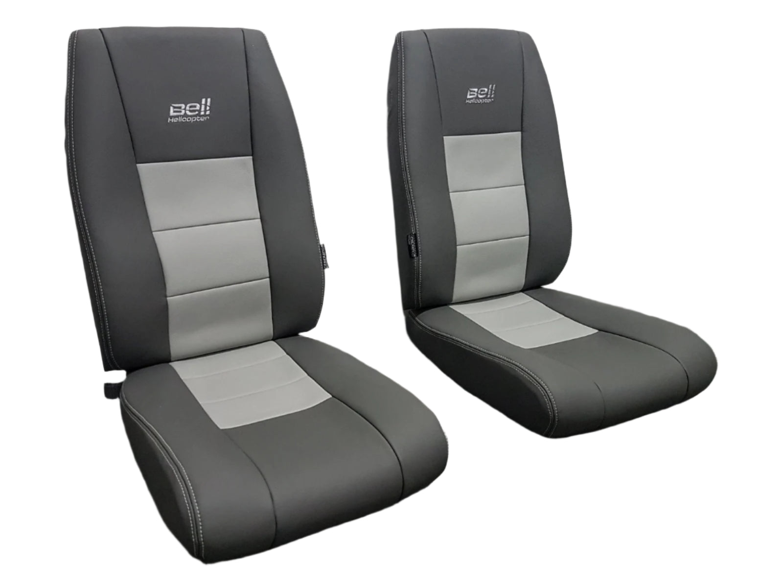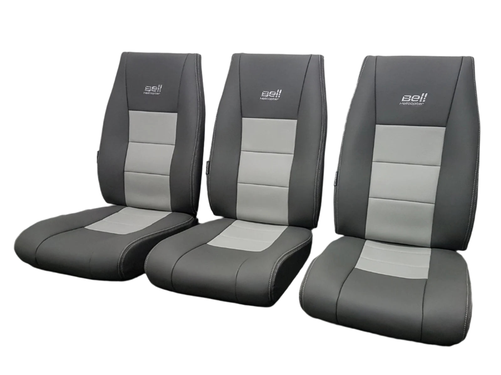 The crew seat backrest shells were custom designed to seamlessly fit over the bulkhead they attach to, ensuring a clean, integrated look. For all stitching, we used Titanium Grey thread, which complemented the color theme and contributed to a polished, cohesive design. As an added touch, the Bell logo was embroidered on each seat back, adding a branded, high-end finish.