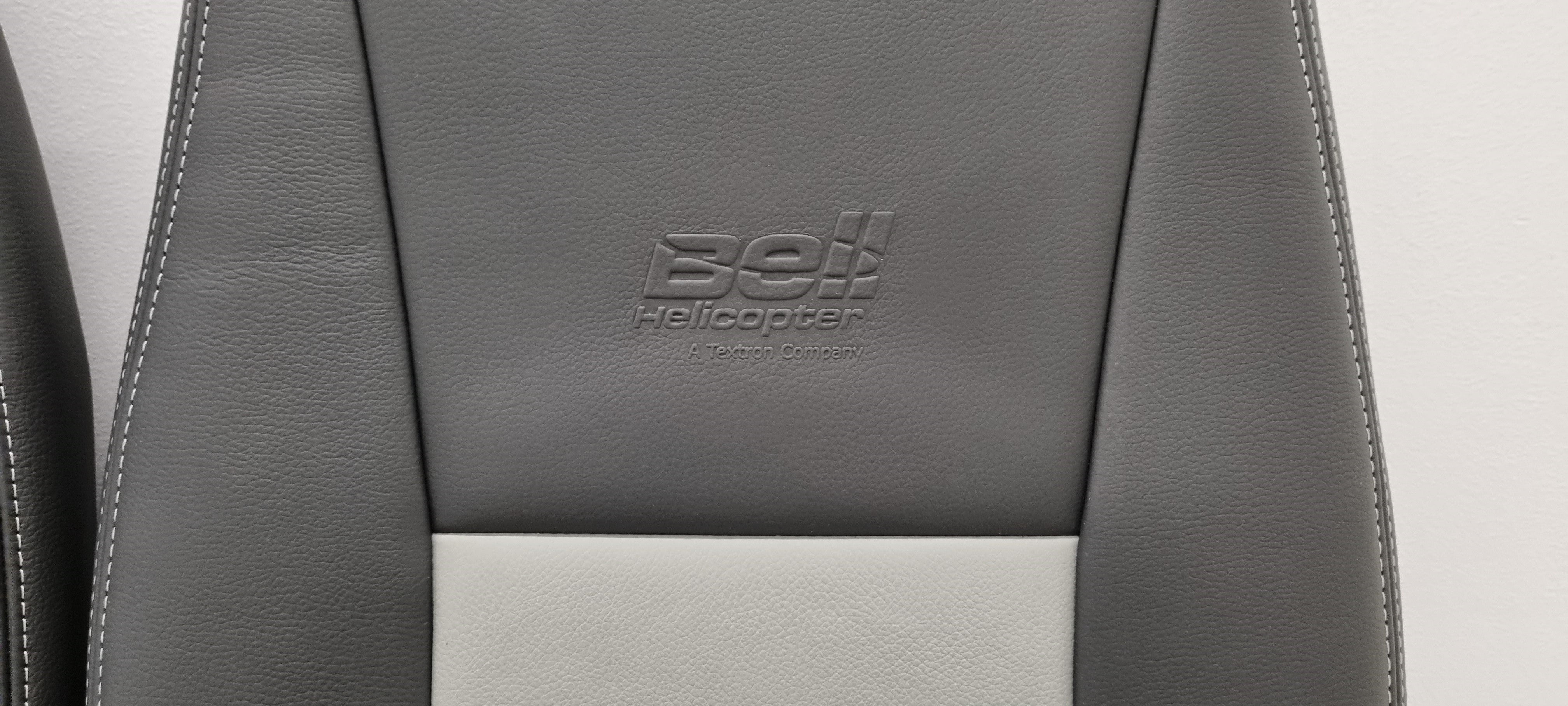The Long Ranger interior includes two crew seats and forward and aft-facing rear pax seats. All seats were Generation I style with frame-less design. The seat upholstery was crafted from Lead Grey (ADI-1111) aviation leather, complemented by Titanium (ADI-1231) inserts. The seats feature decorative stitching and the Bell logo embossed in the upper backrest for added detail.