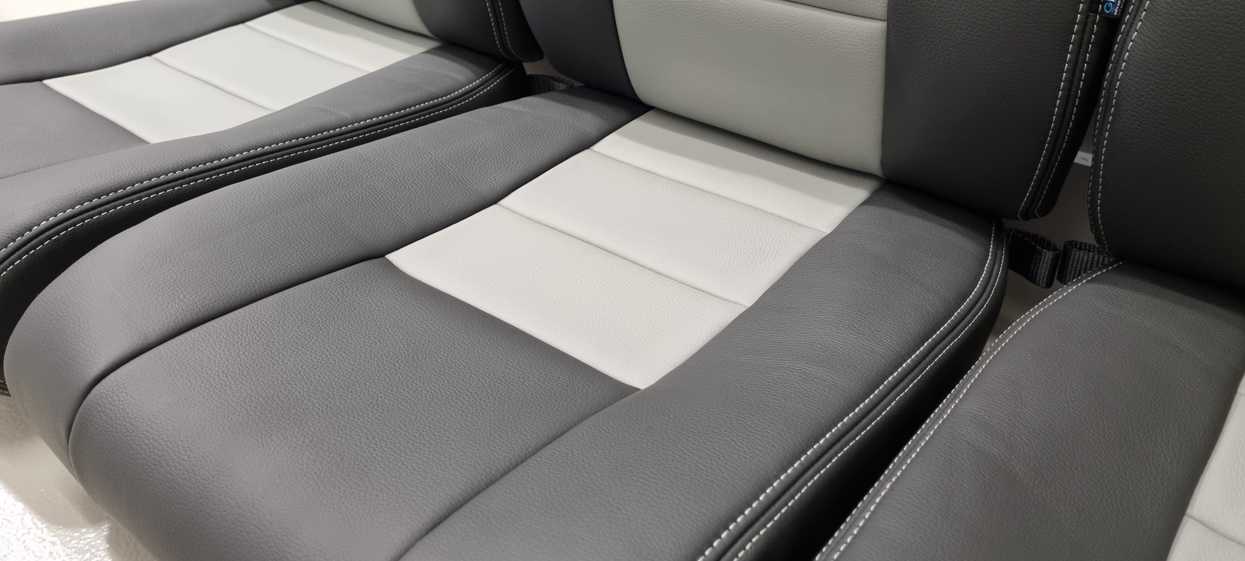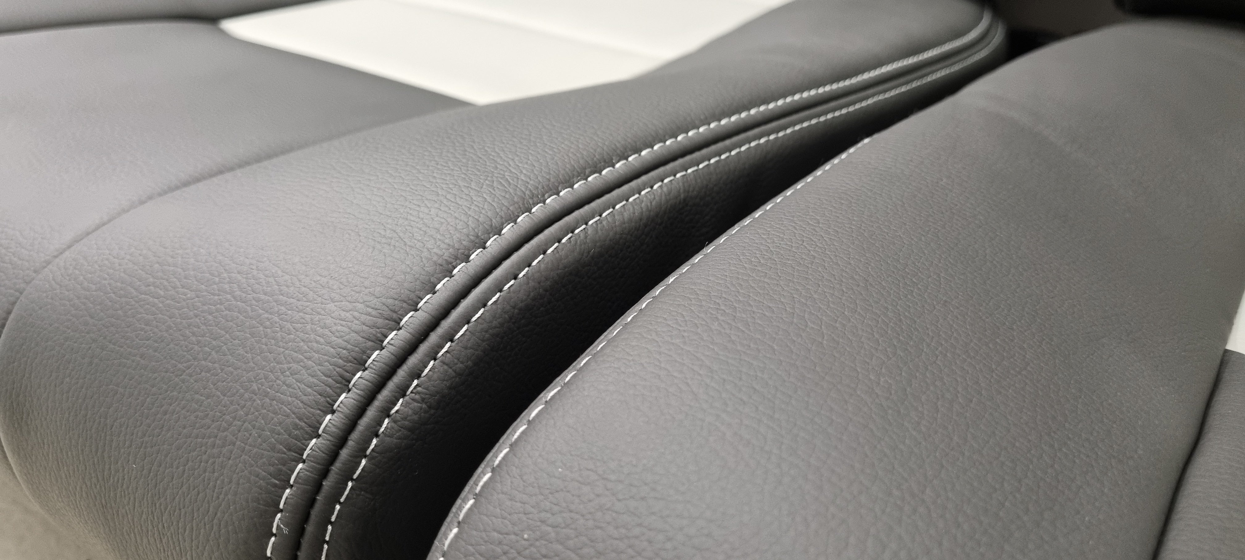 The door inserts were also crafted from Lead Grey leather (ADI-1111) and Titanium Grey (ADI-1231) with double stitching to match the rest of the upholstery, creating a cohesive and stylish interior.