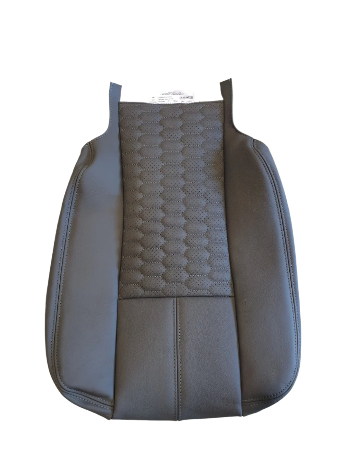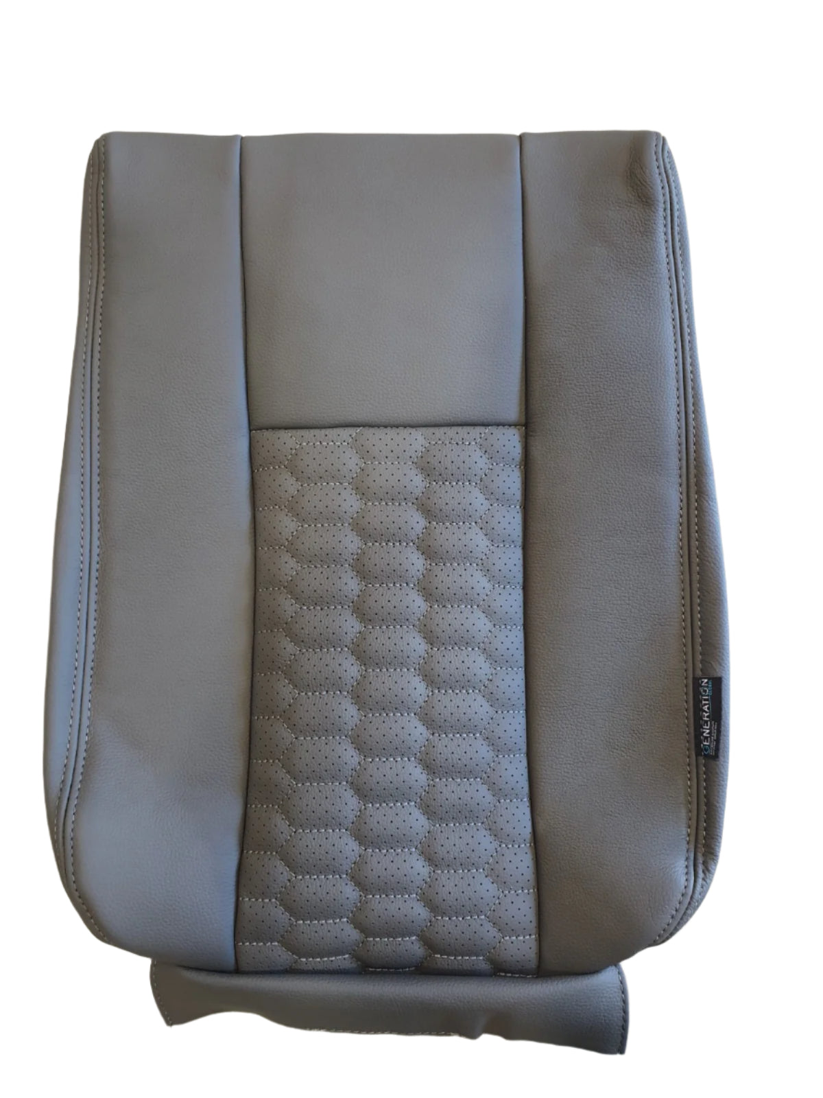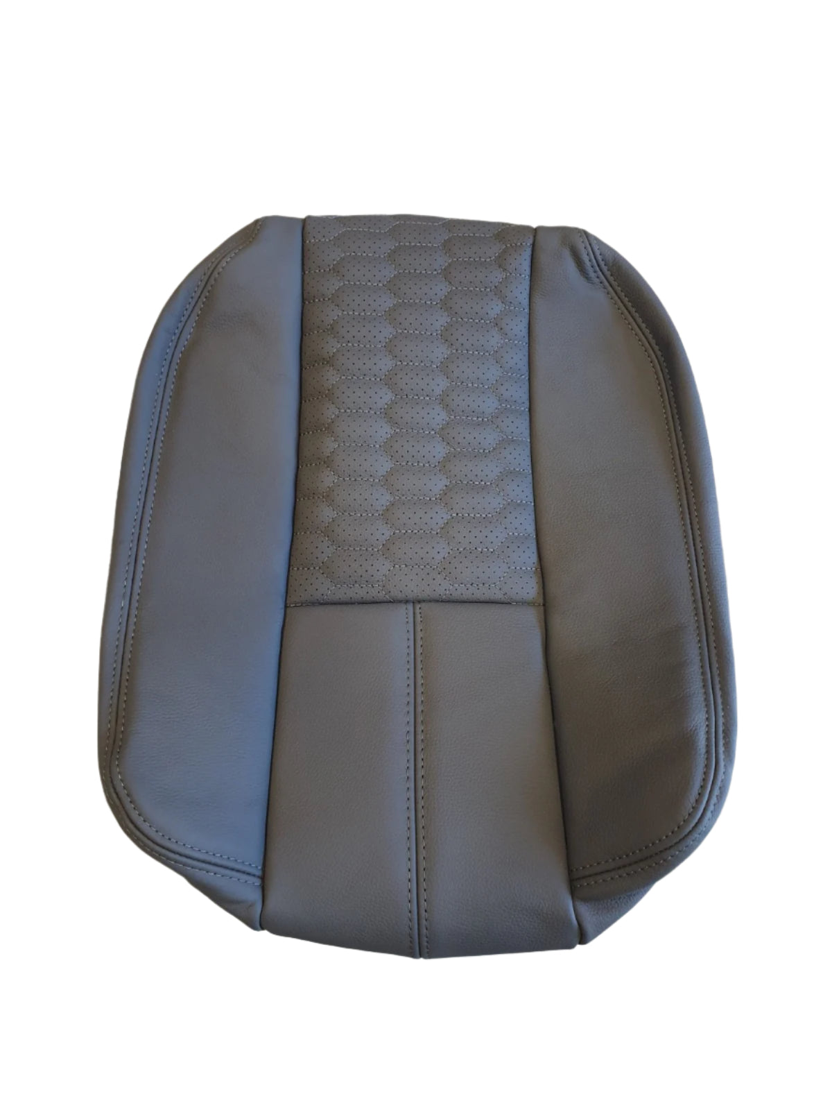 The crew seats were of the Generation II design and were fitted with new leather dress covers that align with the OEM seat frames. These covers were crafted from charcoal grey leather (ADI-1121) as the primary material, and the center inserts were perforated for breathability. Each seat features decorative Honeygrid Large quilting (SA007), adding texture and a high-end look to the seats. -