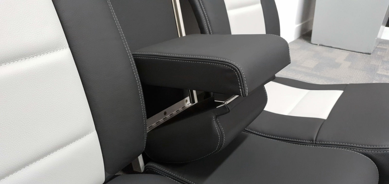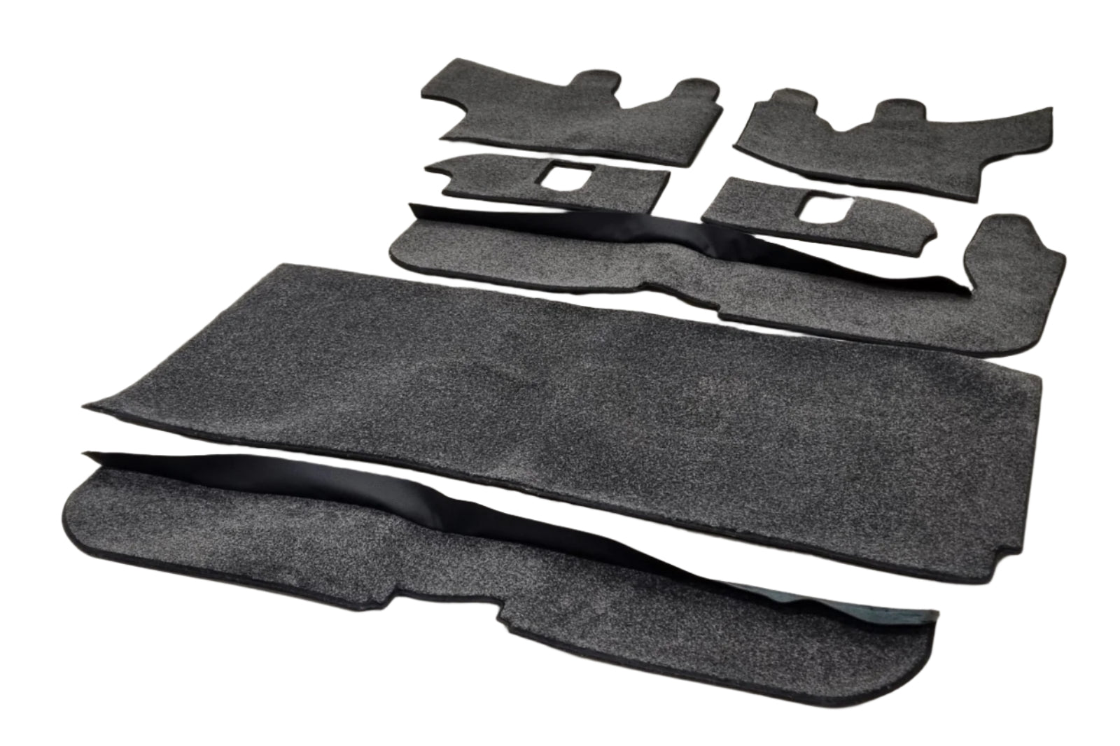 Our team also supplied precision-cut carpet pieces for the floor and lower sidewalls beneath the seats. The charcoal carpet was bound with black edging, creating a sleek look. The carpet segments were designed for easy installation and attach to the floor and sidewalls using velcro, which was supplied with the carpet.