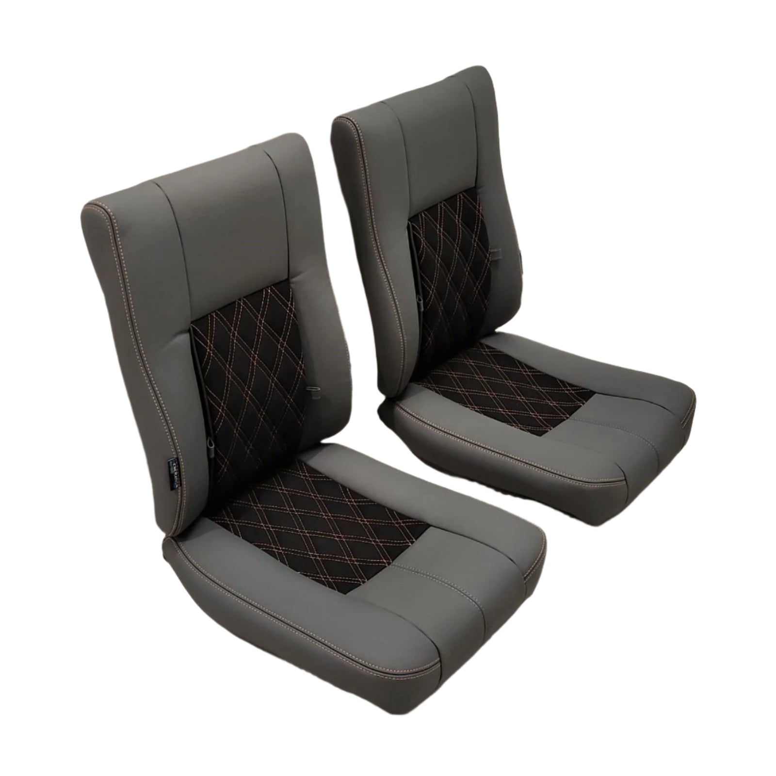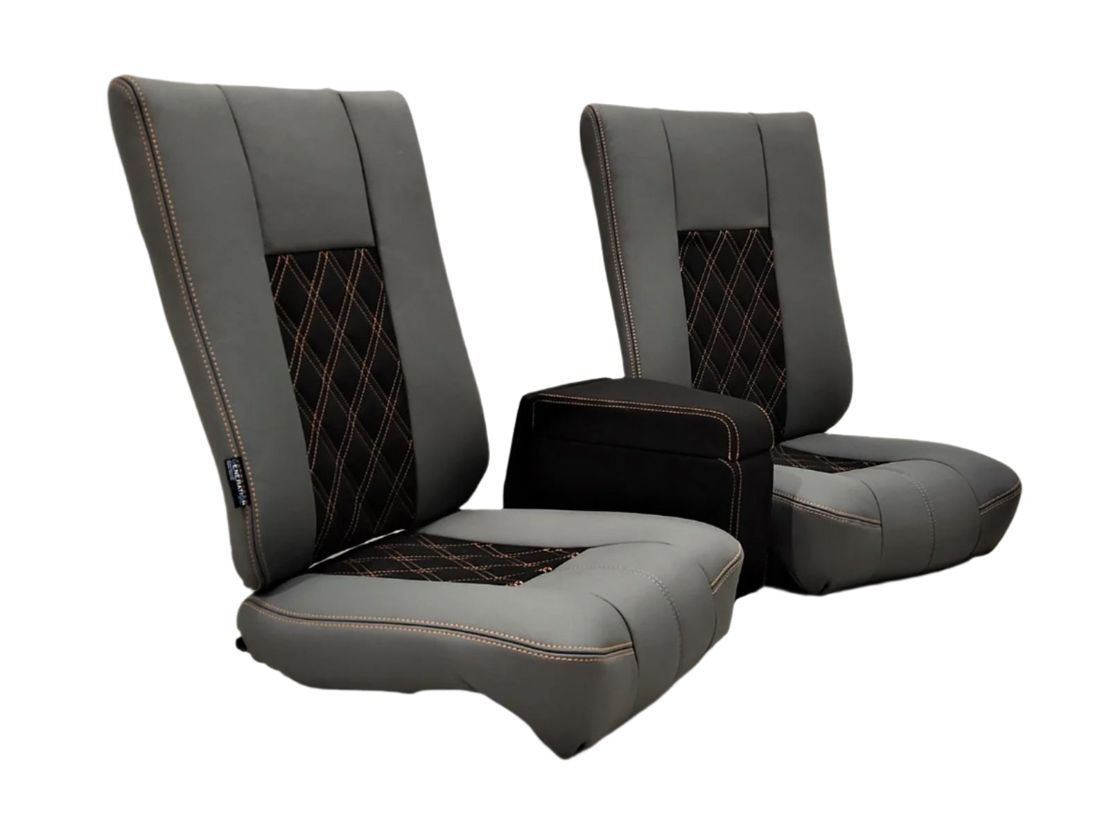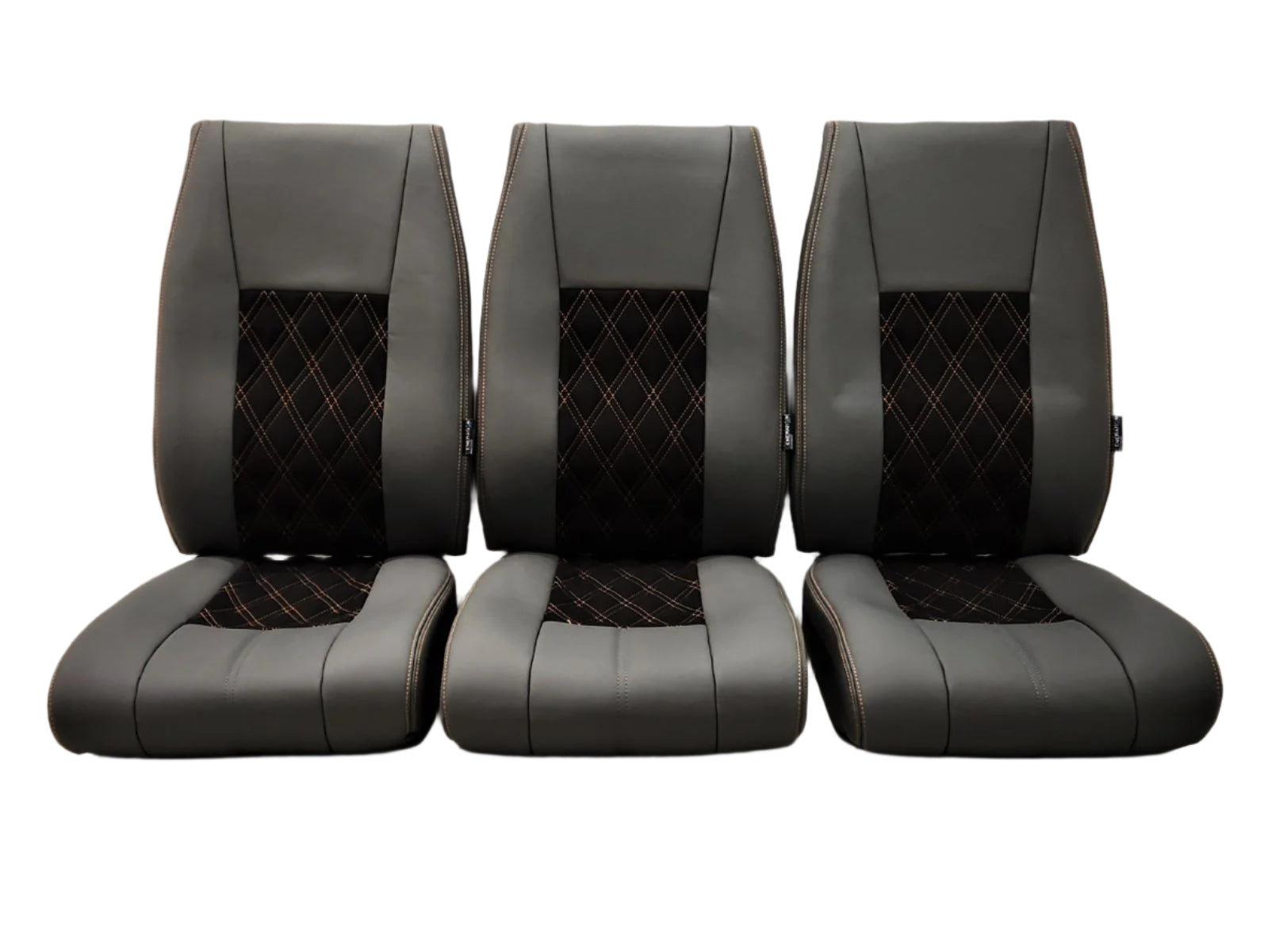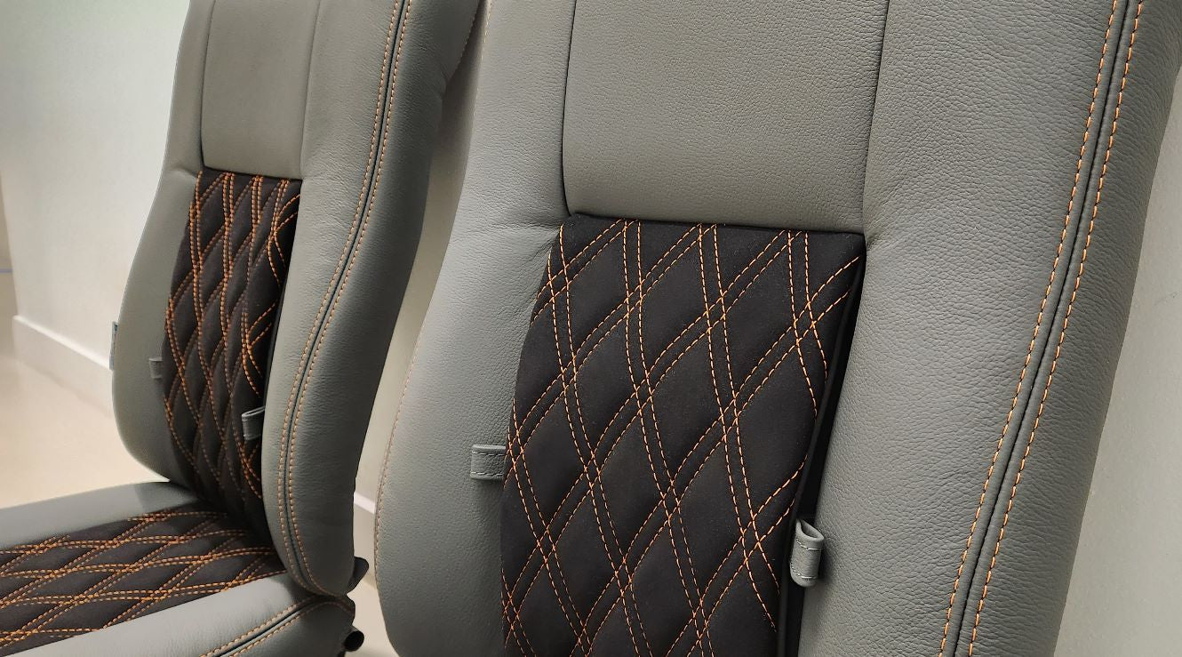 The new aviation seat upholstery was crafted using charcoal grey leather (ADI-1121) paired with black suede inserts, offering both comfort and sophistication.