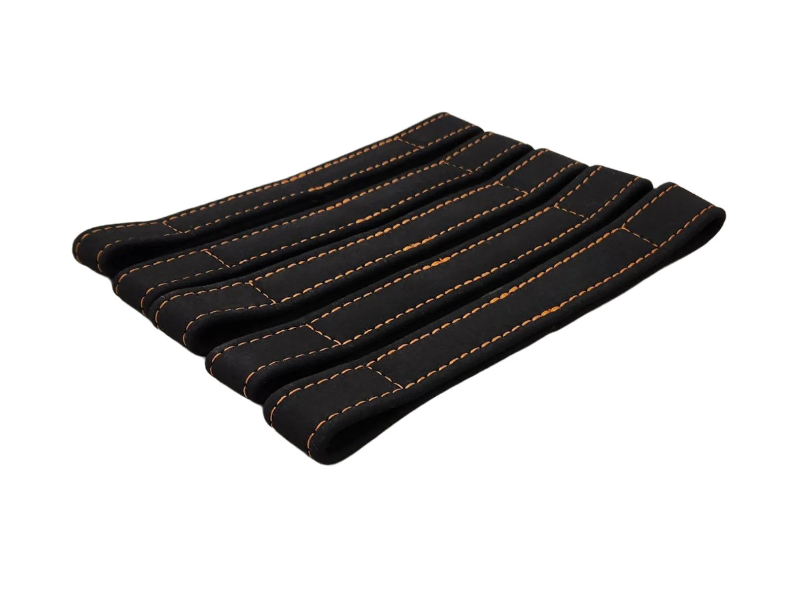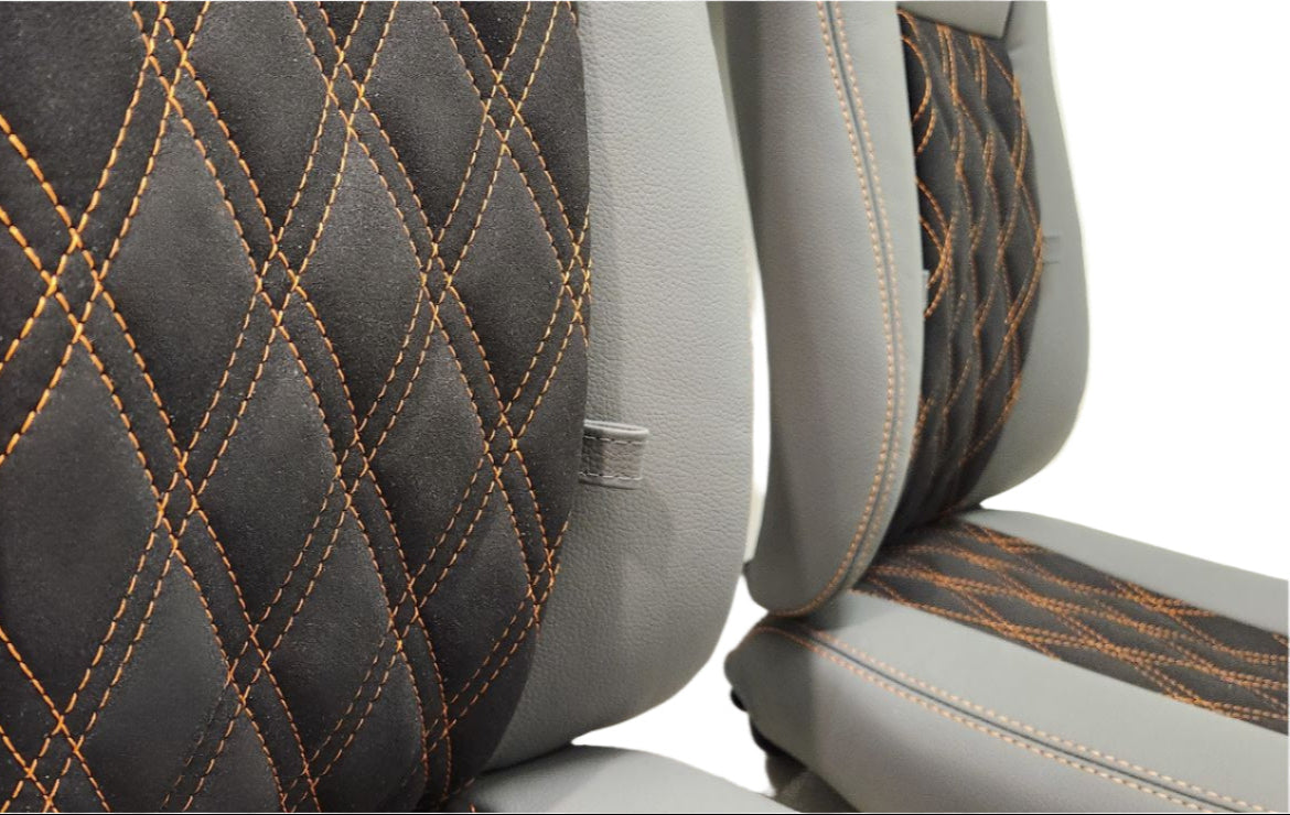Each headrest was finished in black suede with the client’s logo embroidered in orange and white, providing a personalized, professional touch.