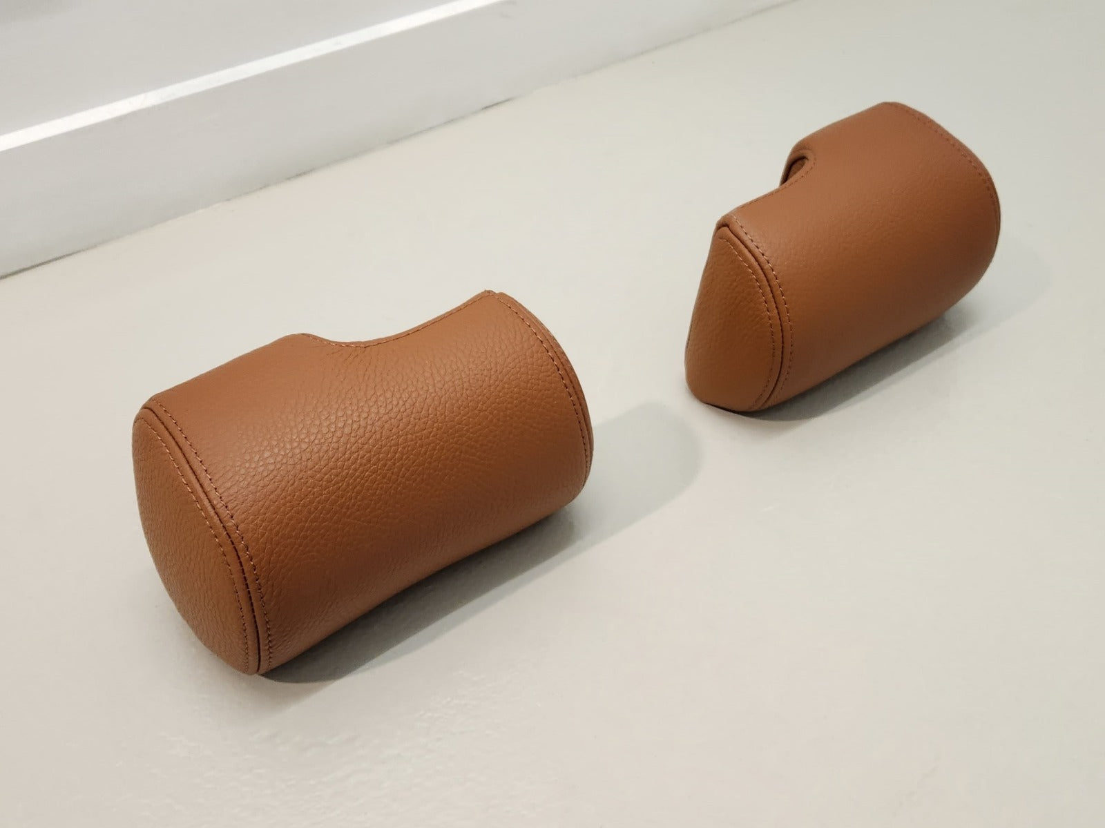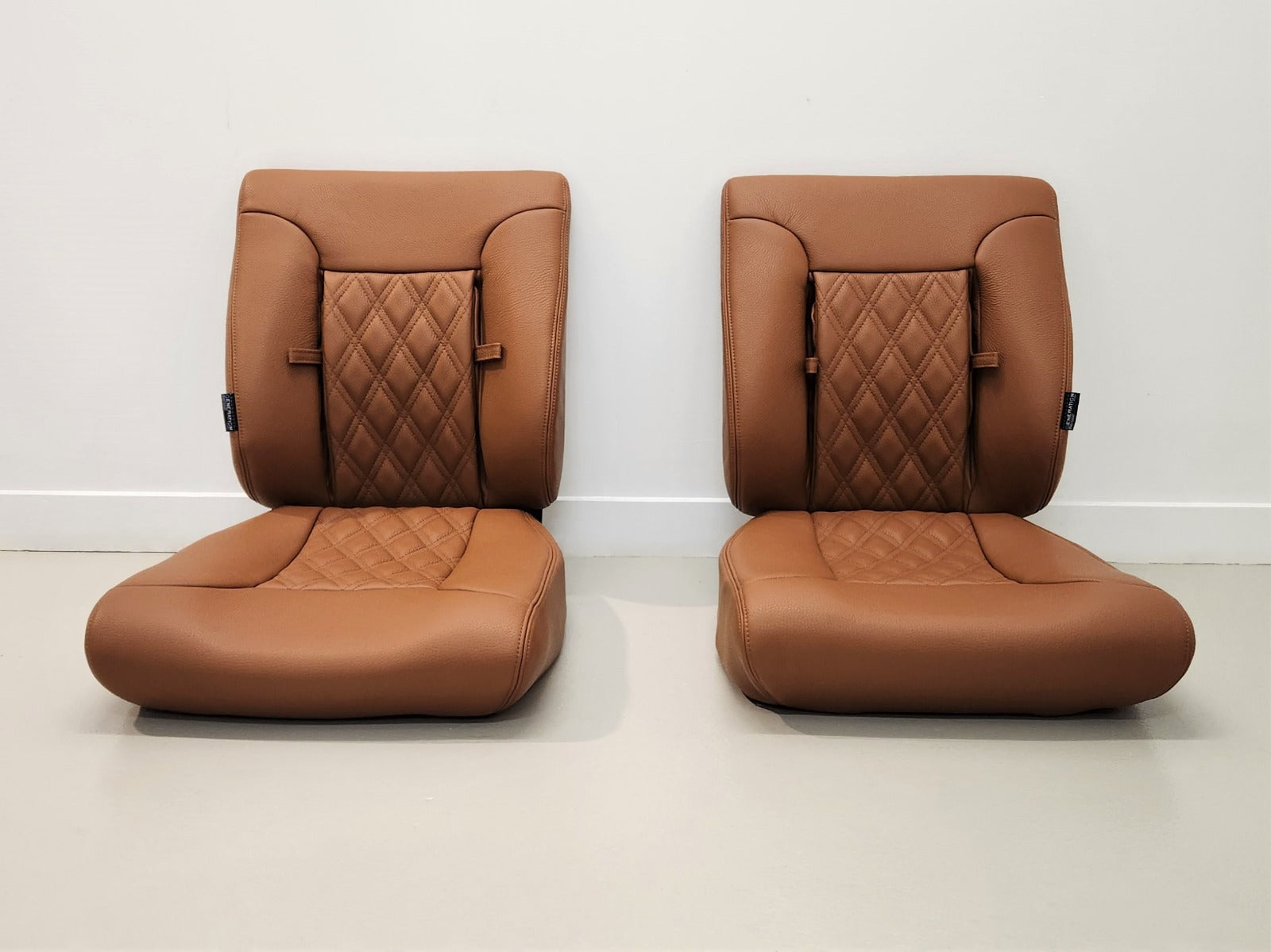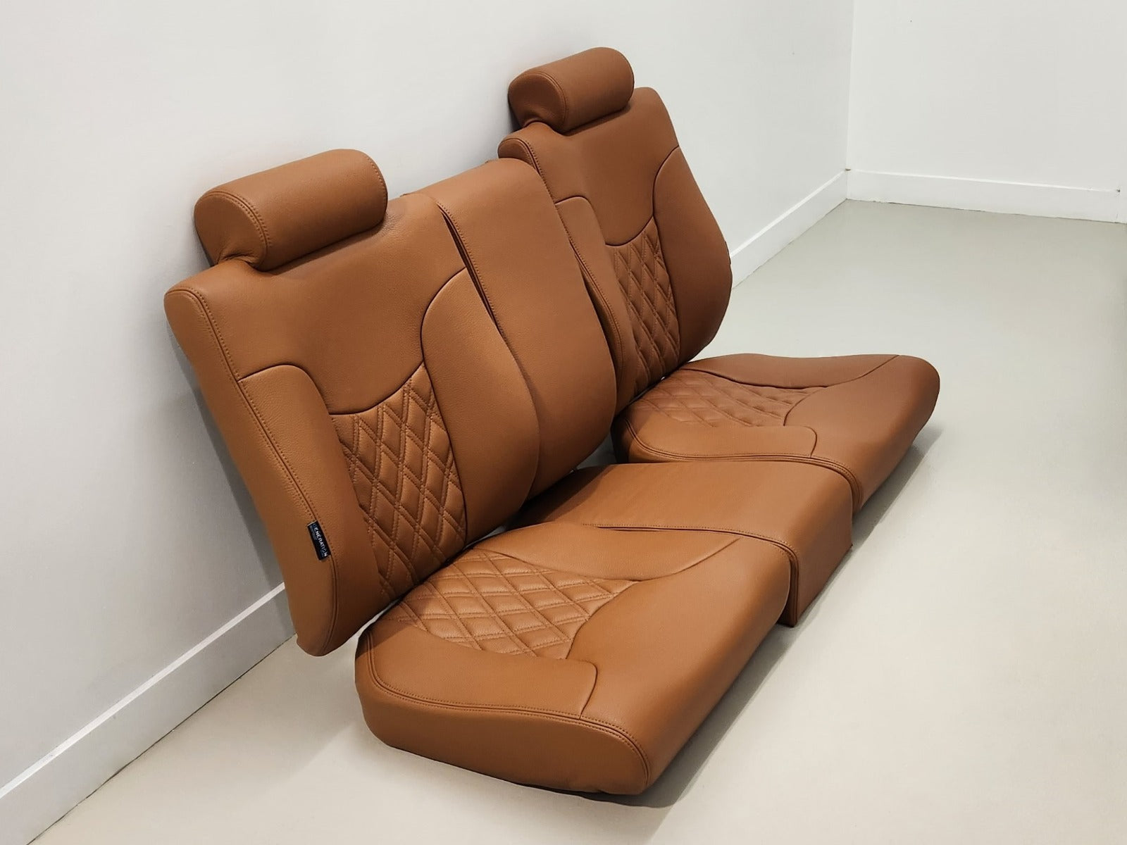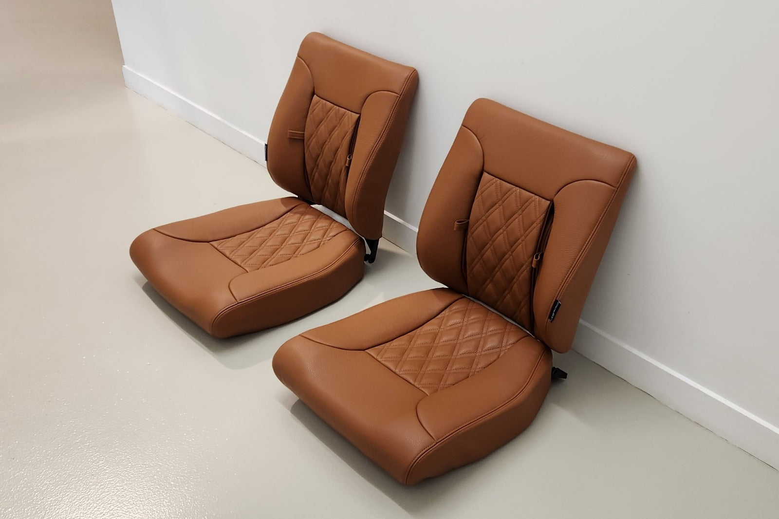 Leather Upholstery: The seats are covered in Italian brown leather (7748), chosen for its strong grain and supple feel, ensuring a snug, durable fit.
