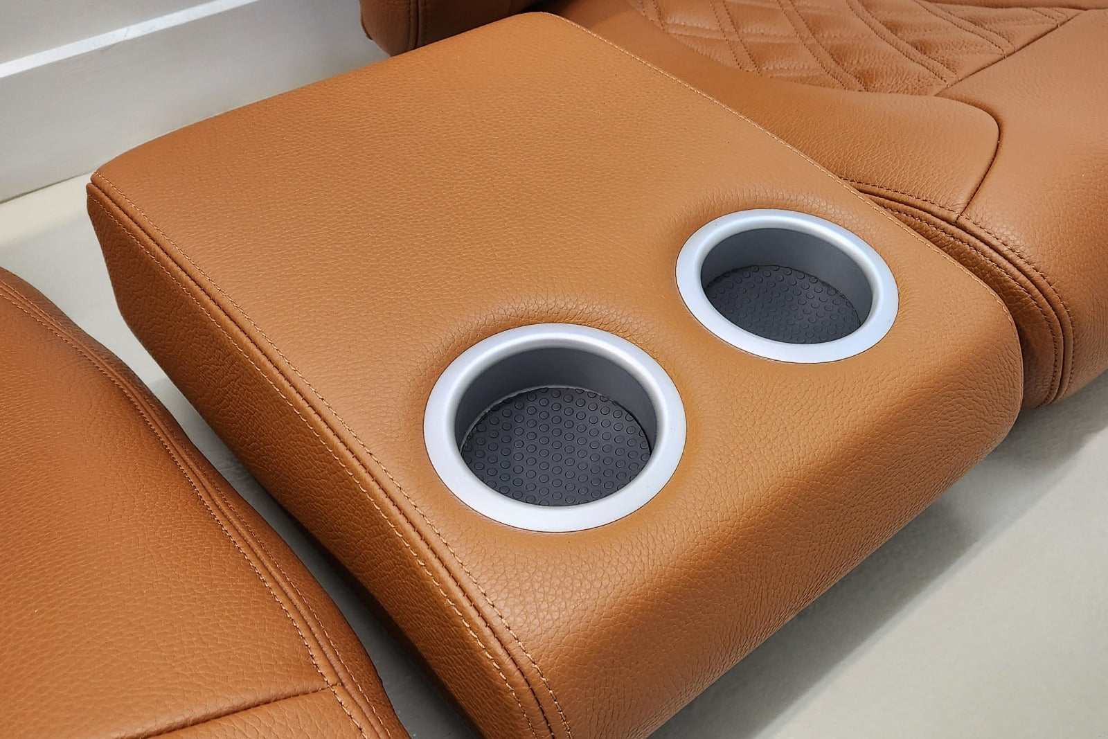 Armrests, door inserts, and the armrest between the aft-facing seats were all wrapped in the same Italian brown leather as the seats, maintaining continuity across the interior.