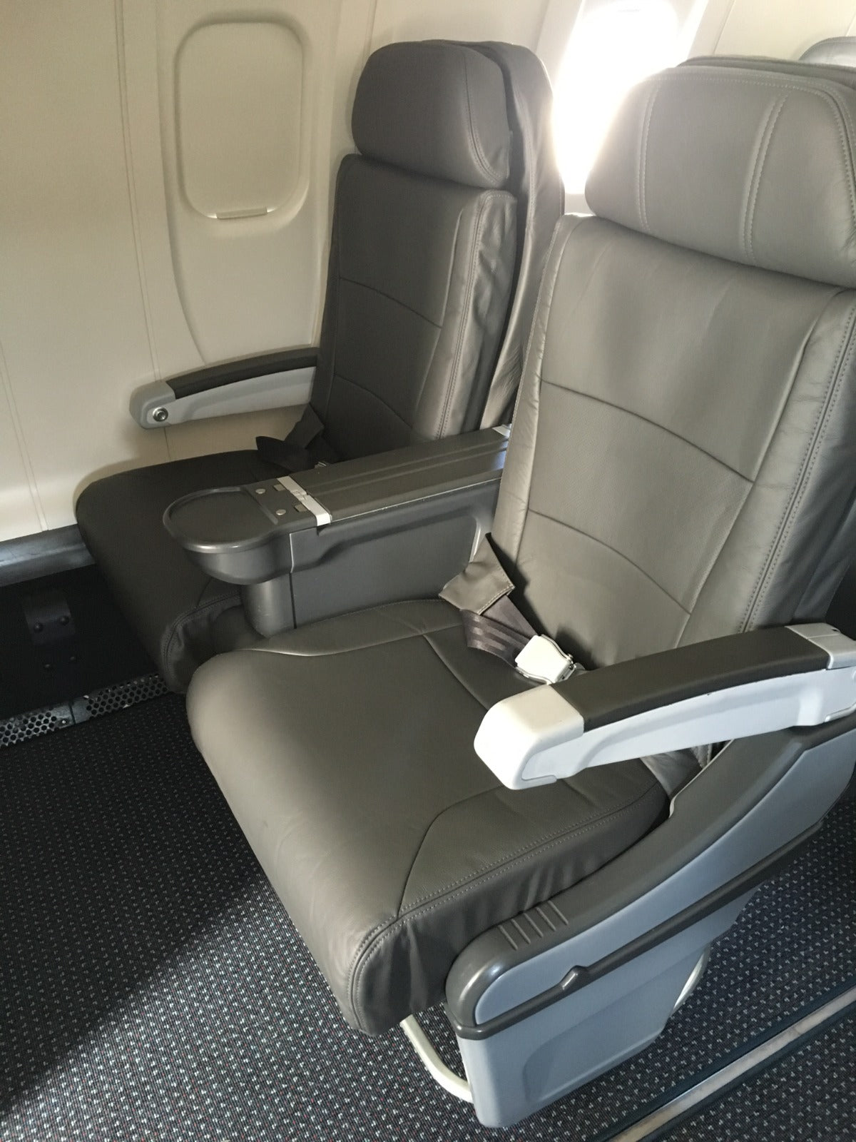 The CRJ-900 features Zodiac Seats as the main seat type, with a 4/Flight seat configuration. The aircraft seating is generally split evenly with two seats on either side of the center aisle, providing a 2-2 seating configuration for the Y-class (economy) section. The seats are leather with laminated faces, and the colorways are customized to match the airline's brand colors.