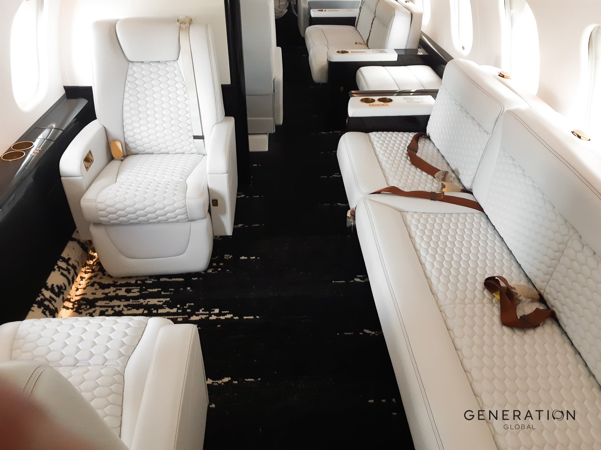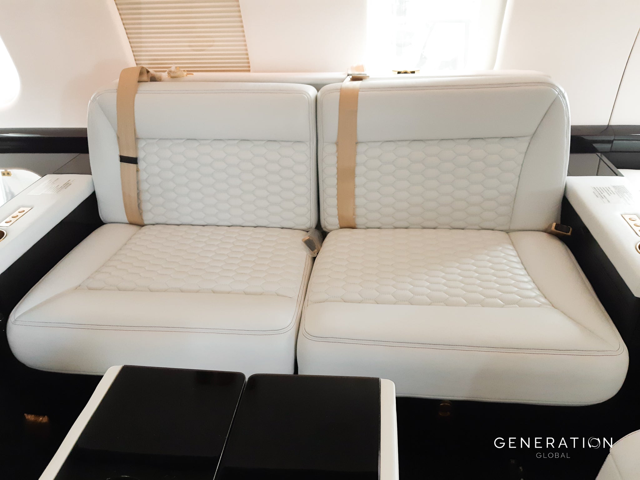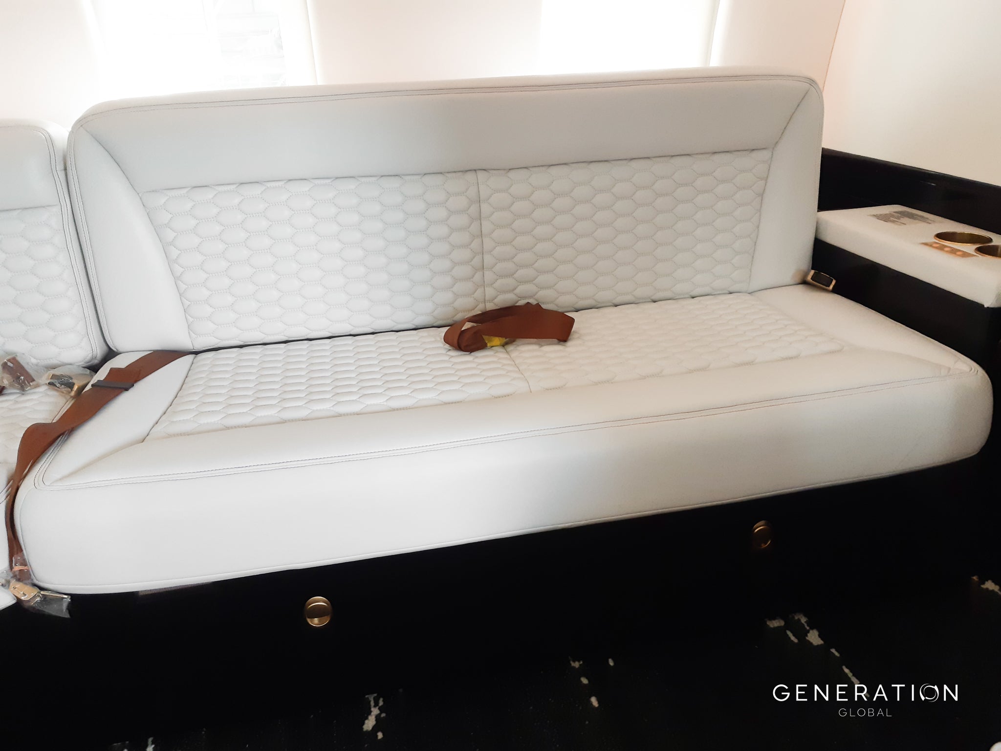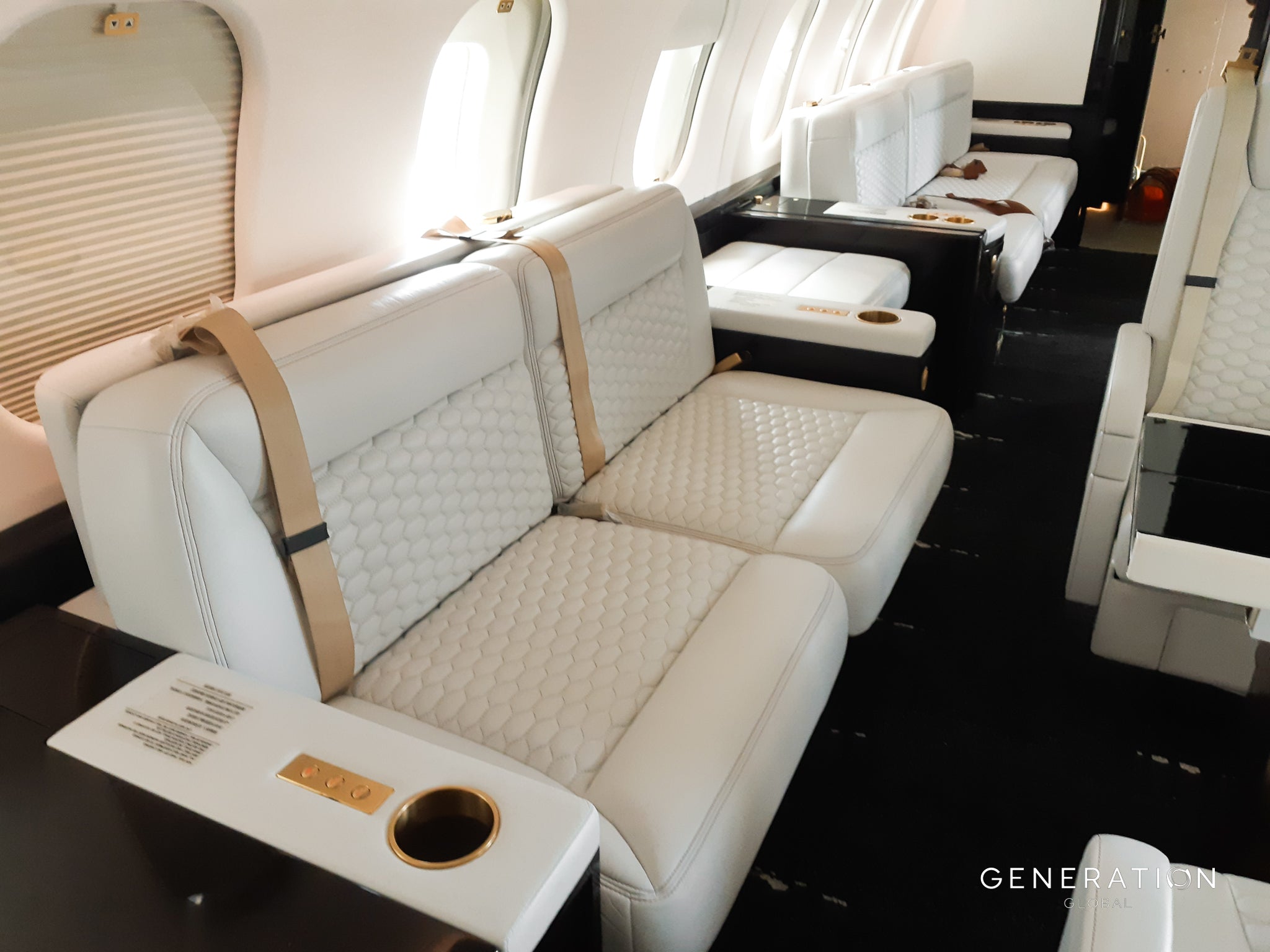 Welcome aboard this refurbished Bombardier Business Jet, where luxury meets comfort. At Generation Global, we pride ourselves on delivering bespoke interior solutions that transform your flying experience.