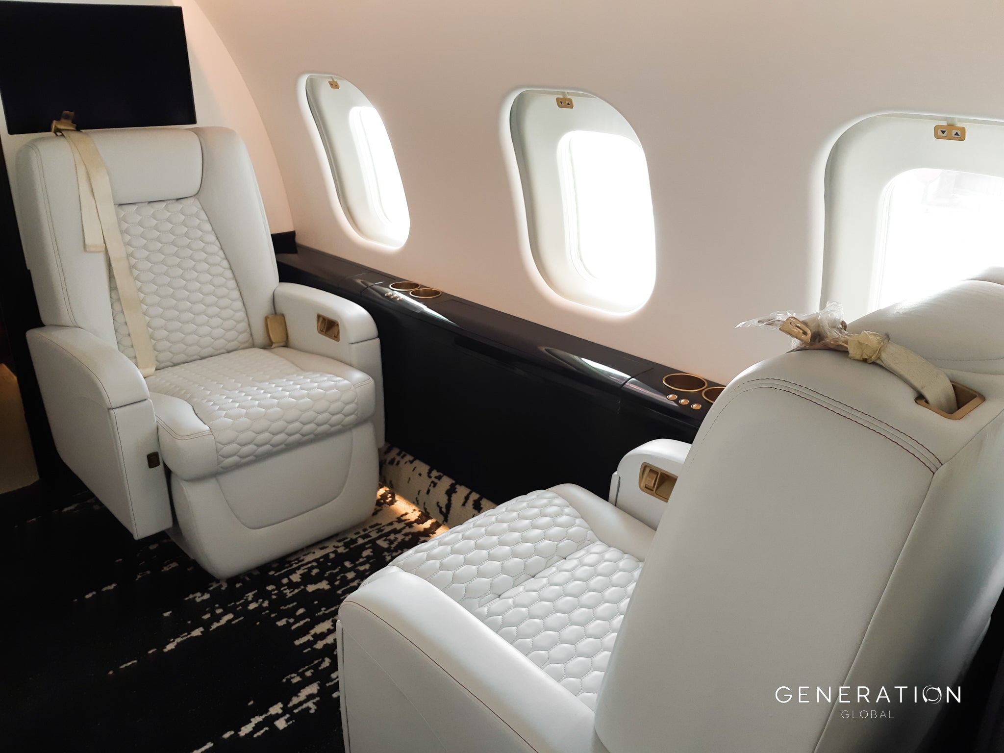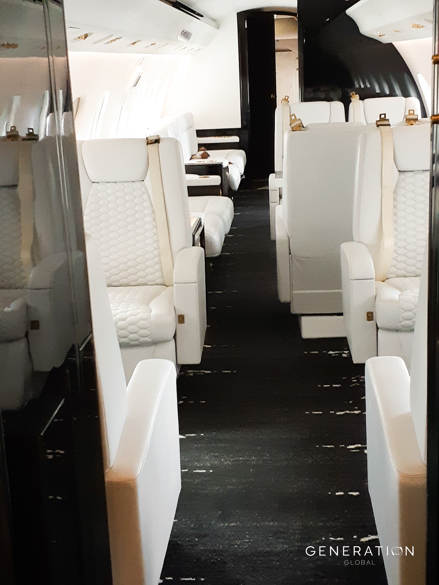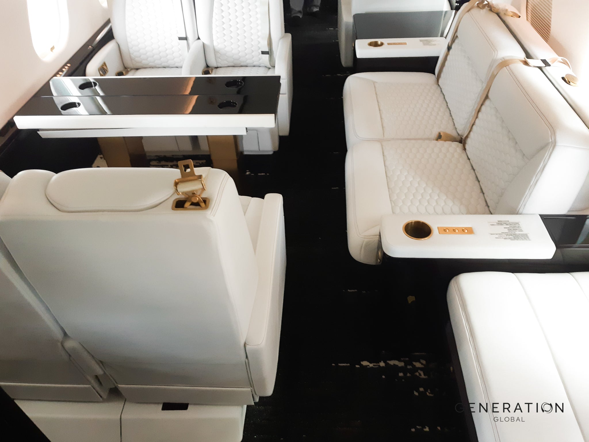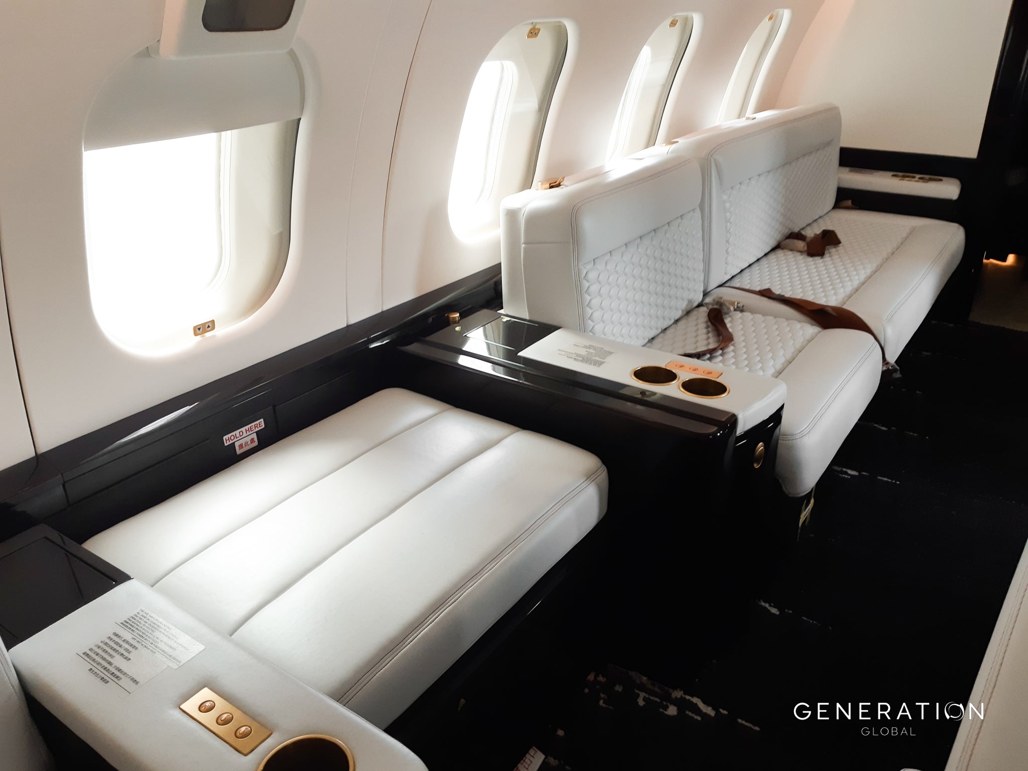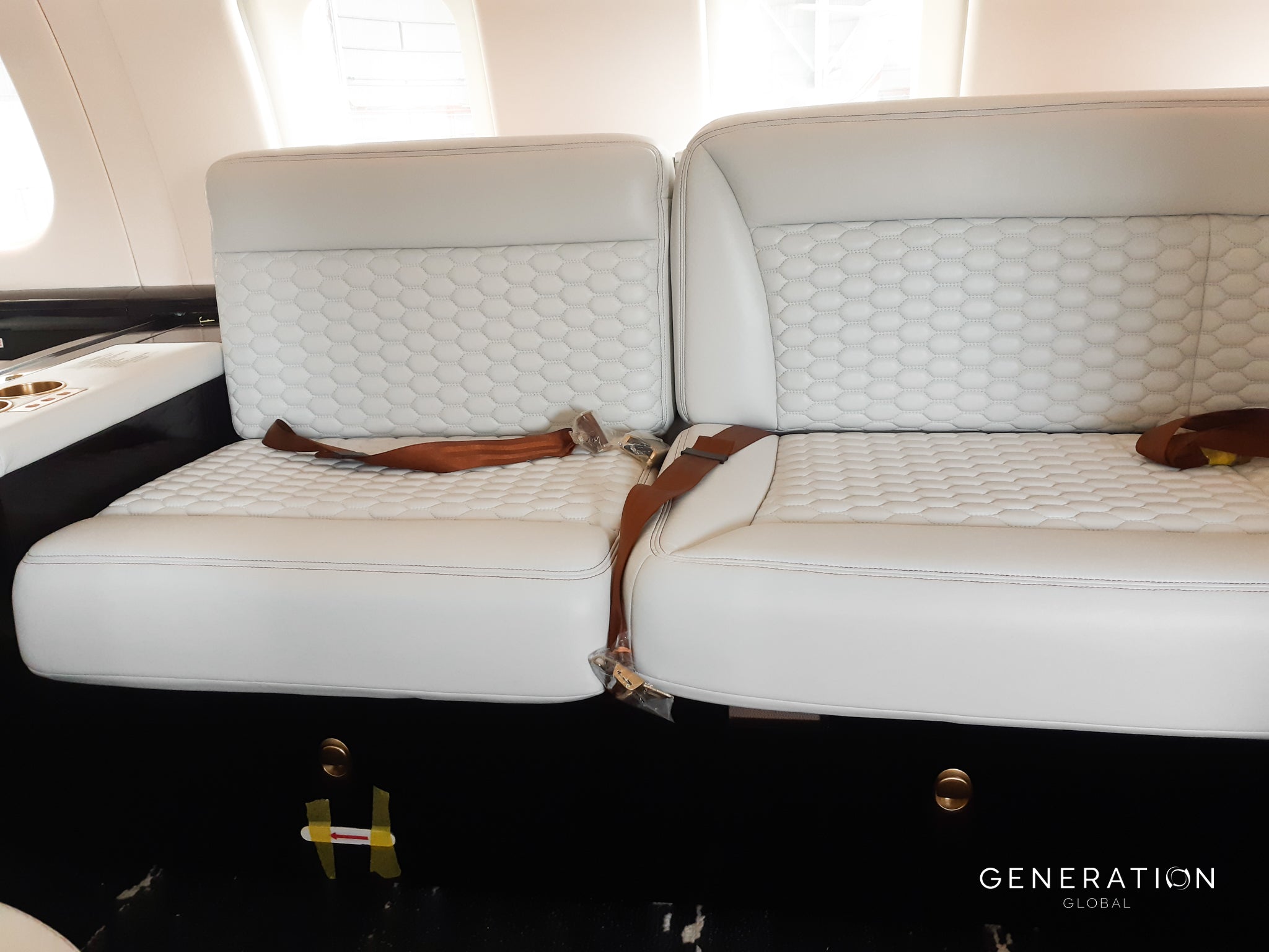 Welcome aboard this refurbished Bombardier Business Jet, where luxury meets comfort. At Generation Global, we pride ourselves on delivering bespoke interior solutions that transform your flying experience.