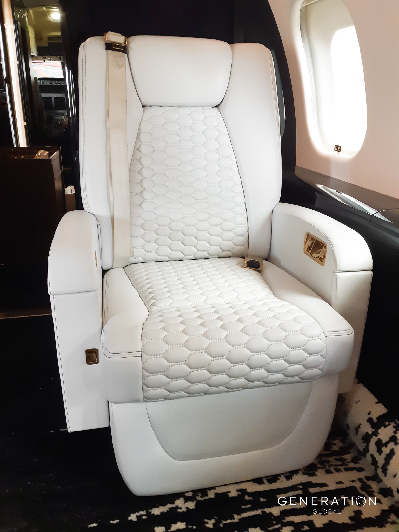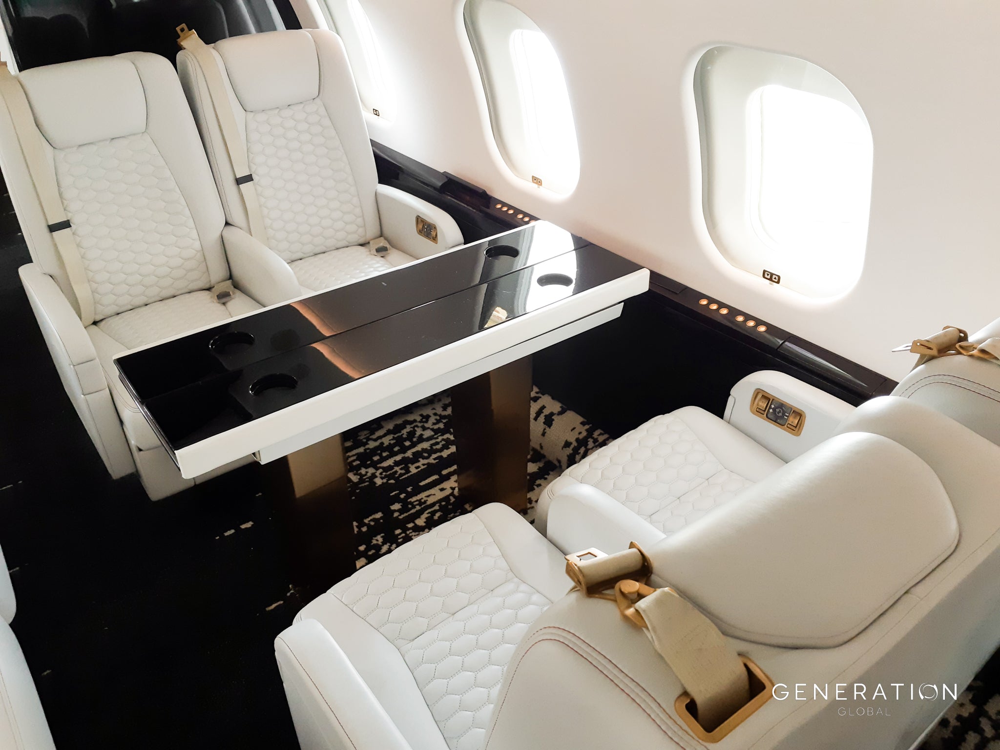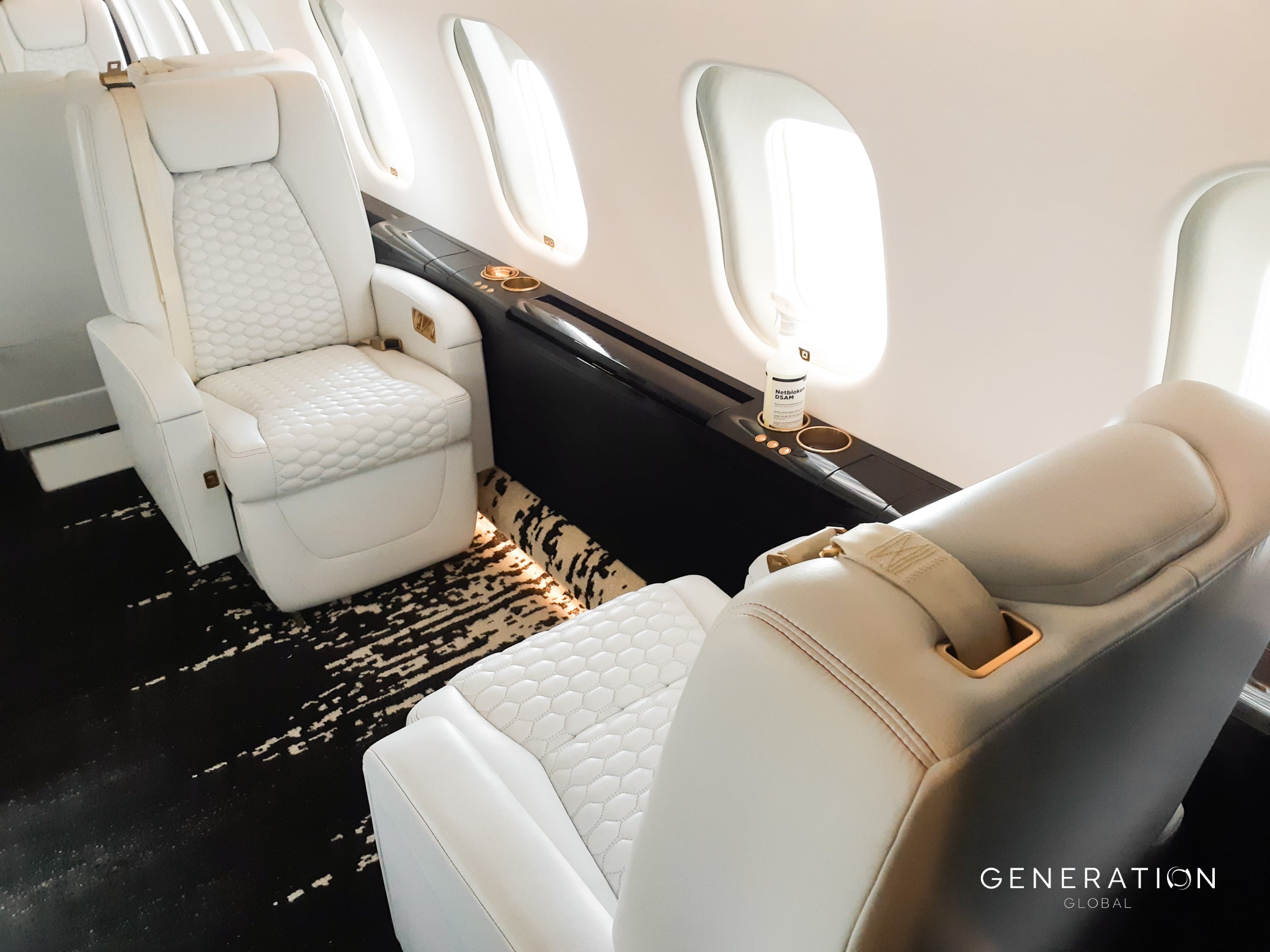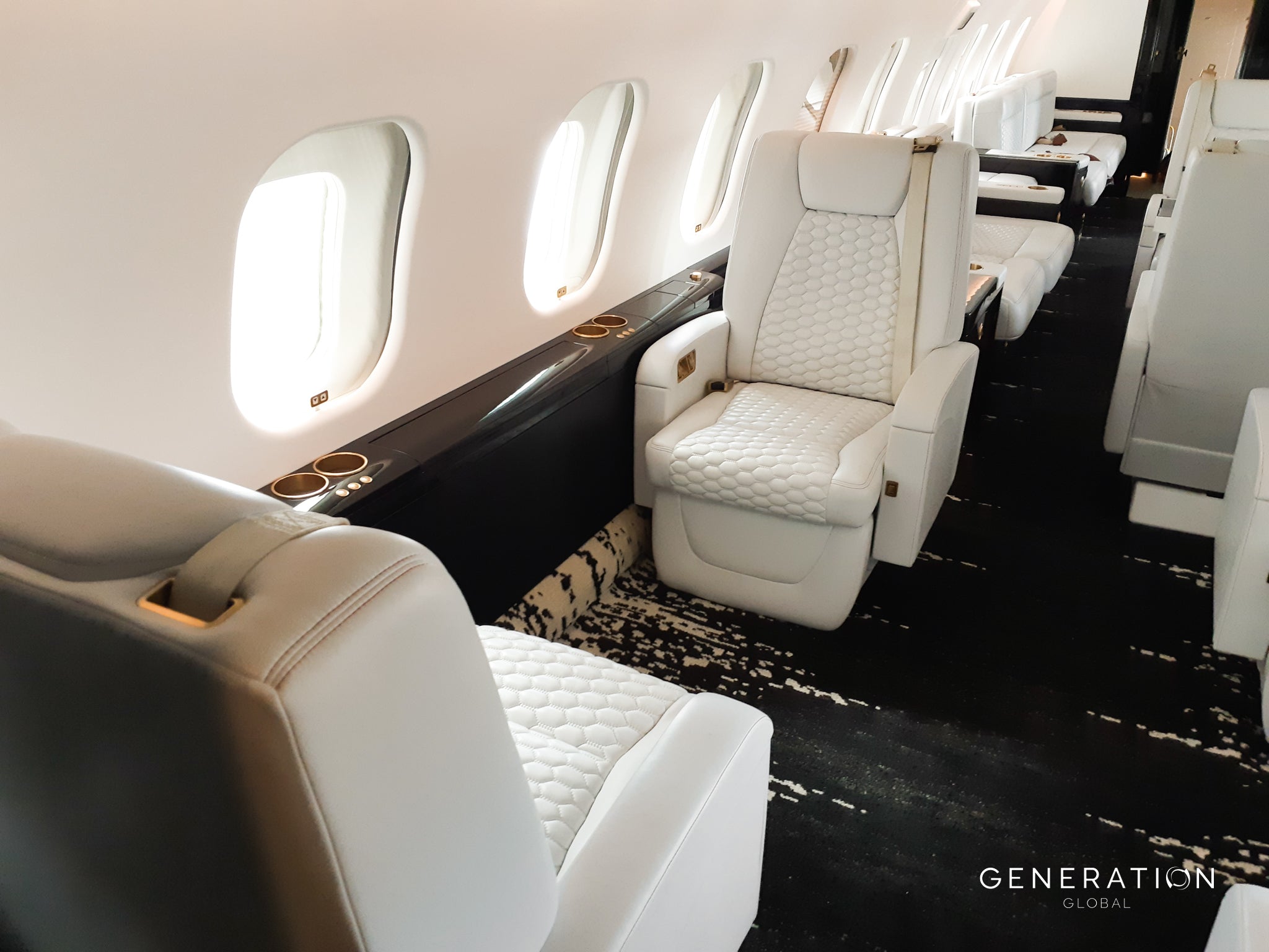 Welcome aboard this refurbished Bombardier Business Jet, where luxury meets comfort. At Generation Global, we pride ourselves on delivering bespoke interior solutions that transform your flying experience.