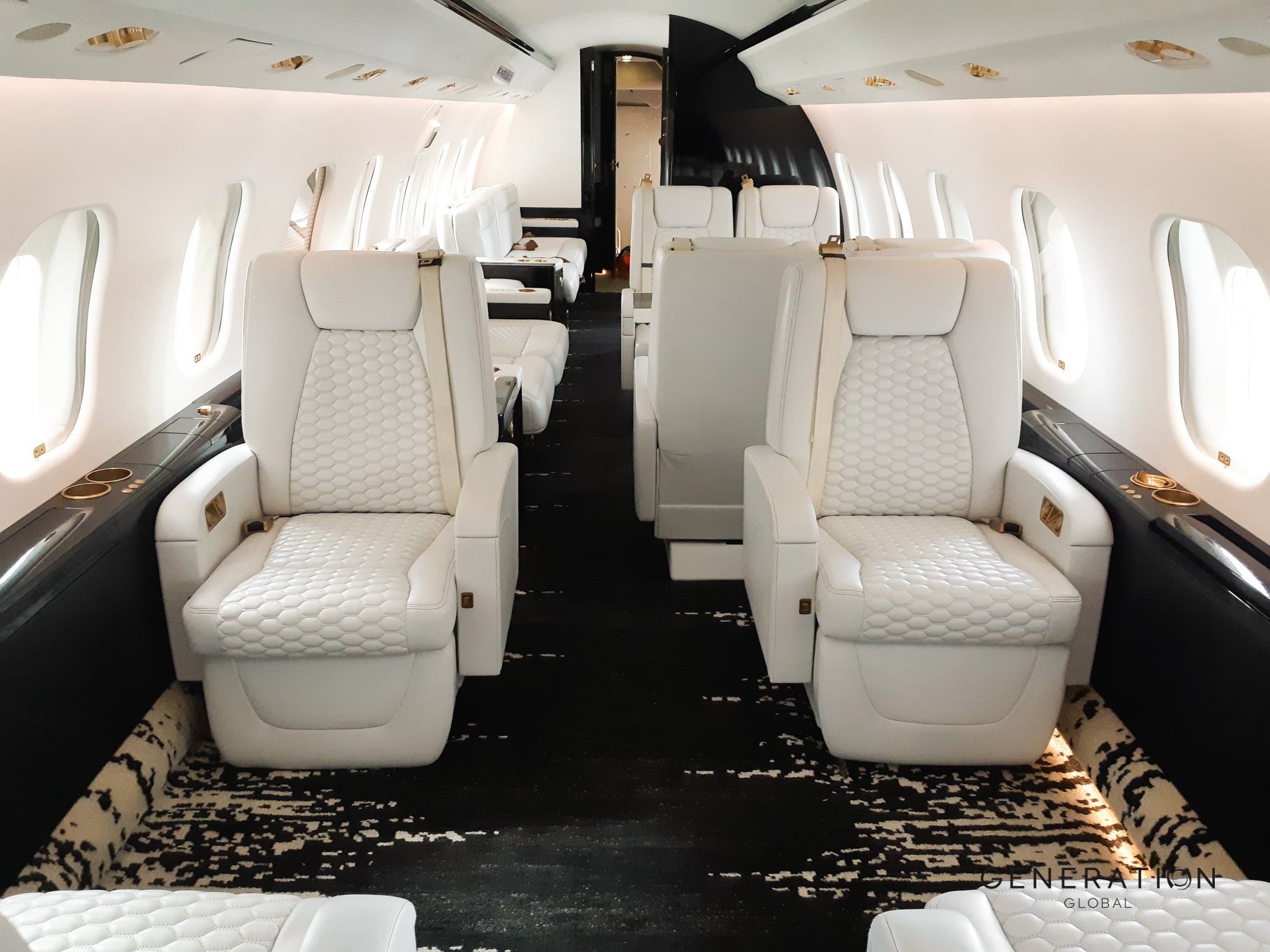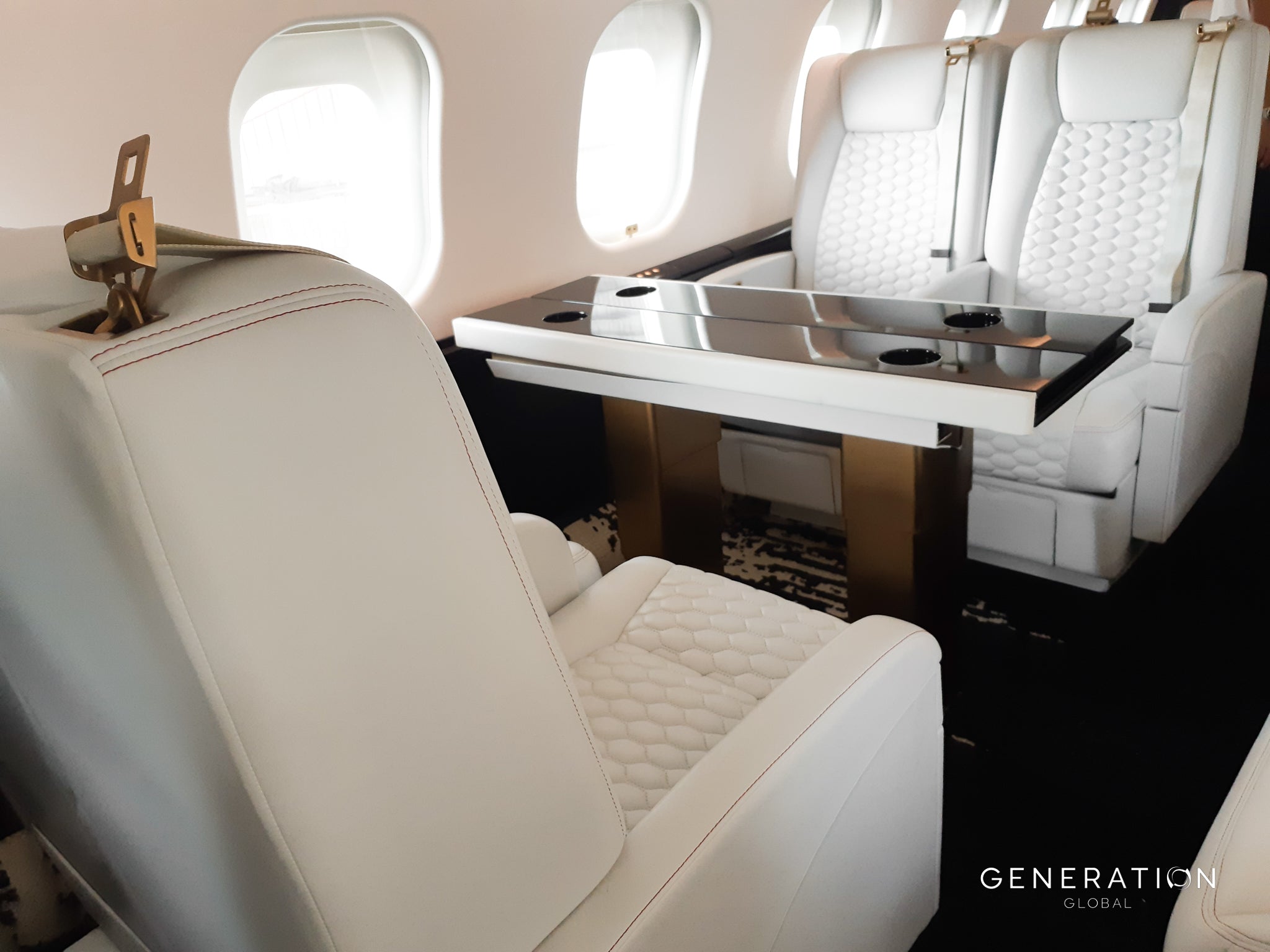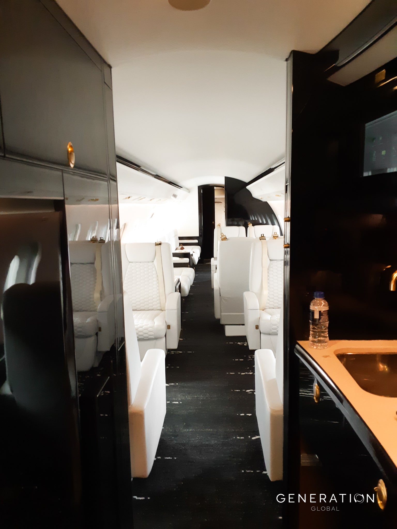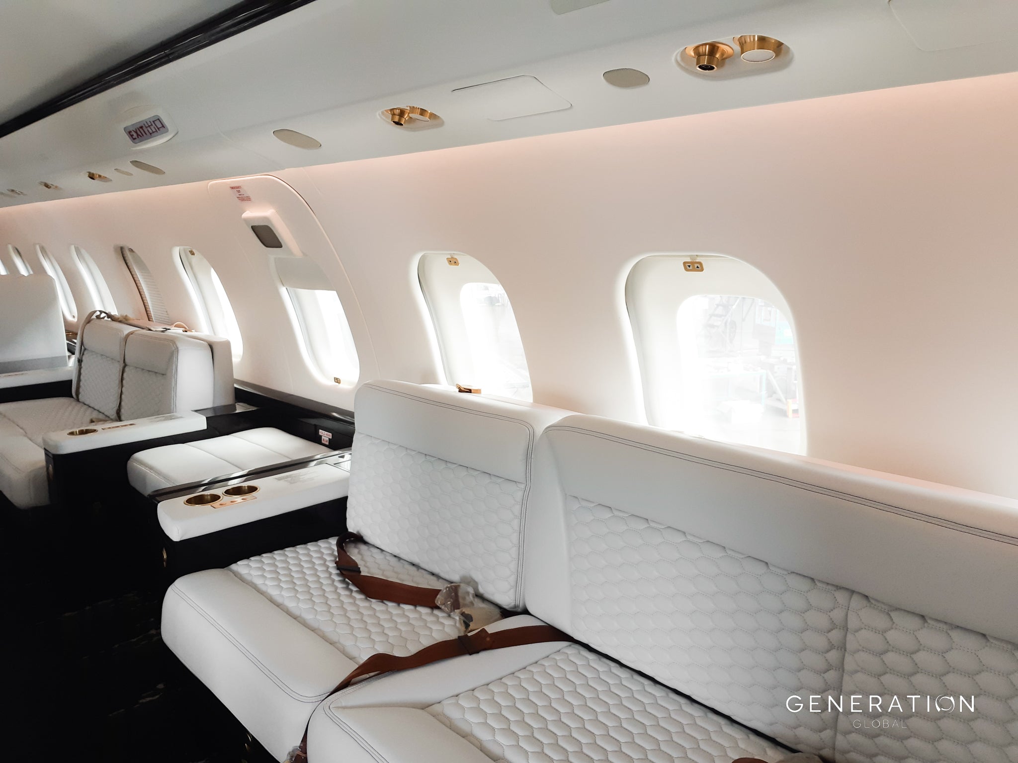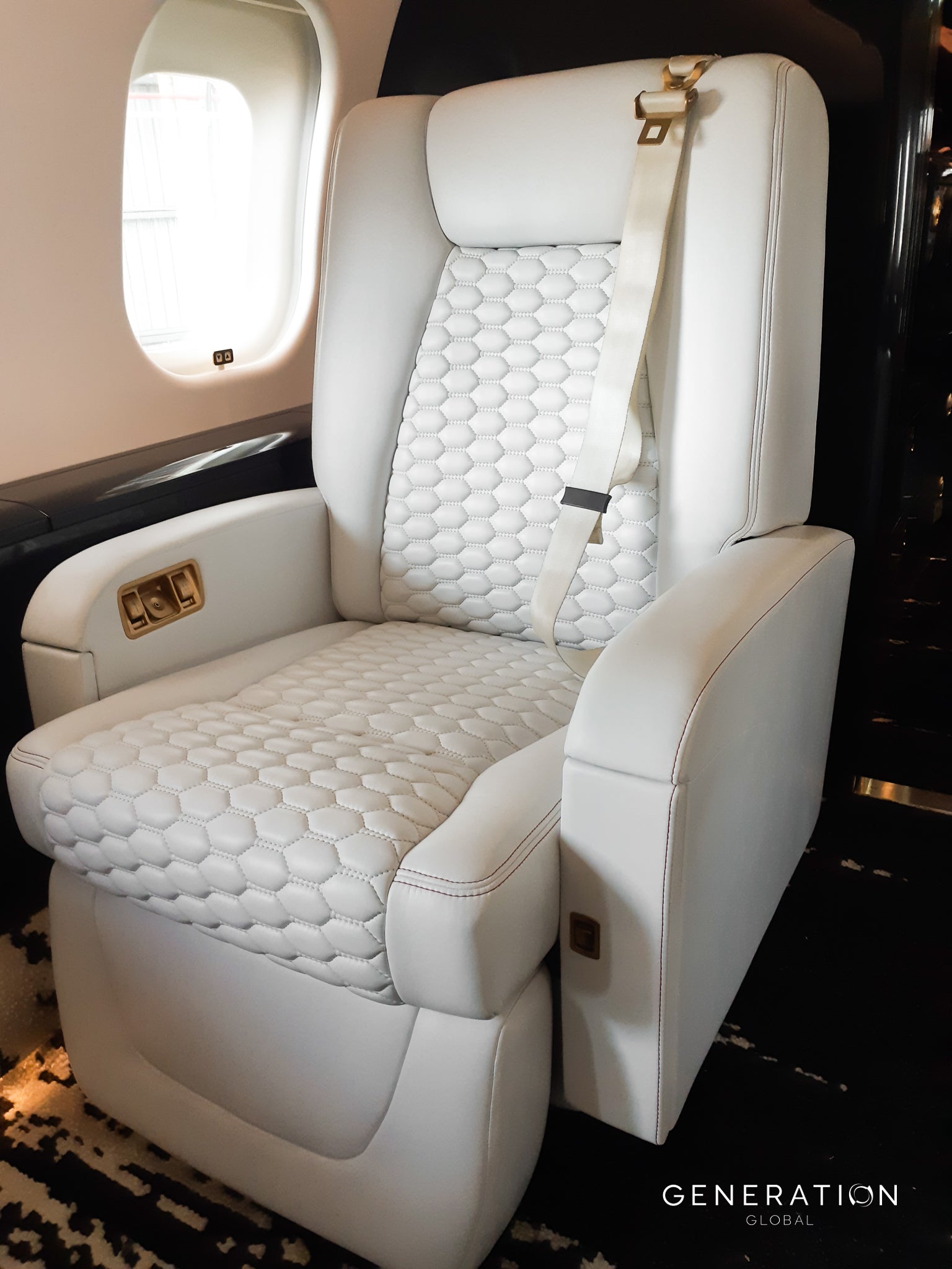Welcome aboard this refurbished Bombardier Business Jet, where luxury meets comfort. At Generation Global, we pride ourselves on delivering bespoke interior solutions that transform your flying experience.