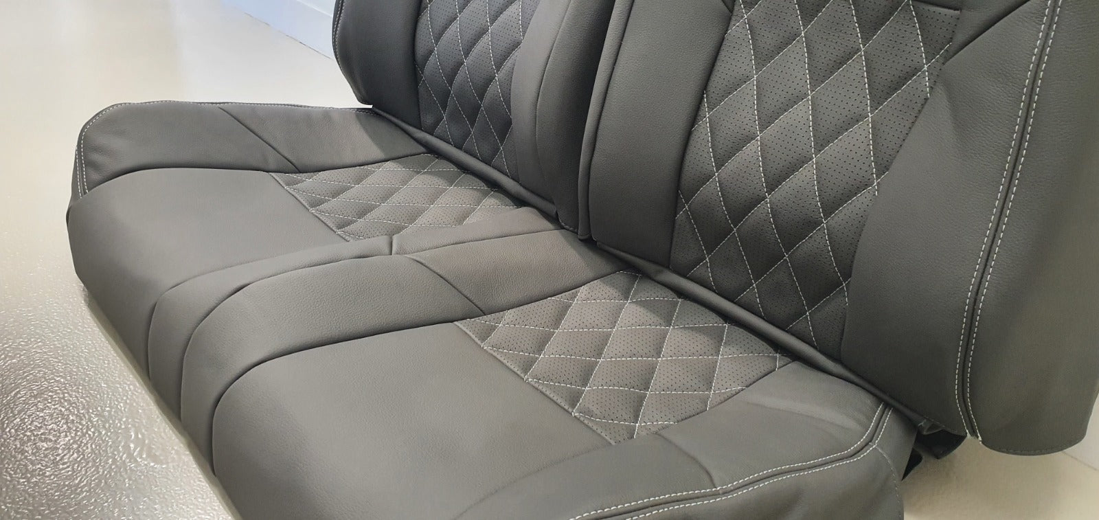 The seats were upholstered in Charcoal Grey (ADI-1121) aviation leather, with centre inserts showcasing Diamond (SA001) quilting on perforated leather.