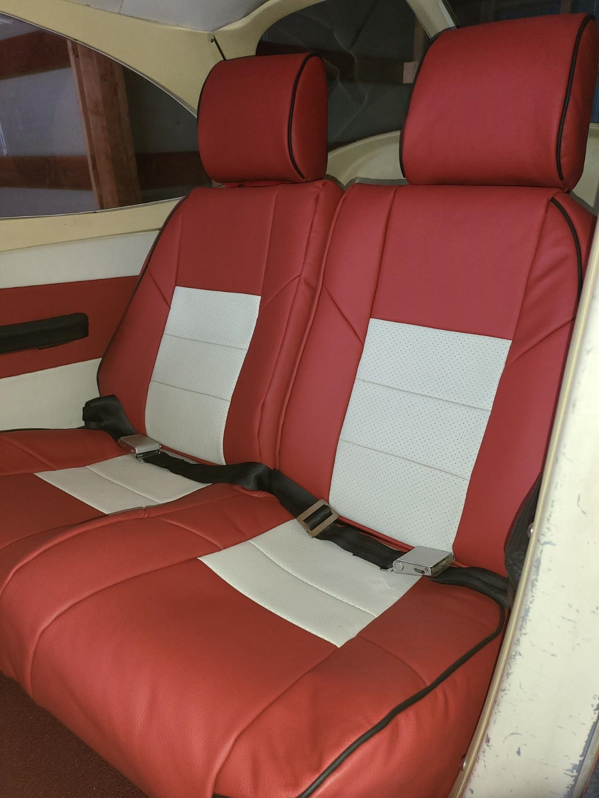 The interior kit featured early C172 seat upholstery, which included two crew seats and a rear bench seat with separate seatbacks. The rear bench seatβs base upholstery was carefully bolstered with a seam that split the seats at their highest point, creating a clean, distinct look.