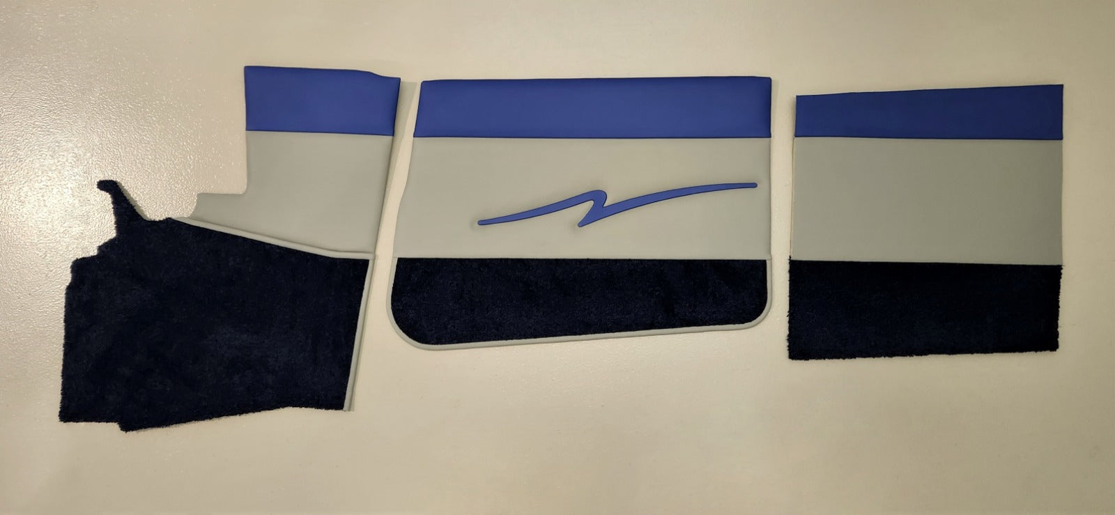 We used titanium grey microfibre leather for the central panel of the sidewalls, while the top layer was crafted from marine leather (SF-104) for durability and a luxurious feel. The bottom section of the sidewall was covered in Royal carpet (WN-120), with the edges bound in the same titanium grey microfibre leather, ensuring a cohesive and high-end look.