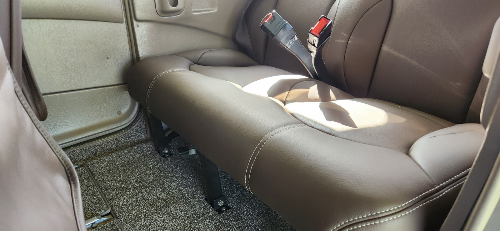 The side trim plastics were carefully repaired and repainted before being rewrapped in a broad-patterned vinyl. Chocolate leather decorative inserts were added to the sidewall panels to match the seats, with armrests wrapped in complementary matching vinyl. The draft extruder around the door was also treated to blend seamlessly with the overall aesthetic.