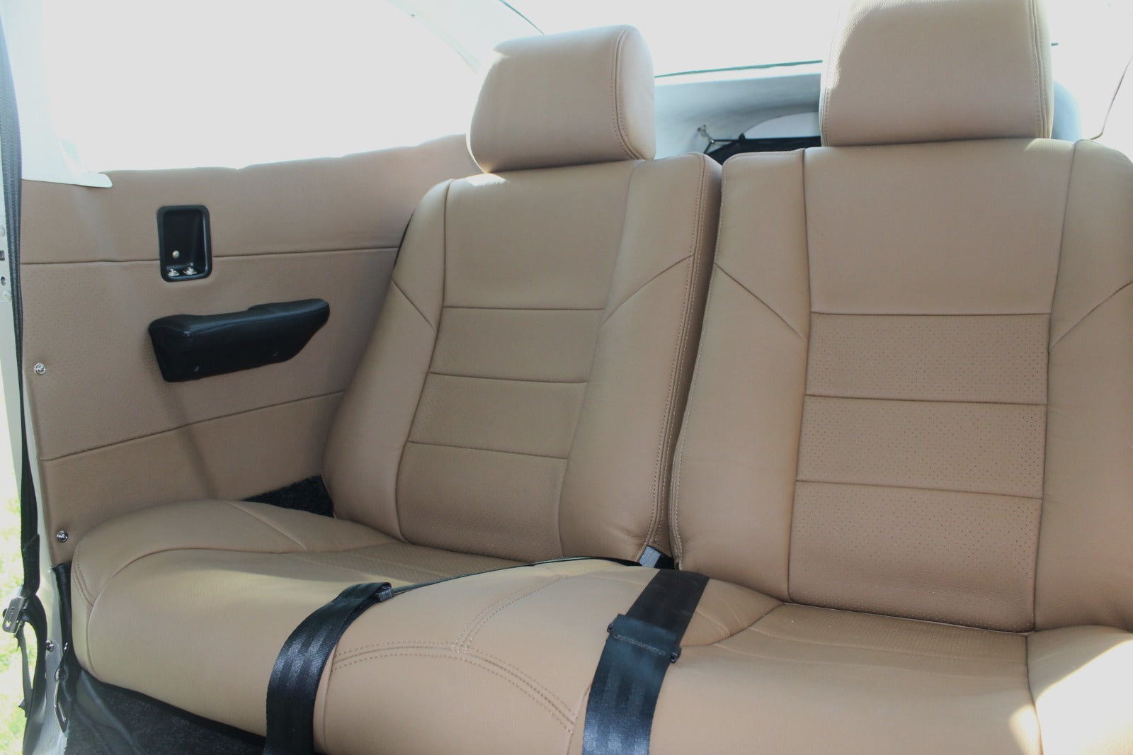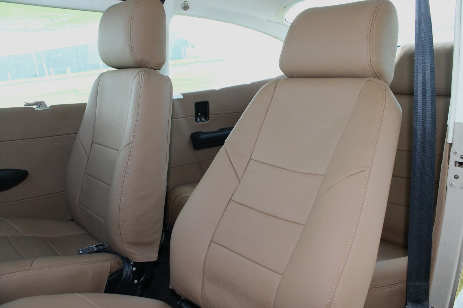 The Cessna 182TR features a classic seating configuration with two crew seats in the front and a bench seat with a split backrest in the rear. For this refurbishment, the Generation Global team provided new backrest and bottom cushions made from Genlite foam for superior comfort and durability. The upholstery was crafted from high-quality saddle brown (ADI 4111) leather with elegant perforated (SP1) leather inserts for a sleek and modern look.