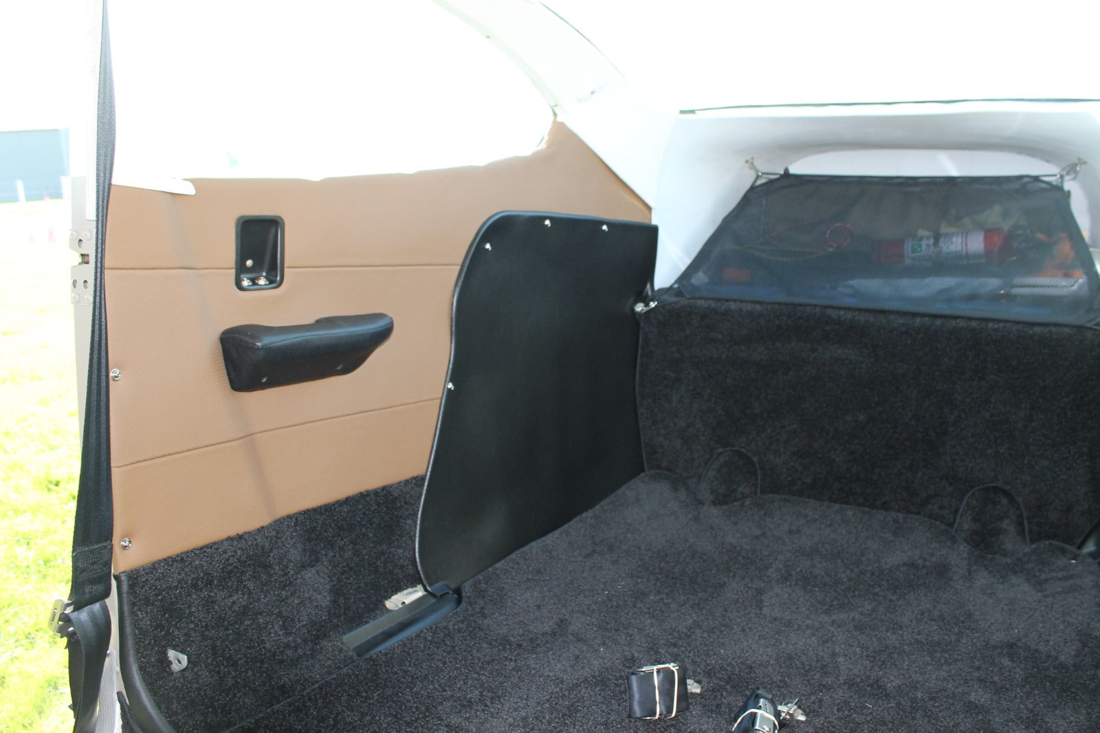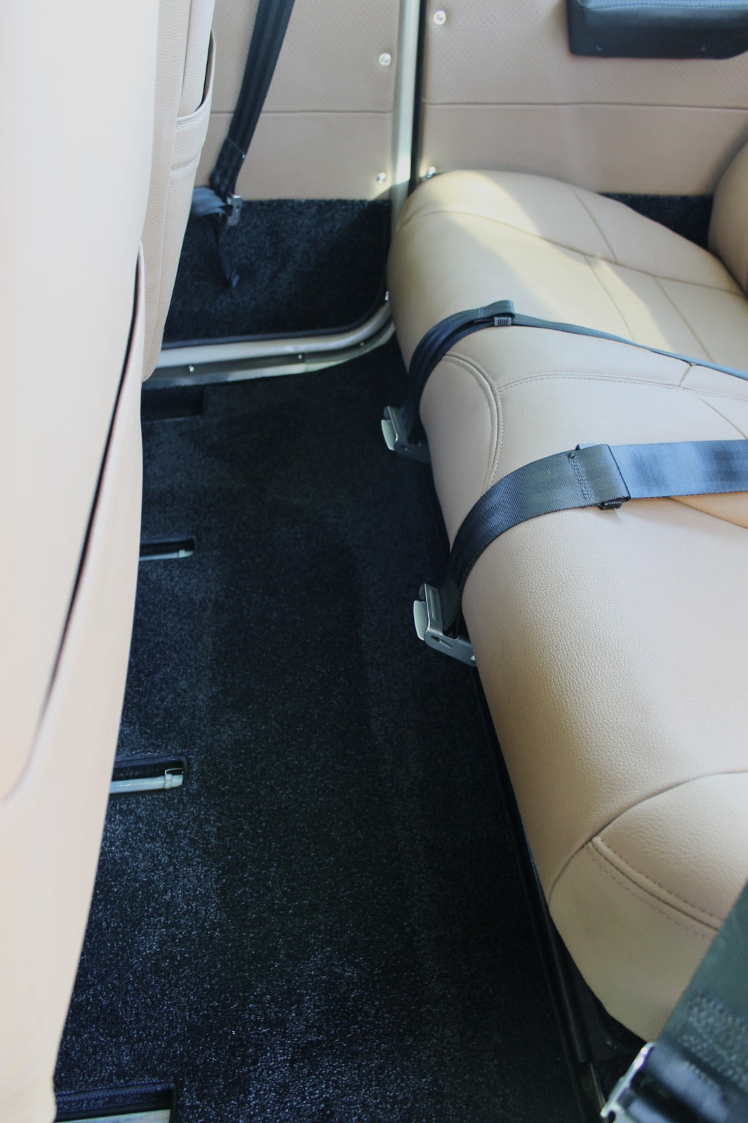 For the aircraft’s floor coverings, we supplied Black City carpet with matching black binding. The carpet was custom designed for the Cessna 182TR, including precise cutouts for seat tracks and rear bench seat attachment points. A full carpet mat extends from the back of the aircraft doors to the rear, while another mat covers the rear wall and the luggage compartment.