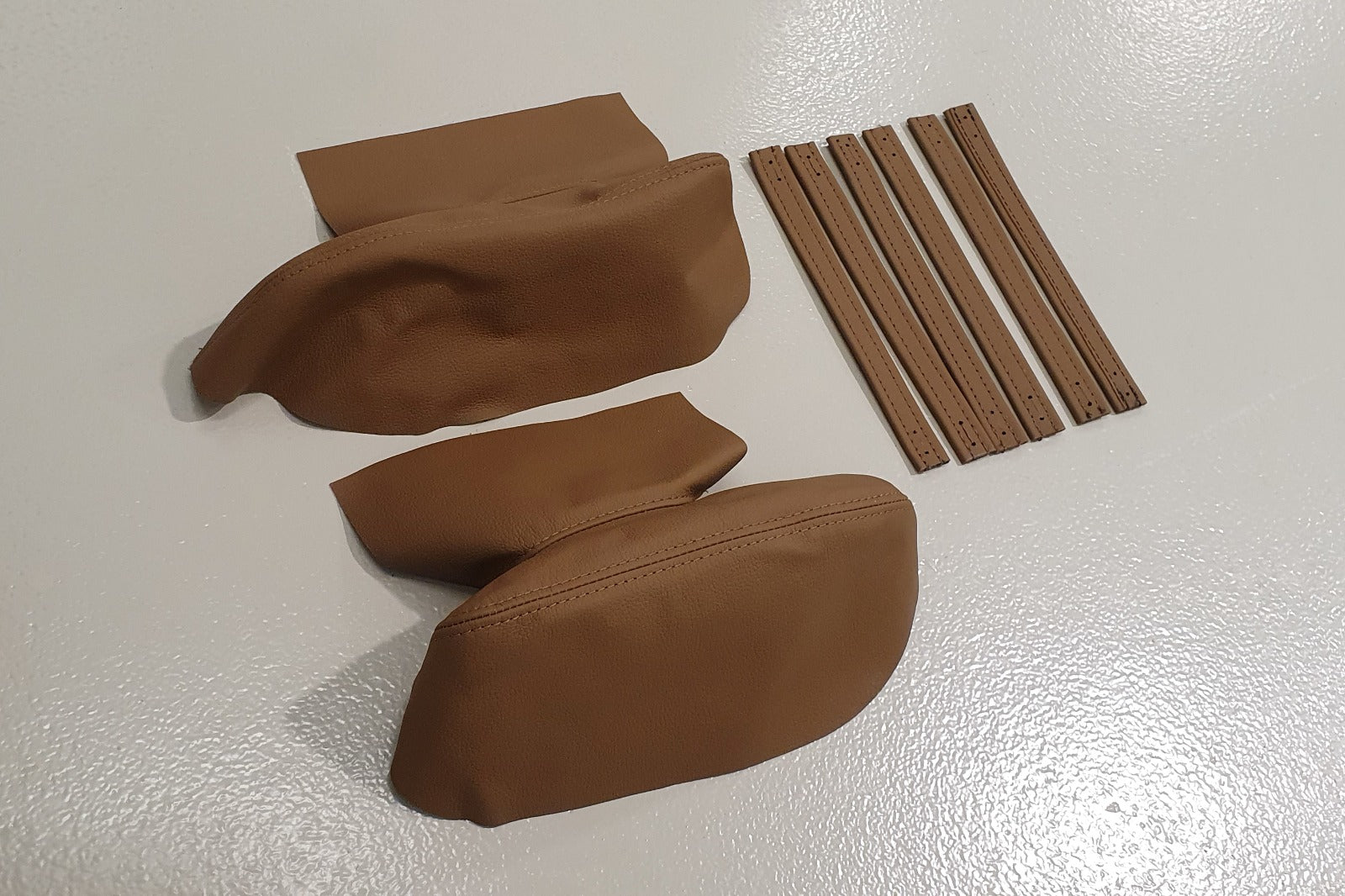 Pull Handles & Armrests: Wrapped in the same Saddle Brown leather, each piece was precision-stitched using matching thread for a seamless appearance. Designed to slide perfectly over existing hardware, these parts brought cohesion and refinement to the cabin space.