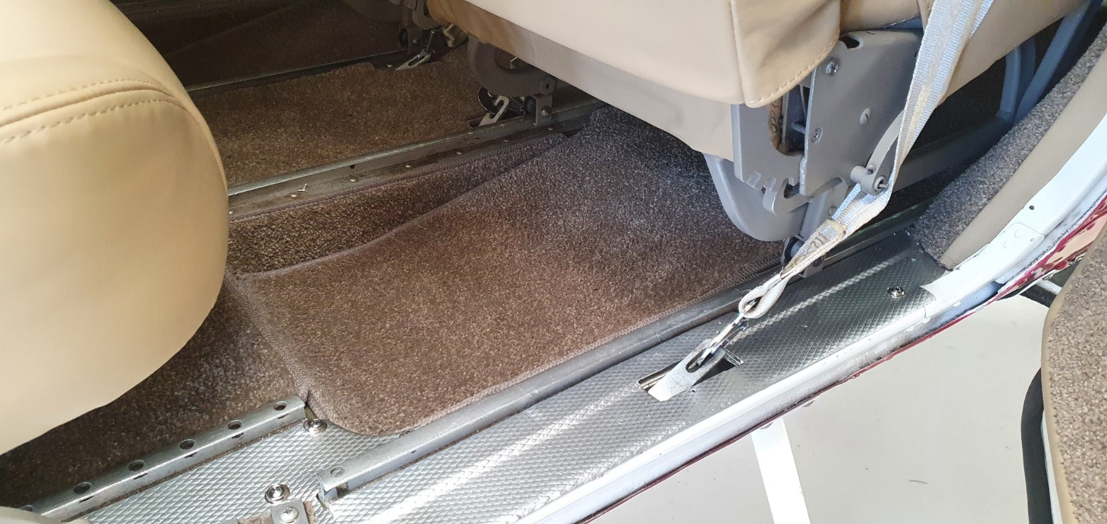For the flooring, the customer selected Genflor Zimmer carpet in Clay Brown, with matching brown bindings to complete the design. The lower sidewalls featured a seamless transition between leather and carpet, tying the interior together. The Cessna seats were mounted on the standard slide rails, with carpets custom-tailored around the inset floor area.