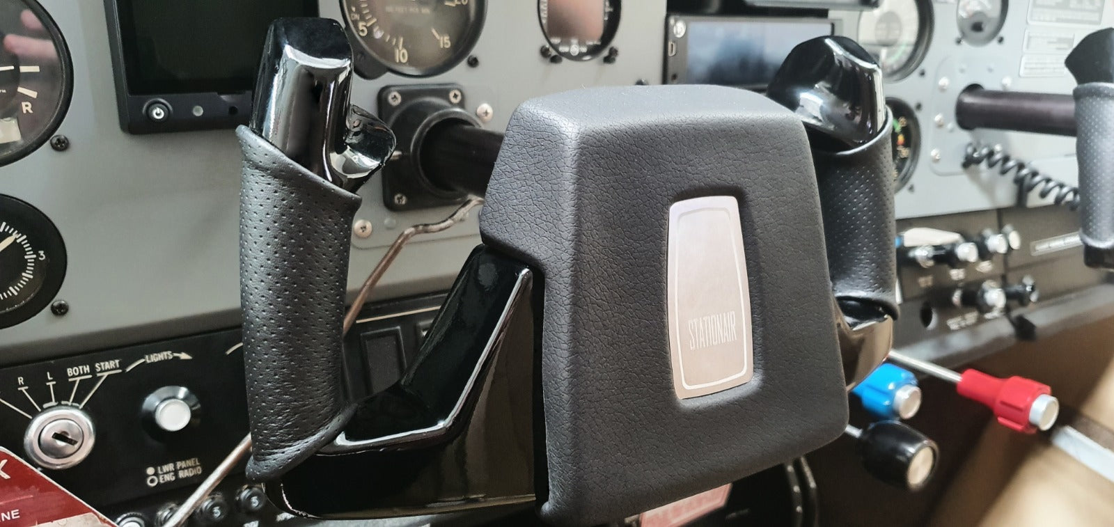 To finish the interior upgrade, we wrapped the glareshield and yokes in black vinyl and added perforated black leather hand grips to the yokes for a sleek, classy finish.