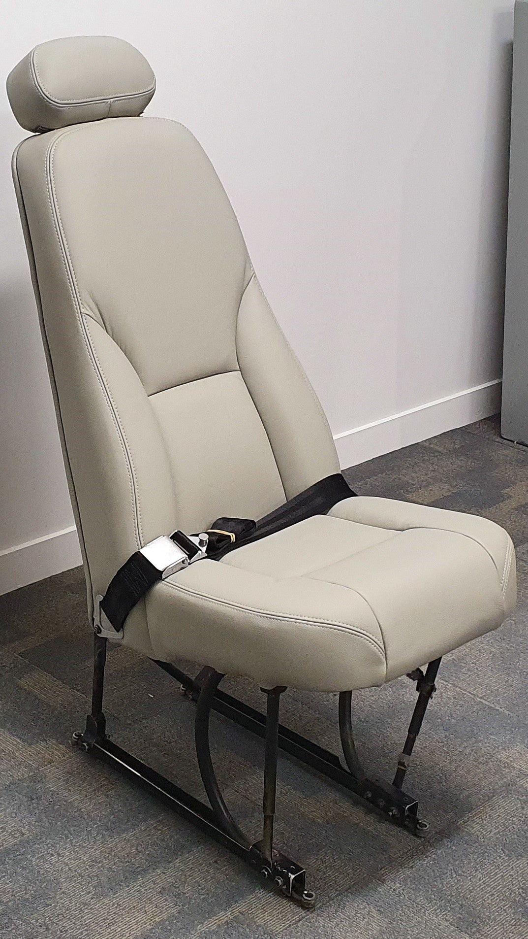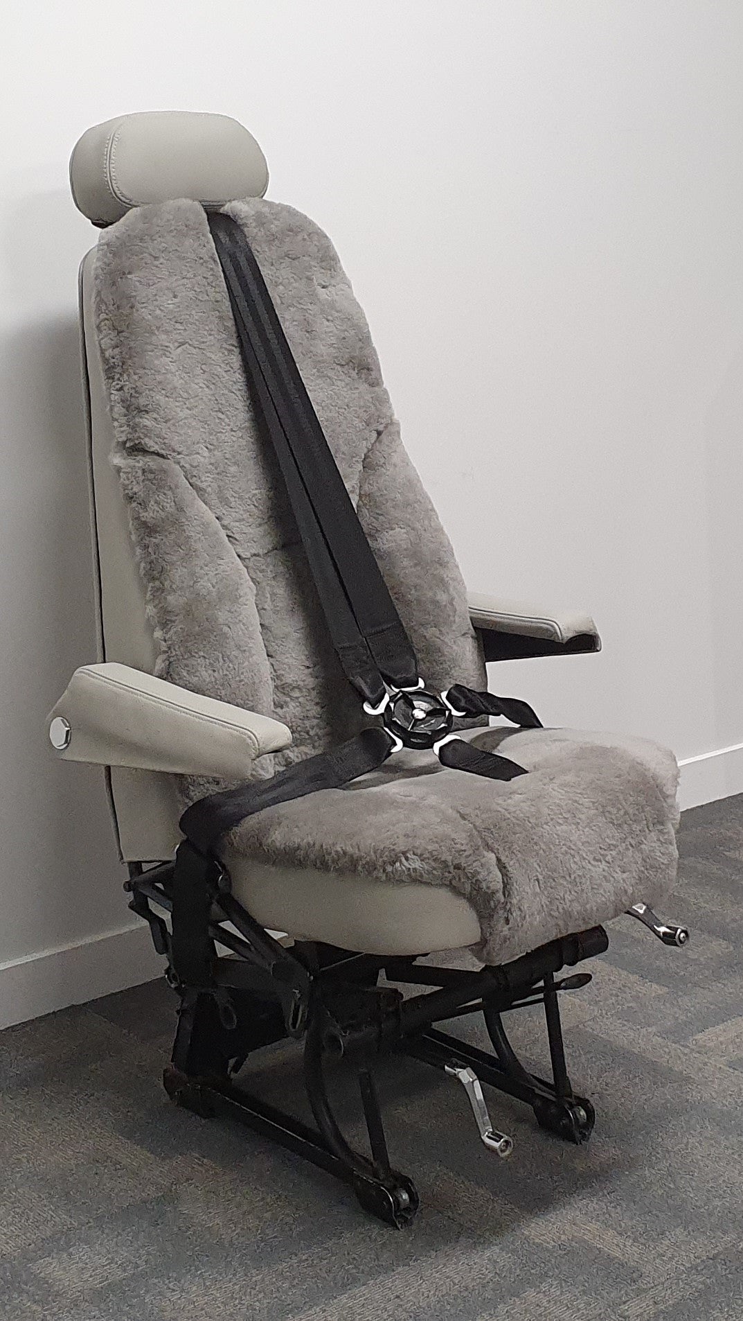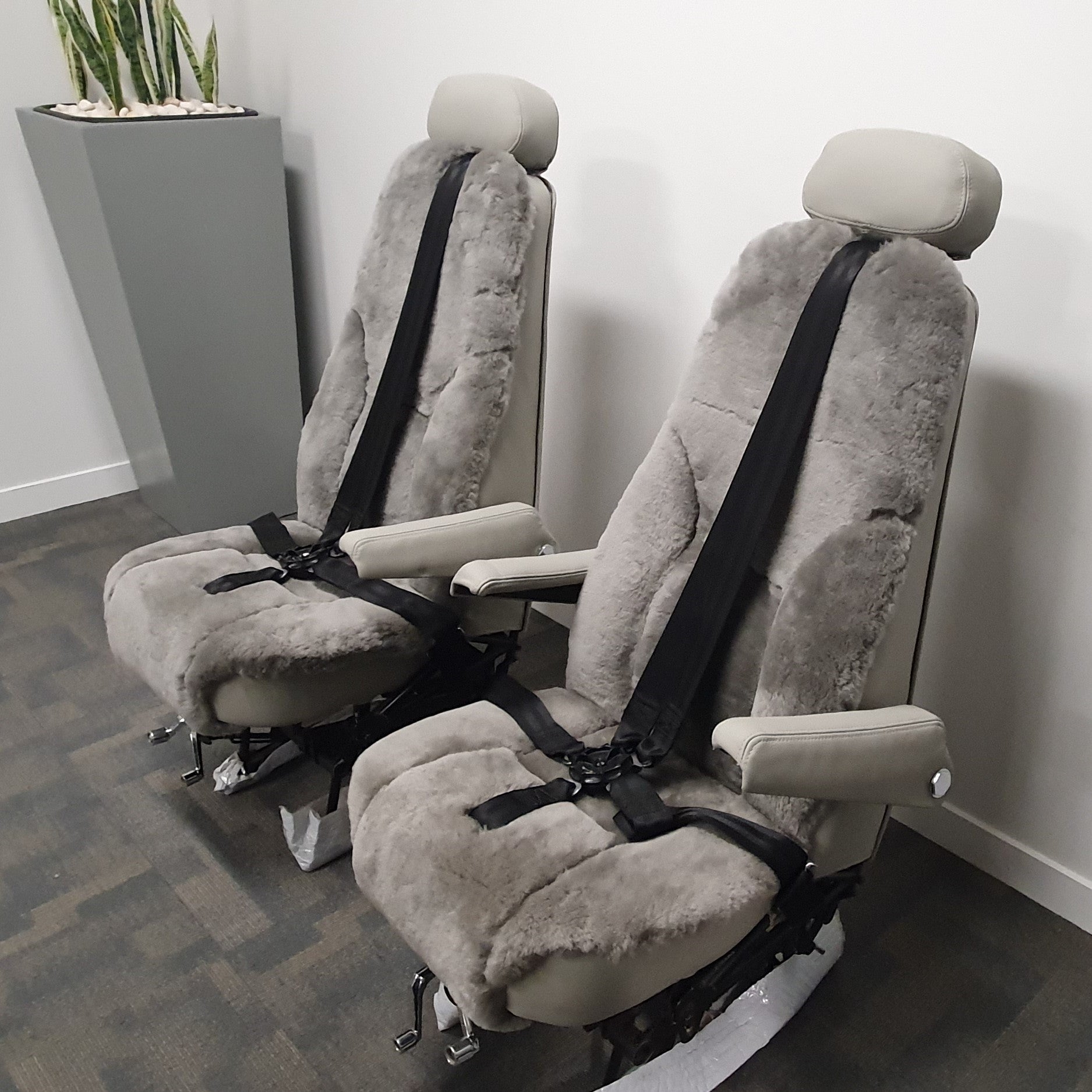 The crew seat covers were manufactured using a combination of Oxford Grey sheepskin on the seating faces, paired with Portland Grey (JLS722) aviation leather on the side borders, back panels, armrests, and headrests. These seats were fully refurbished from the frame up, including new foam cushions, offering enhanced support and long-lasting comfort for pilots. -