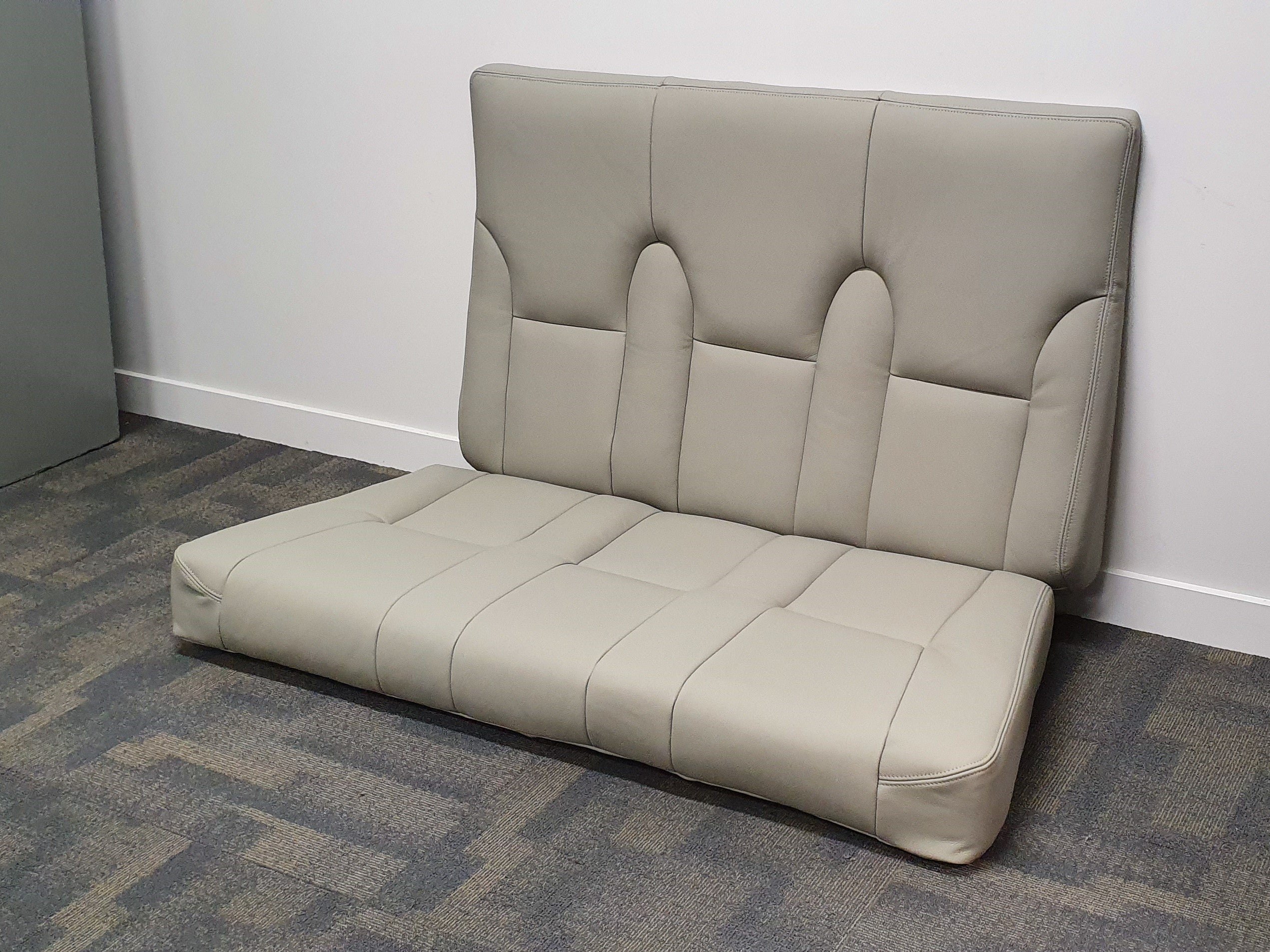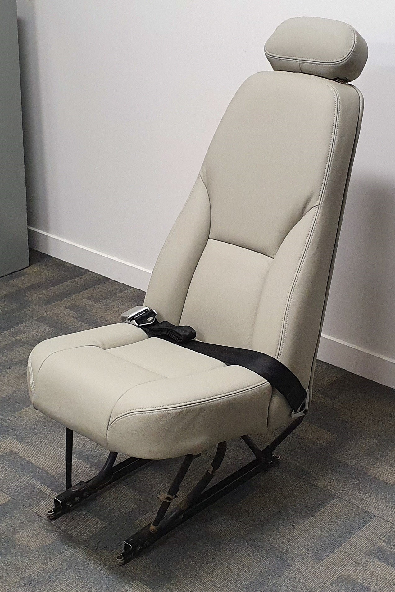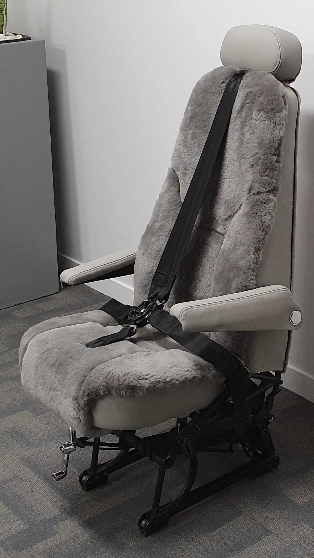 The crew seat covers were manufactured using a combination of Oxford Grey sheepskin on the seating faces, paired with Portland Grey (JLS722) aviation leather on the side borders, back panels, armrests, and headrests. These seats were fully refurbished from the frame up, including new foam cushions, offering enhanced support and long-lasting comfort for pilots. -