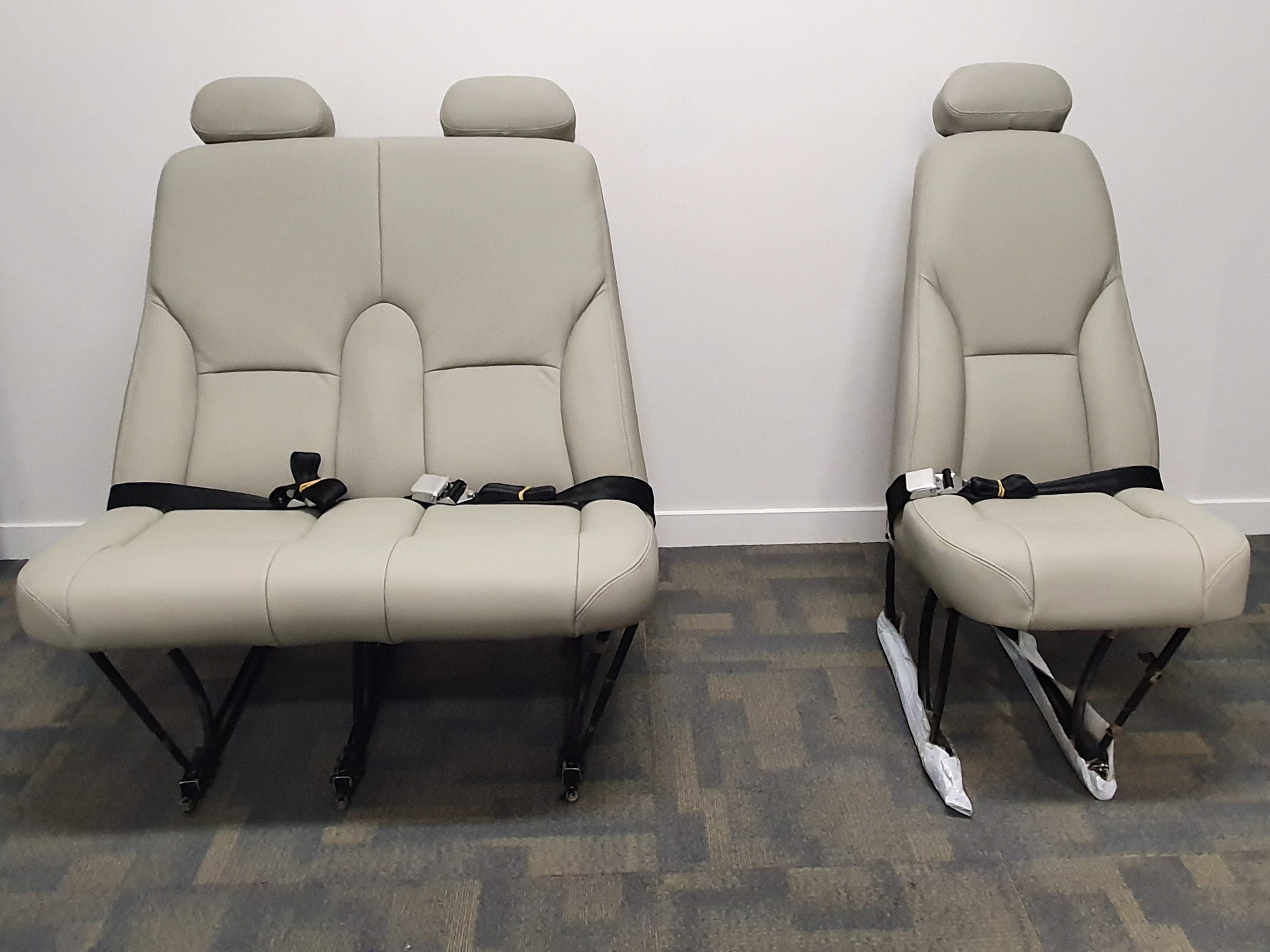 The passenger seat upholstery was also completed in Portland Grey (JLS722) leather, featuring matching stitching and integrated leather headrests for a cohesive and professional finish. The passenger configuration includes an offset aisle layout—with single seats on one side and double seats on the other—providing optimal cabin flow.