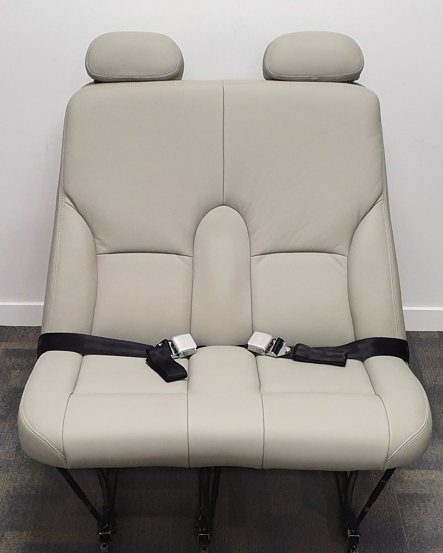 At the rear, a three-seater bench seat is securely mounted to the rear floor and bulkhead. The rear bulkhead panel itself was wrapped in a shell-coloured synthetic leather, complementing the clean, refined interior palette. -