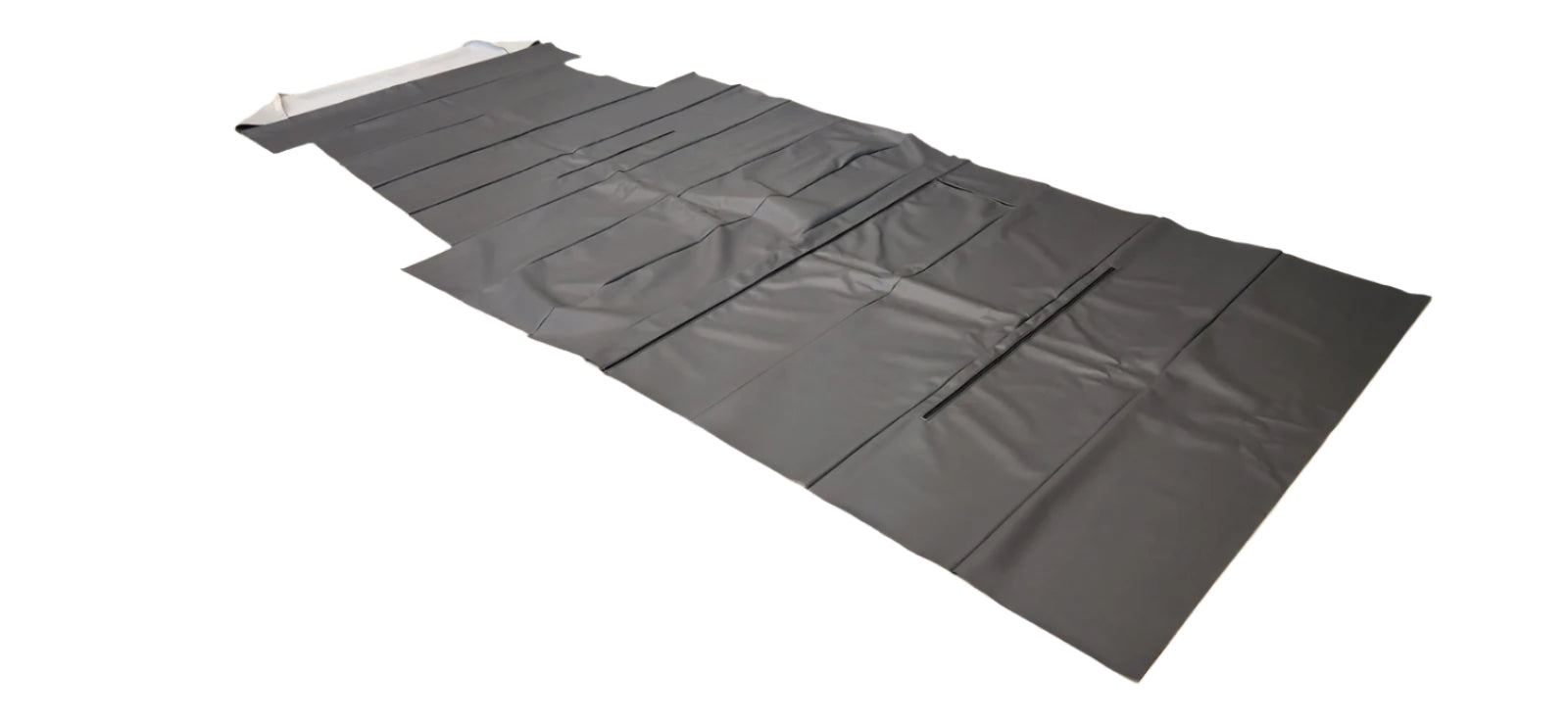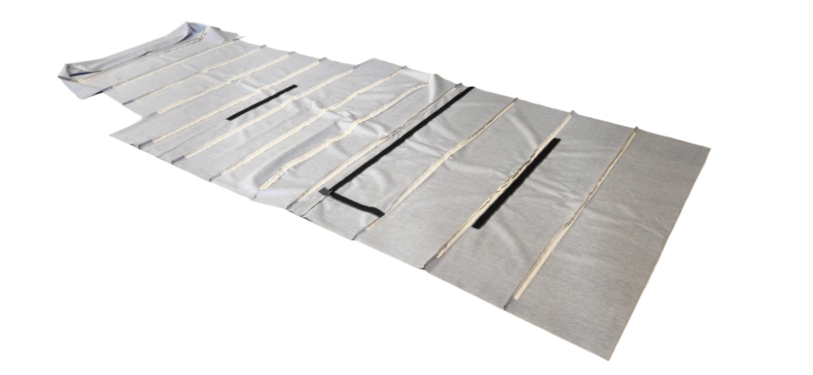 The vinyl headlining was manufactured in charcoal grey, offering a clean, low-reflective finish suited for high-performance interiors. This ribbed headliner allowed us to reuse the existing aircraft struts, which were threaded through fabric loops sewn along the seams. The headliner also featured three zippered maintenance access panels, offering technicians easy access to the aircraft ceiling without requiring full removal of the paneling.