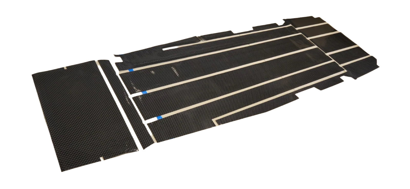 The flooring kits were crafted from Genflor MW-200 Black Moonwalk, a heavy-duty aviation carpet designed for durability and grip. Each floor mat was CNC laser-cut to ensure precise fitment, especially around custom seat track cutouts for the skydiving bench seats. For added convenience and security, the flooring was backed with self-adhesive Velcro, allowing for easy installation and removal during routine maintenance.