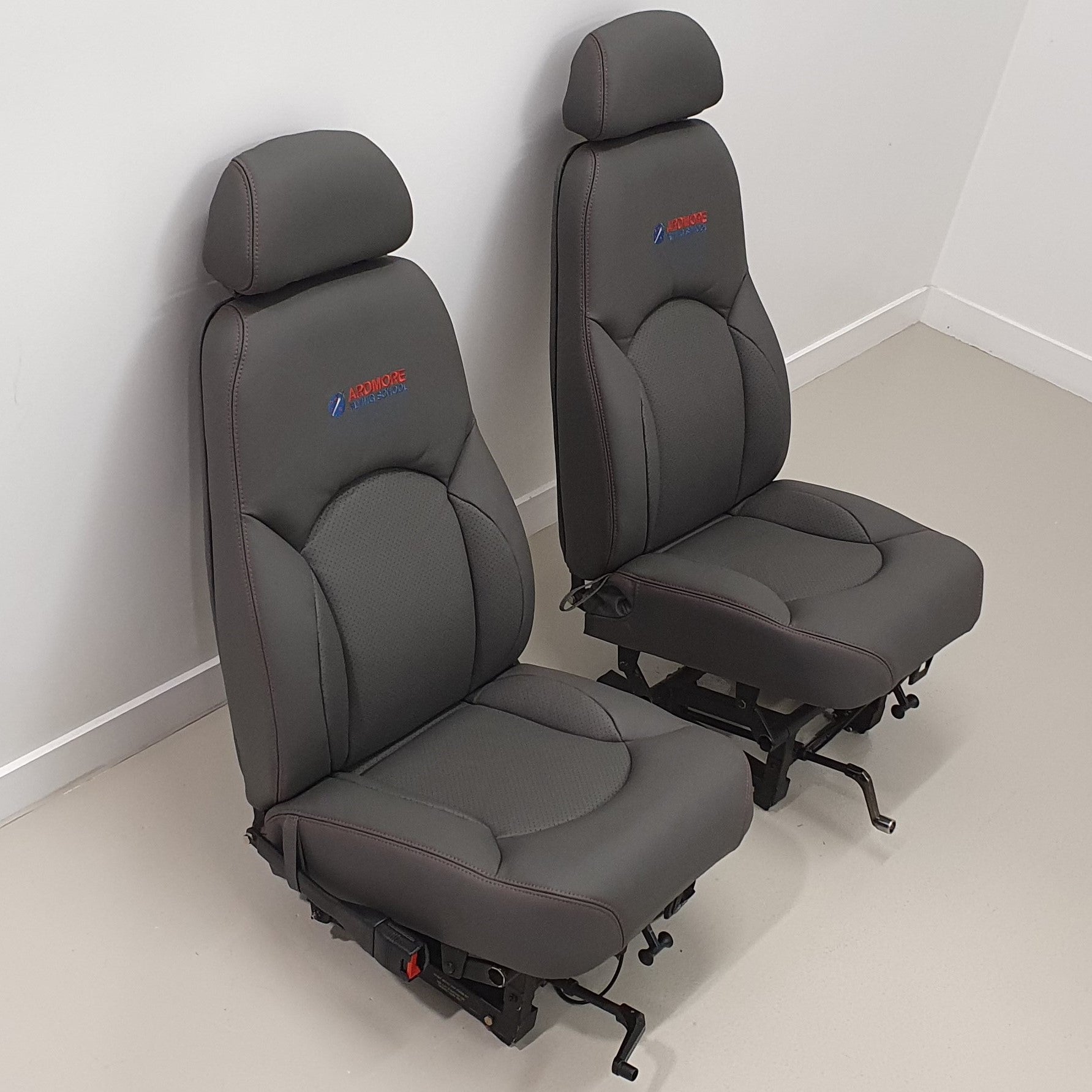 Seats were crafted from charcoal aviation leather and styled to match the flying school’s colours, making the interior not only functional but also visually aligned with the school’s branding.