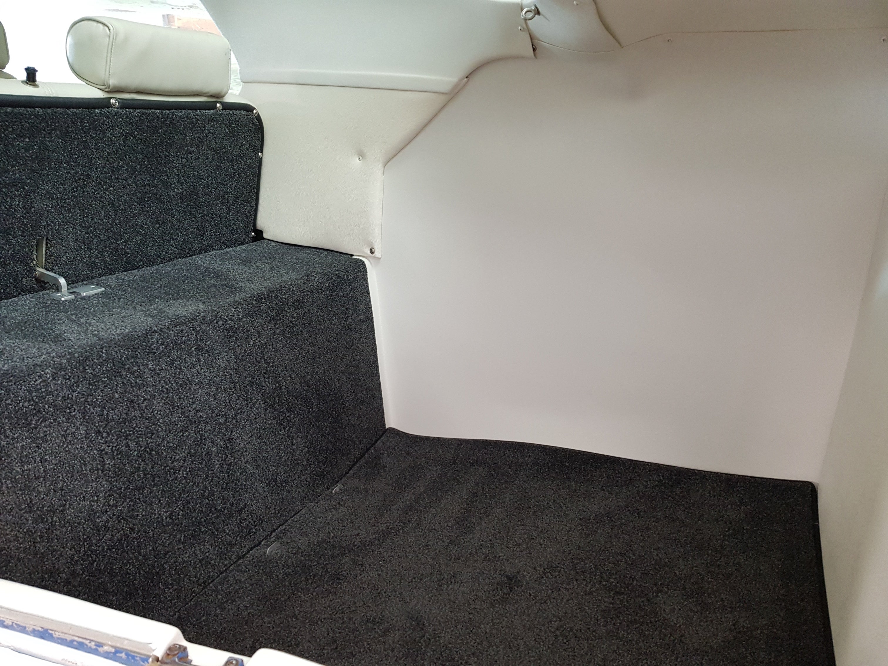 The flooring was crafted from durable Zimmer dark grey nylon carpet, which extends partially up the lower sidewalls, blending seamlessly with the leather finishes.