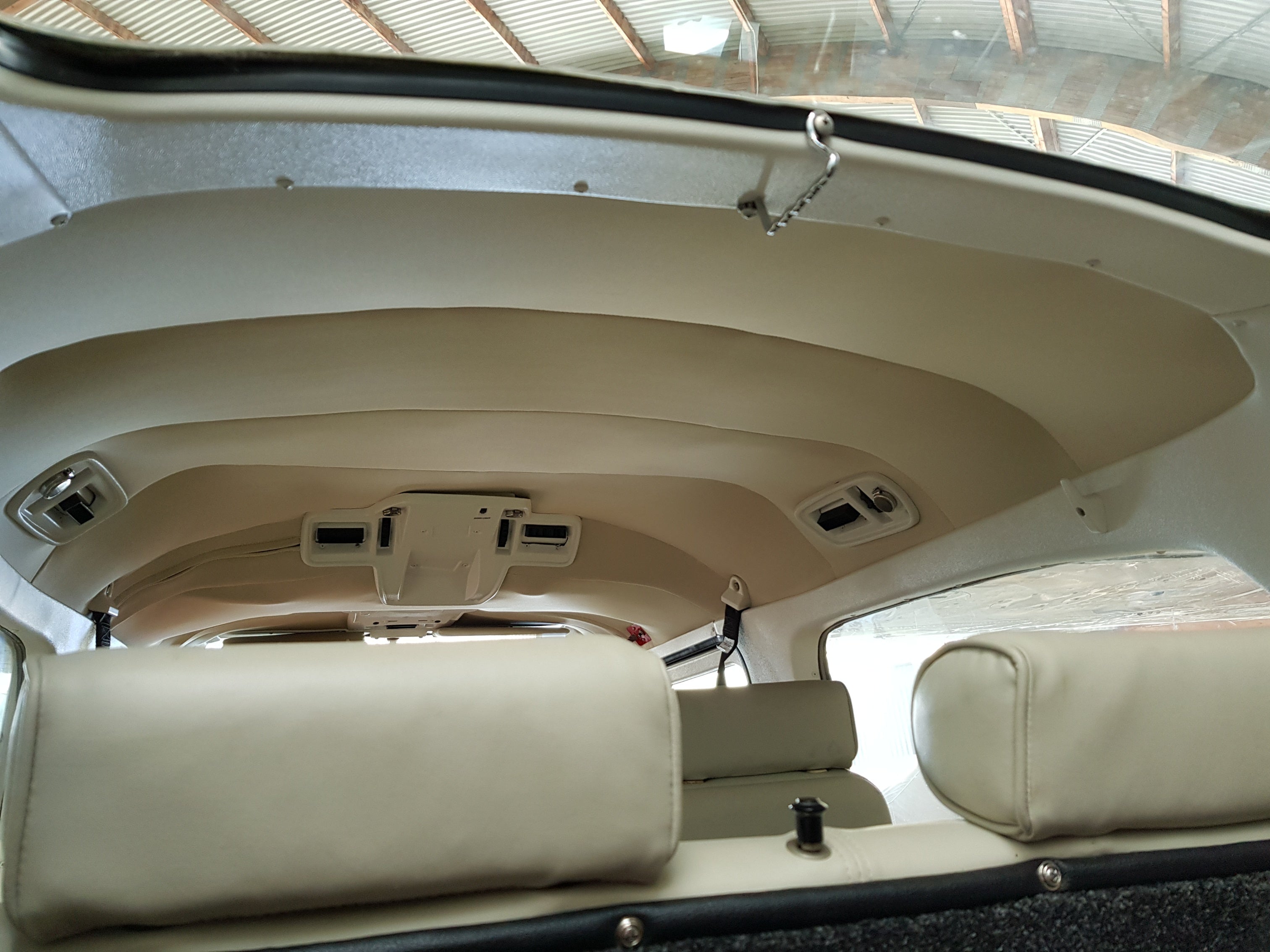 With the original seats retained, it was essential to create a cohesive look. The upper trim plastics were carefully wrapped in Shell-coloured synthetic leather to match the existing seat tone, ensuring visual harmony throughout the cabin. -