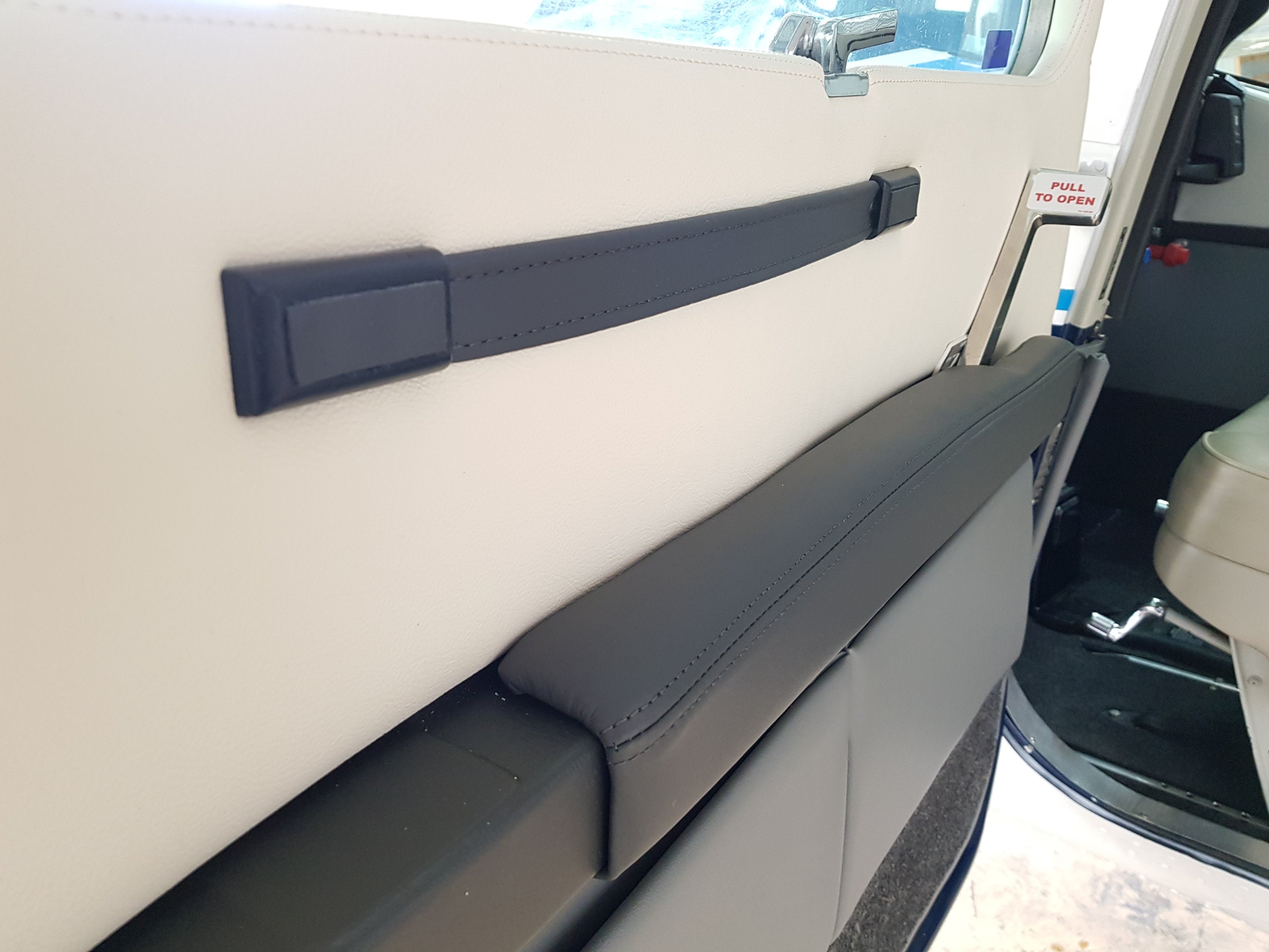 A striking Anthracite grey strip runs below the upper trim, complemented by aviation leather armrests stitched in a matching thread. The same materials and stitching were used on the pull handles, positioned above the armrests for added functionality and a refined finish. The lower sidewalls feature Athena mid-grey synthetic leather, adding depth and contrast to the overall scheme. -