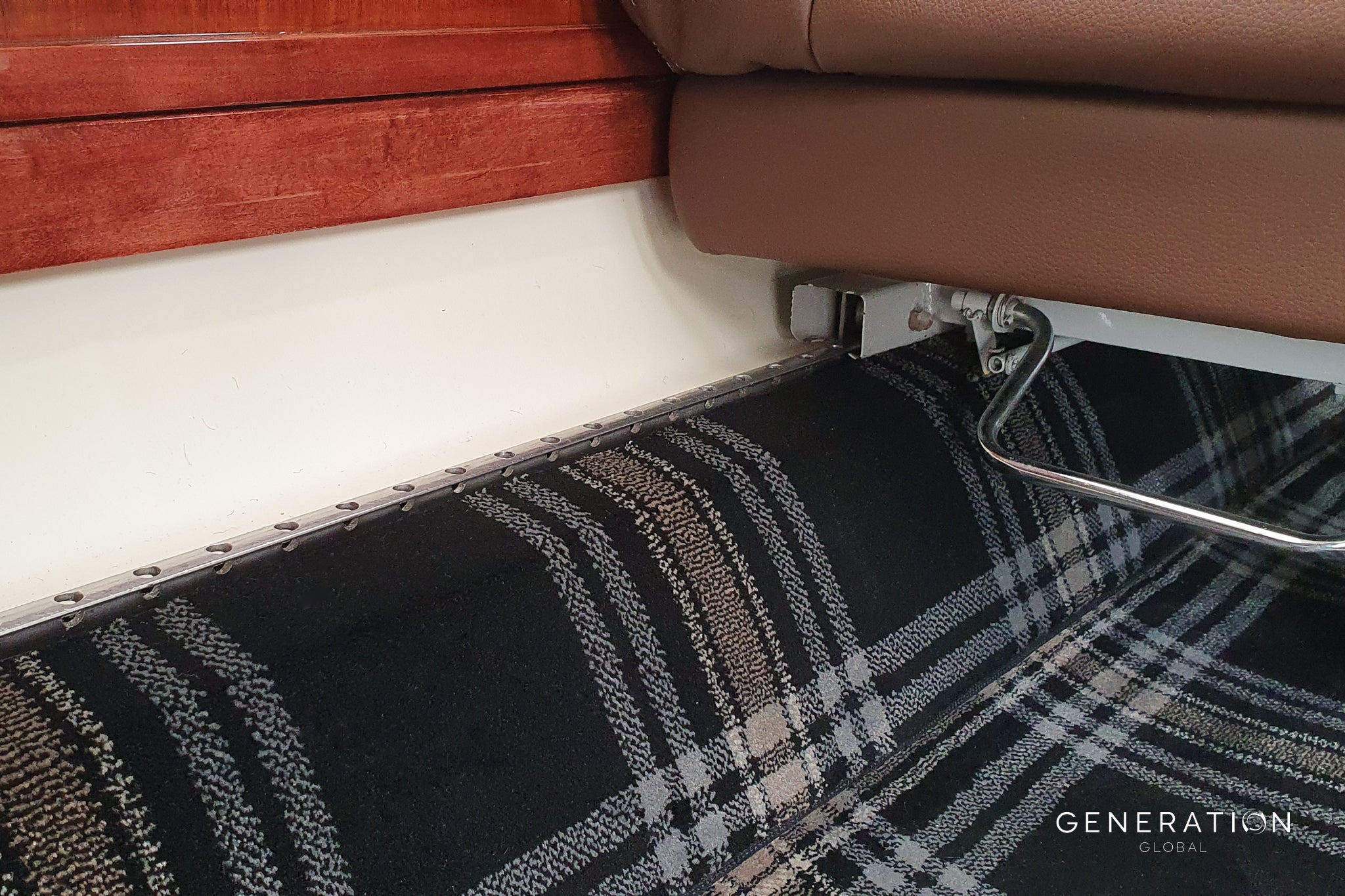The black and white tartan carpet, chosen by our discerning client, exudes a timeless, traditional charm. We worked with our client to incorporate this carpet and design to reflect their Scottish heritage. Paired with nougat brown seats featuring cross-stitching, the result is an interior that radiates warmth and sophistication. This project showcases our ability to seamlessly integrate client-provided materials into a cohesive and stunning design.