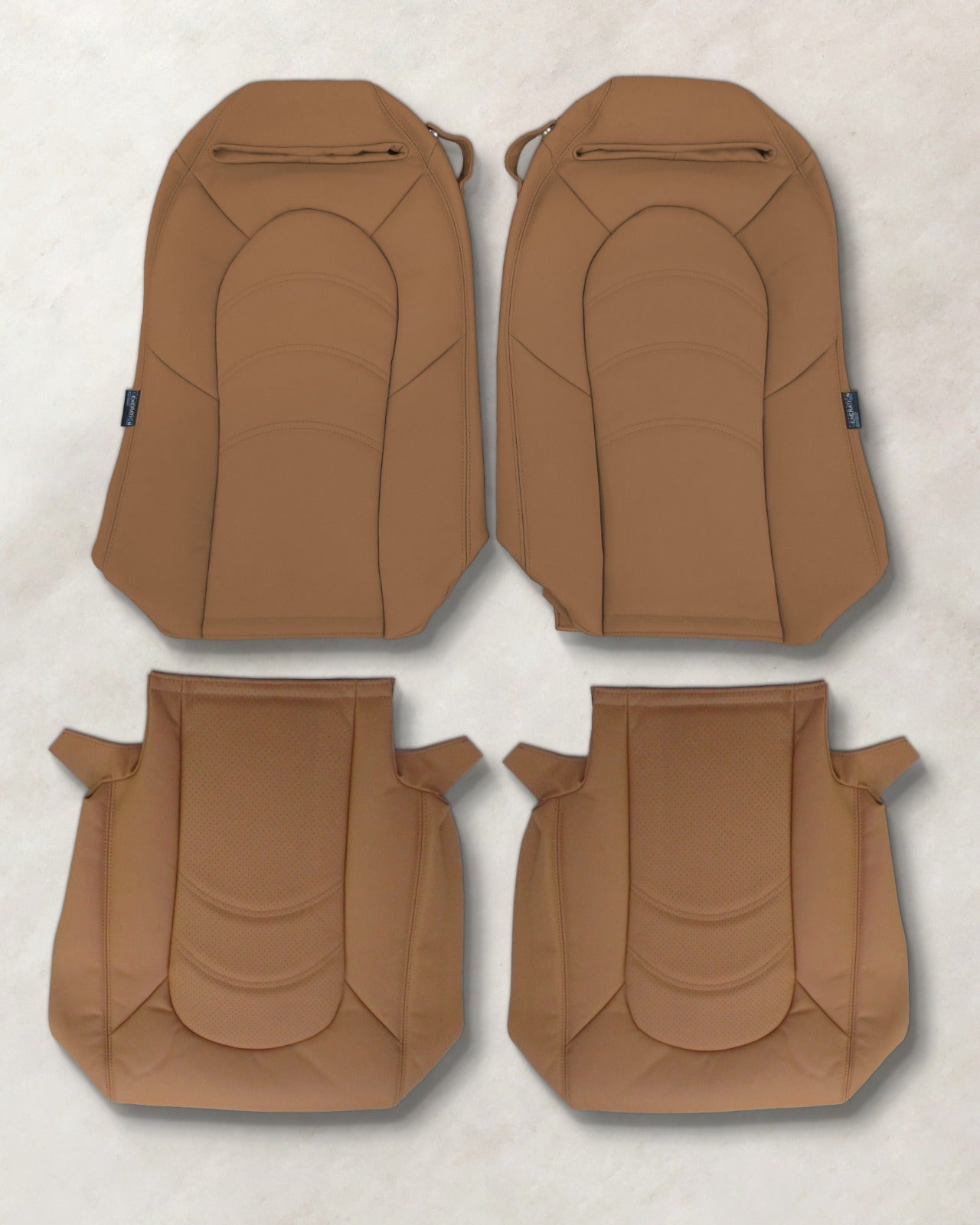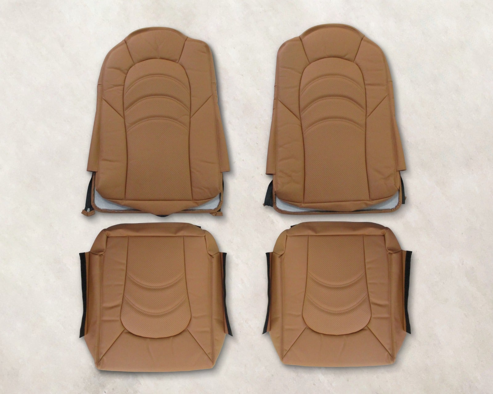 The seat covers were crafted from Brown Nappa leather (ADI-4104), providing a rich and luxurious feel to the aircraftβs interior. The leather faces of the seat covers were perforated (SP-1) in the scalloped insert areas, allowing for better breathability and a premium finish. The covers were also highlighted with decorative black double stitching on the outer seams, as well as on the scalloped lines of the inserts, enhancing their visual appeal.