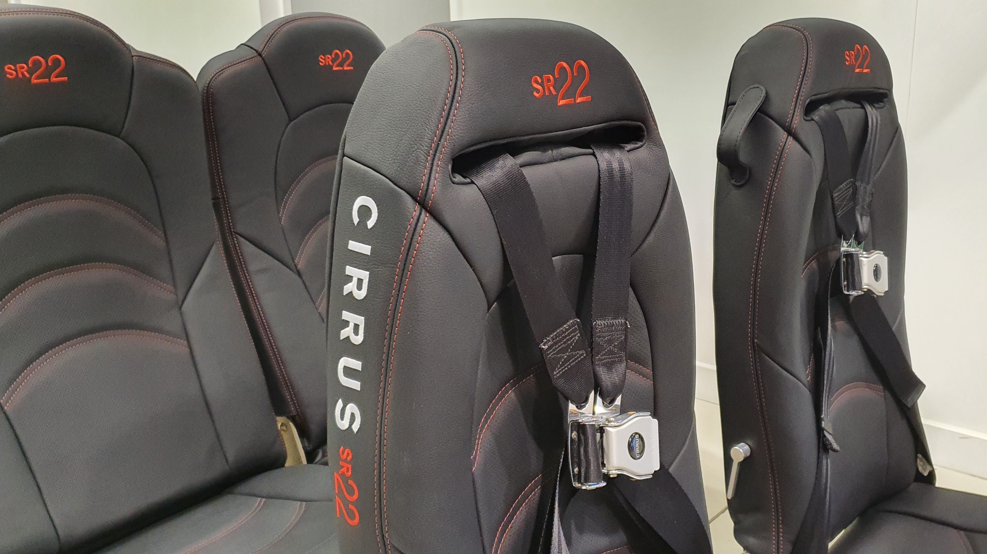 Each headrest includes a Cirrus logo embroidered in red, while the side bolsters display a dual white and red logo embroidery on both outboard seat backs.