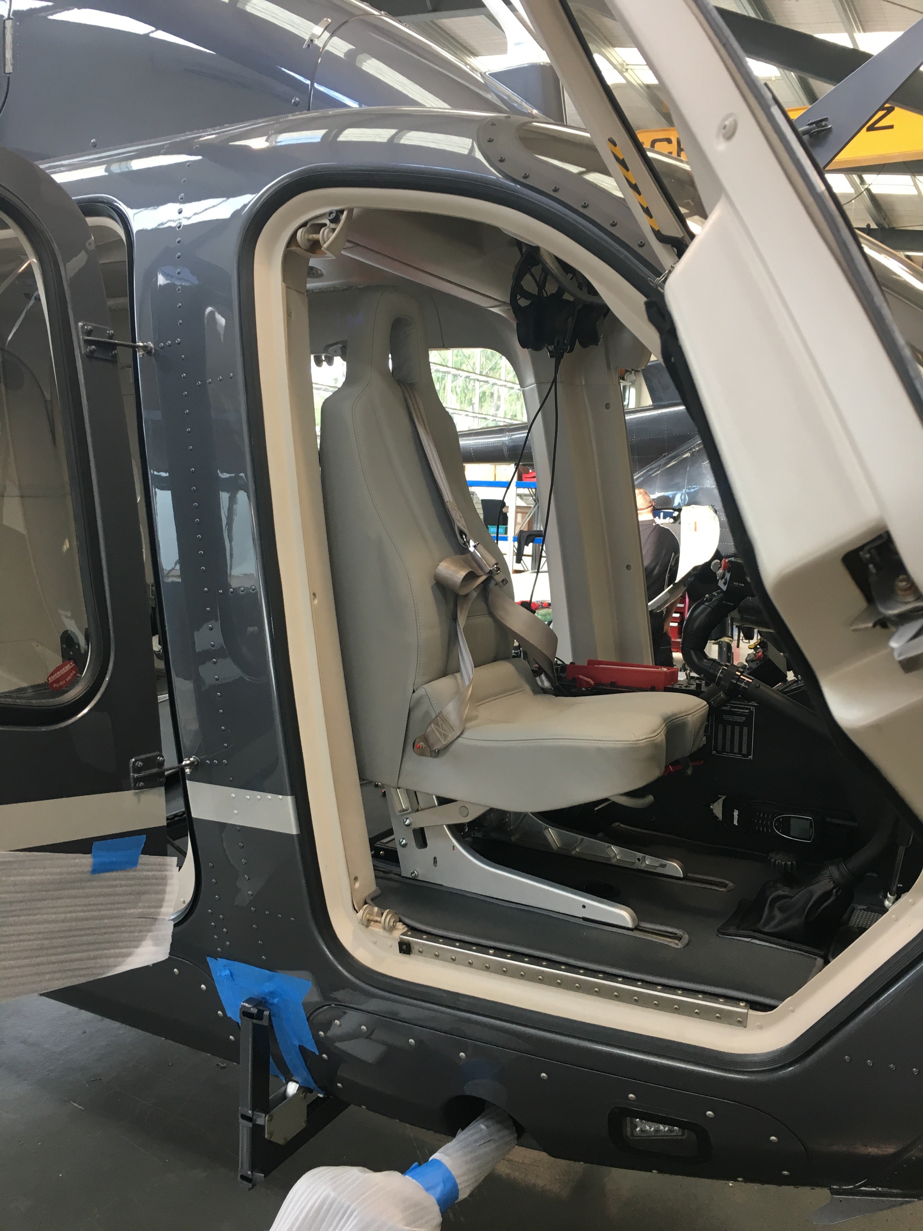 The seat upholstery was crafted from Dakota Alpaca Grey (JLS719) aviation leather, a color specifically chosen to complement the existing plastics and bulkhead colorings of the helicopter. This understated and elegant color blends seamlessly into the overall design, maintaining the sophisticated look desired by the client.