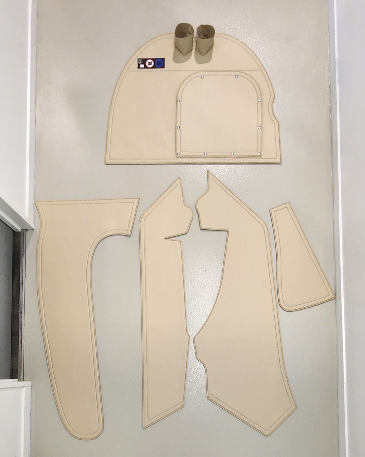 The trim panels cover both the upper and lower sidewalls of the cabin and are made from sand leather (ADI-4041) to match the seat covers. The panels feature decorative stitching around the edges, enhancing the overall aesthetic and creating a cohesive interior design.